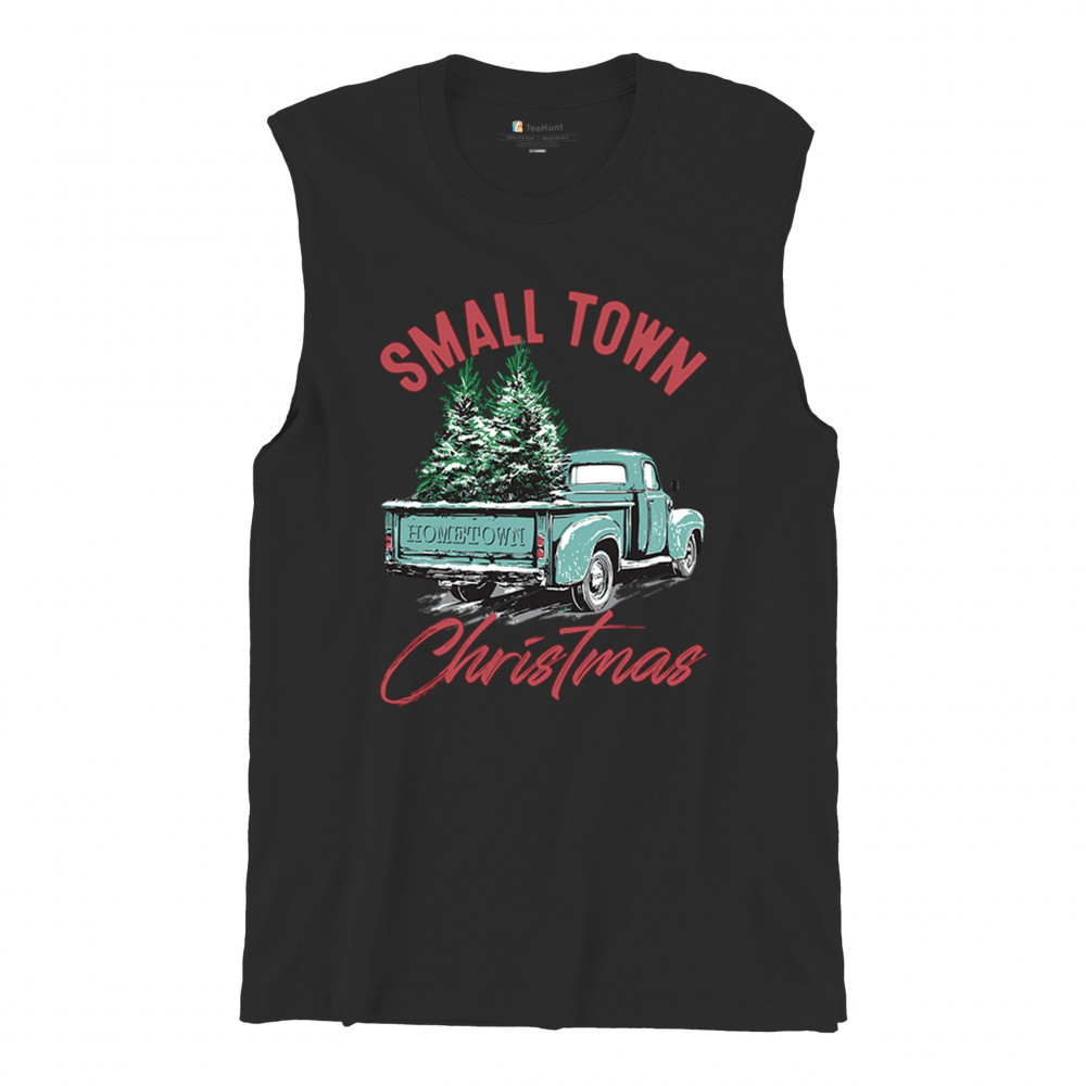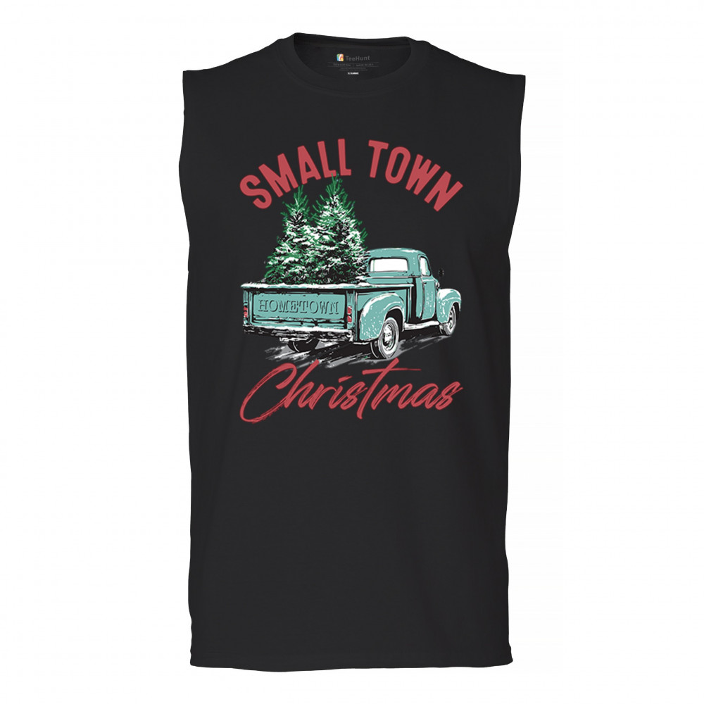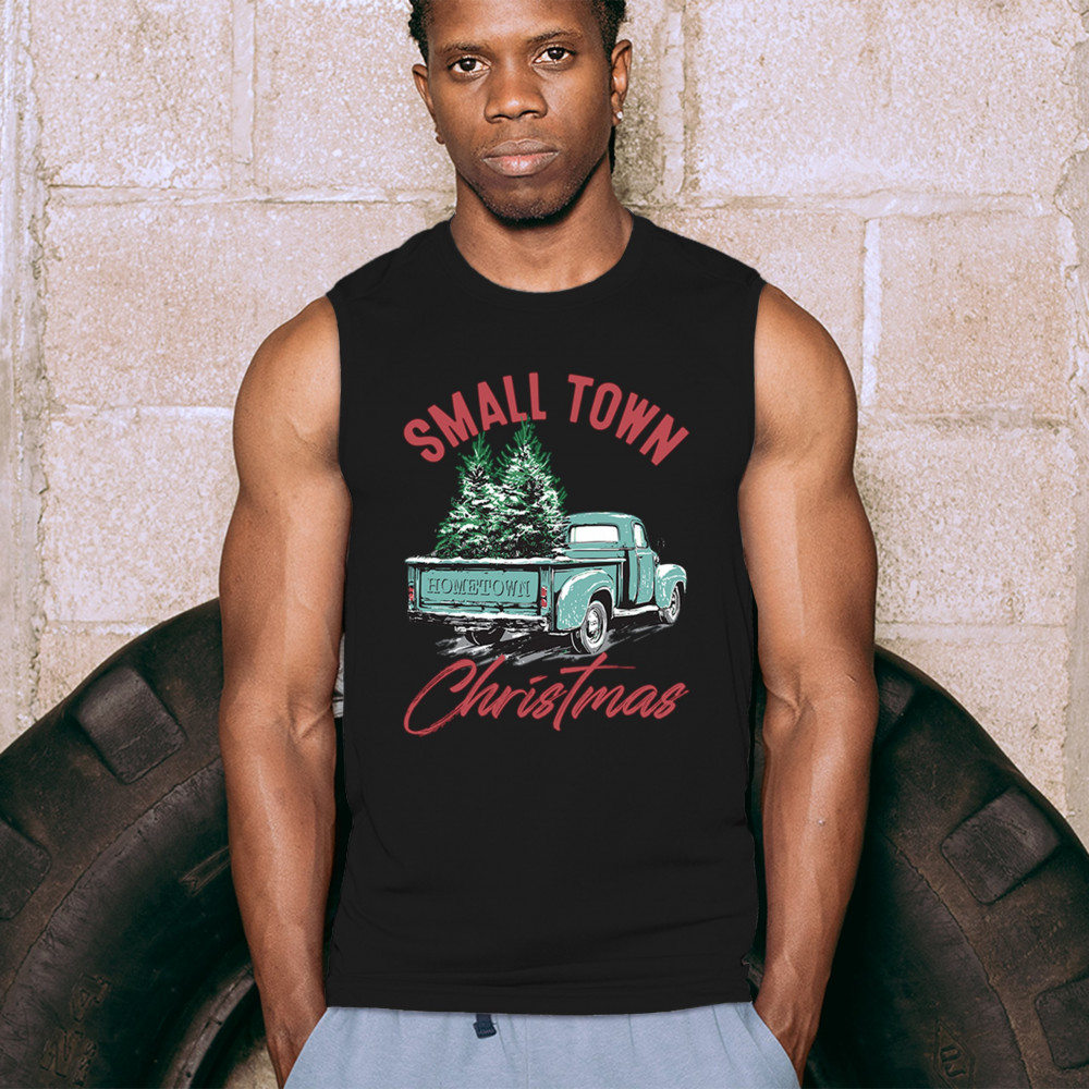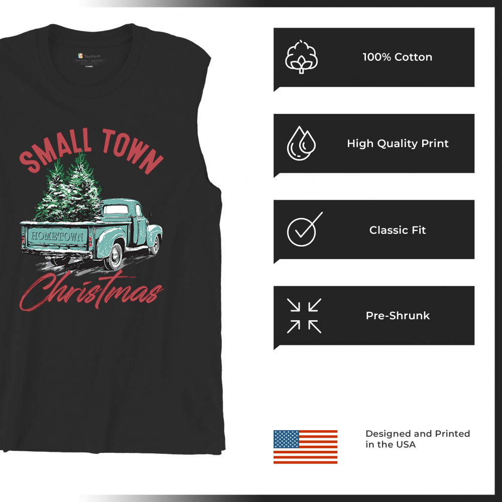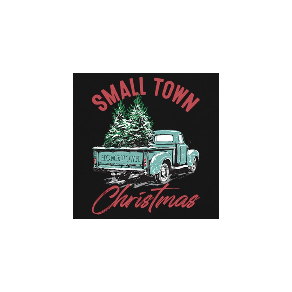 Embrace holiday nostalgia with this "Small Town Christmas" design featuring a vintage truck and Christmas trees. Perfect for rustic decor lovers.