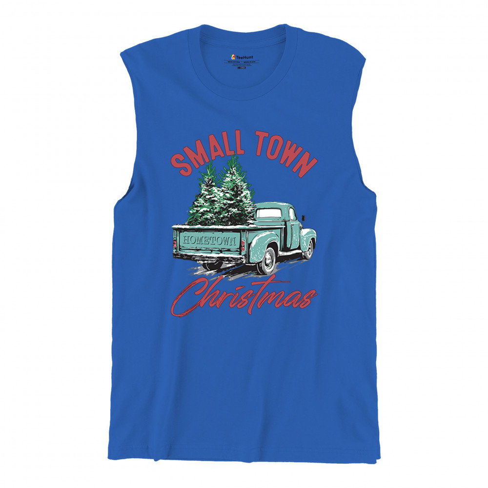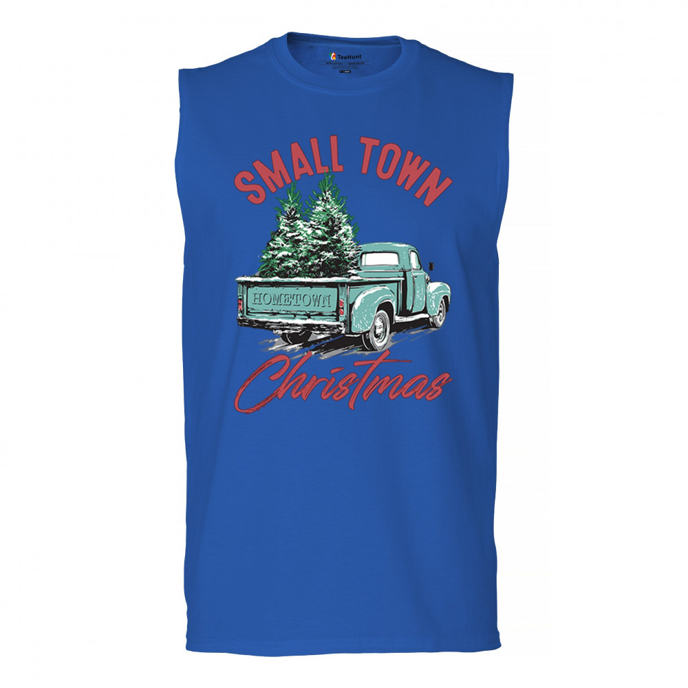 Embrace holiday nostalgia with this "Small Town Christmas" design featuring a vintage truck and Christmas trees. Perfect for rustic decor lovers.