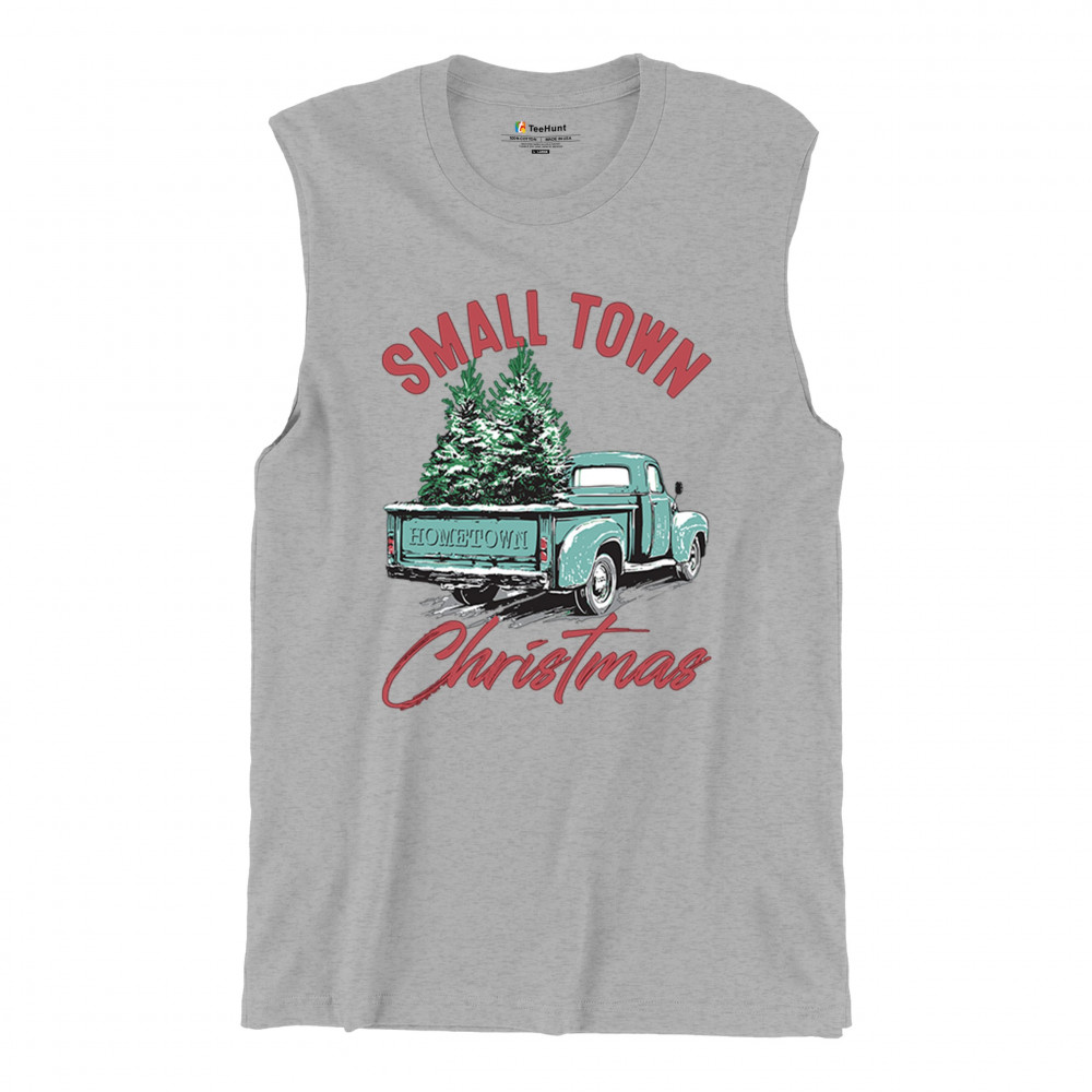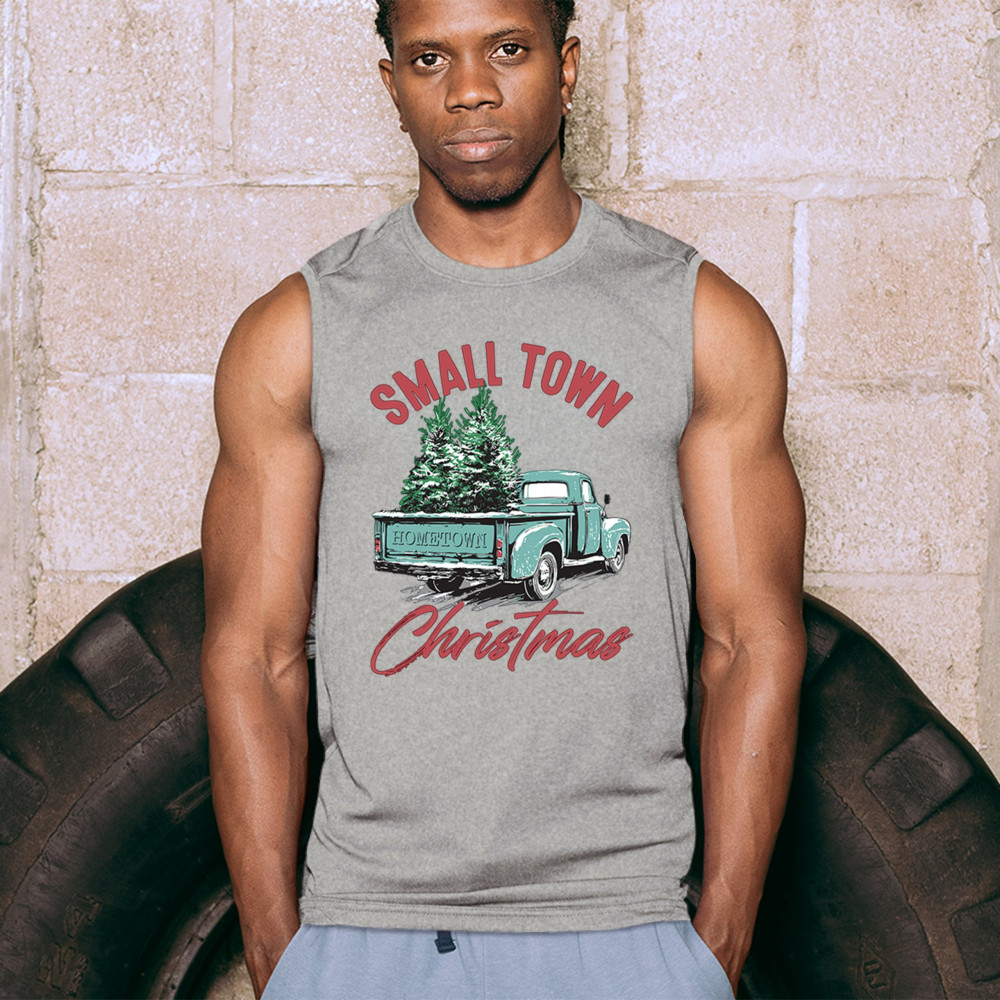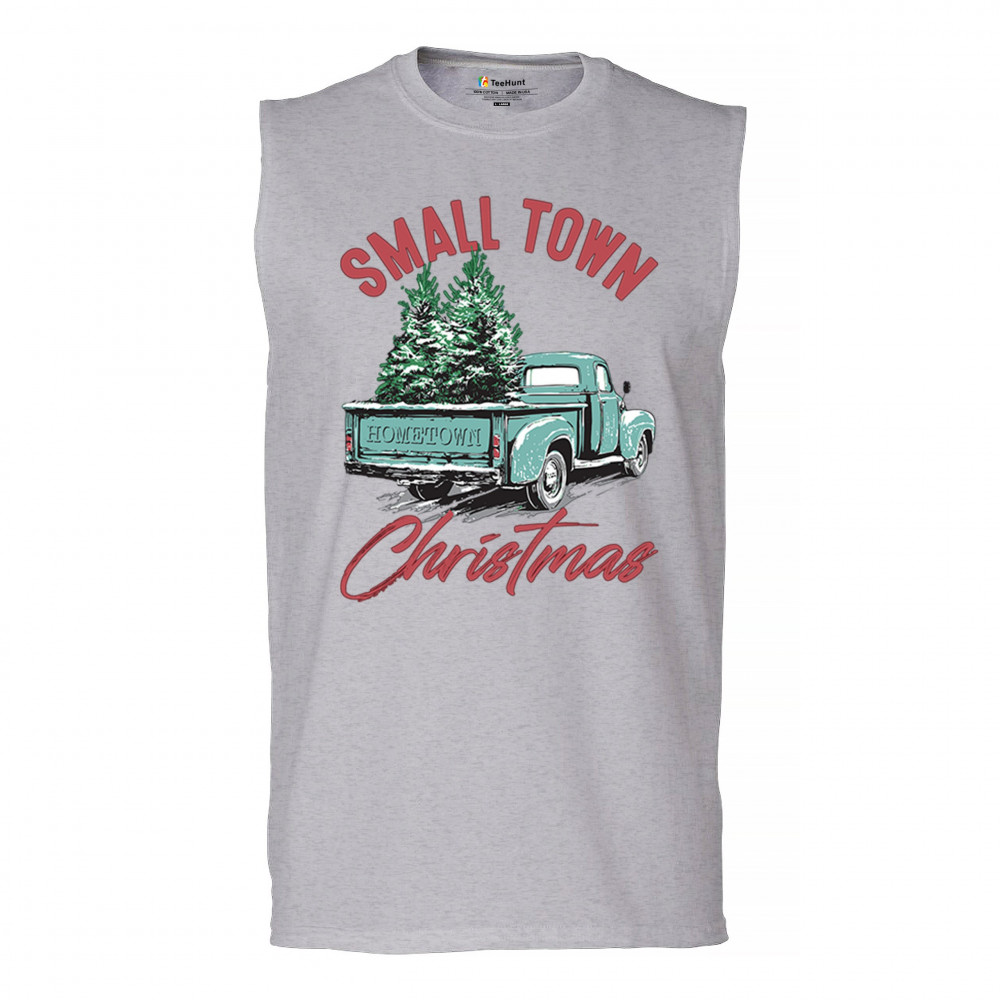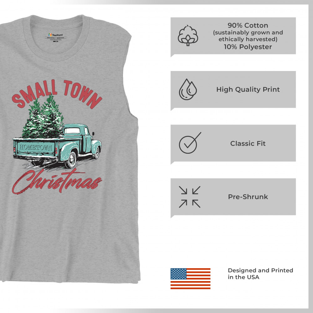 Embrace holiday nostalgia with this "Small Town Christmas" design featuring a vintage truck and Christmas trees. Perfect for rustic decor lovers.