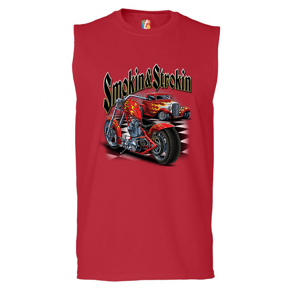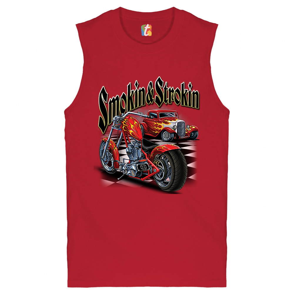A print featuring a hot rod and a chopper motorcycle standing on a chess board, both covered with flame paint jobs. The print says: "Smoking & Strokin". A great choice for a fan of customized American classic cars, hot rods and motorcycles.