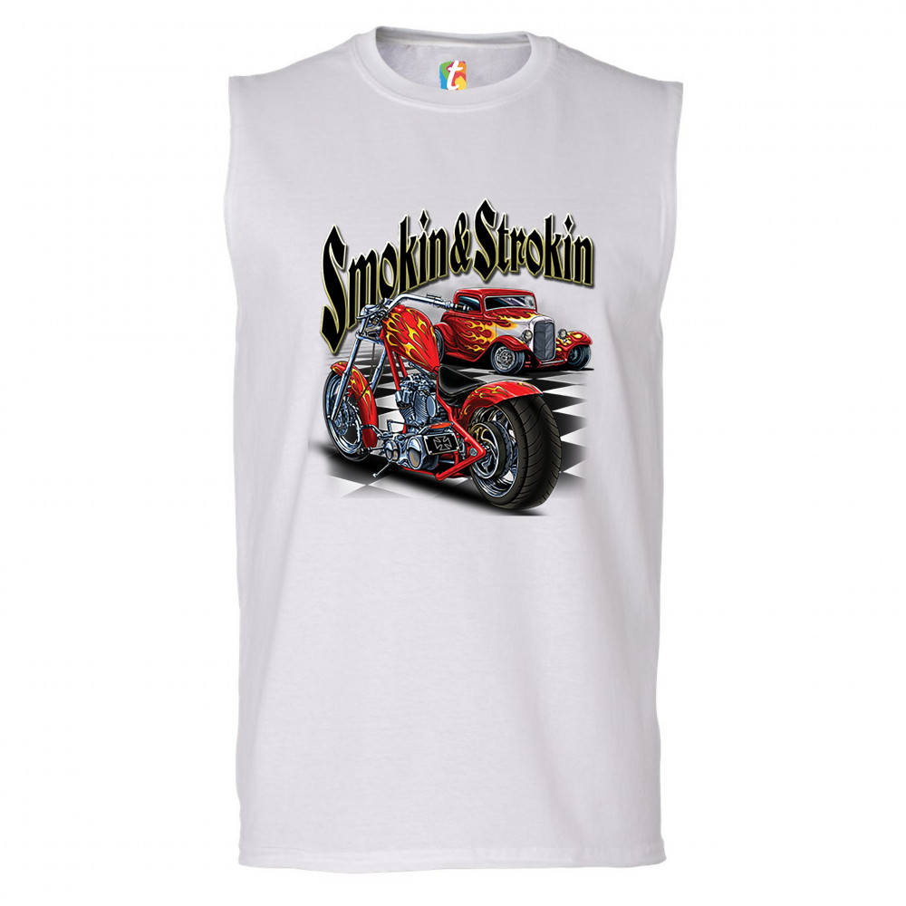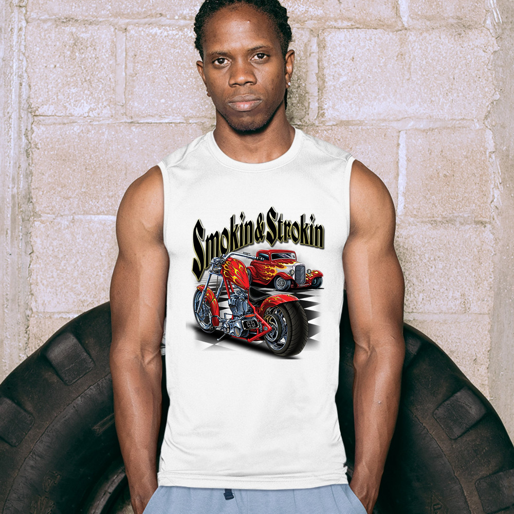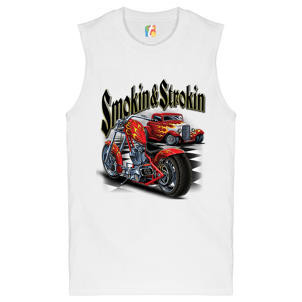 A print featuring a hot rod and a chopper motorcycle standing on a chess board, both covered with flame paint jobs. The print says: "Smoking & Strokin". A great choice for a fan of customized American classic cars, hot rods and motorcycles.