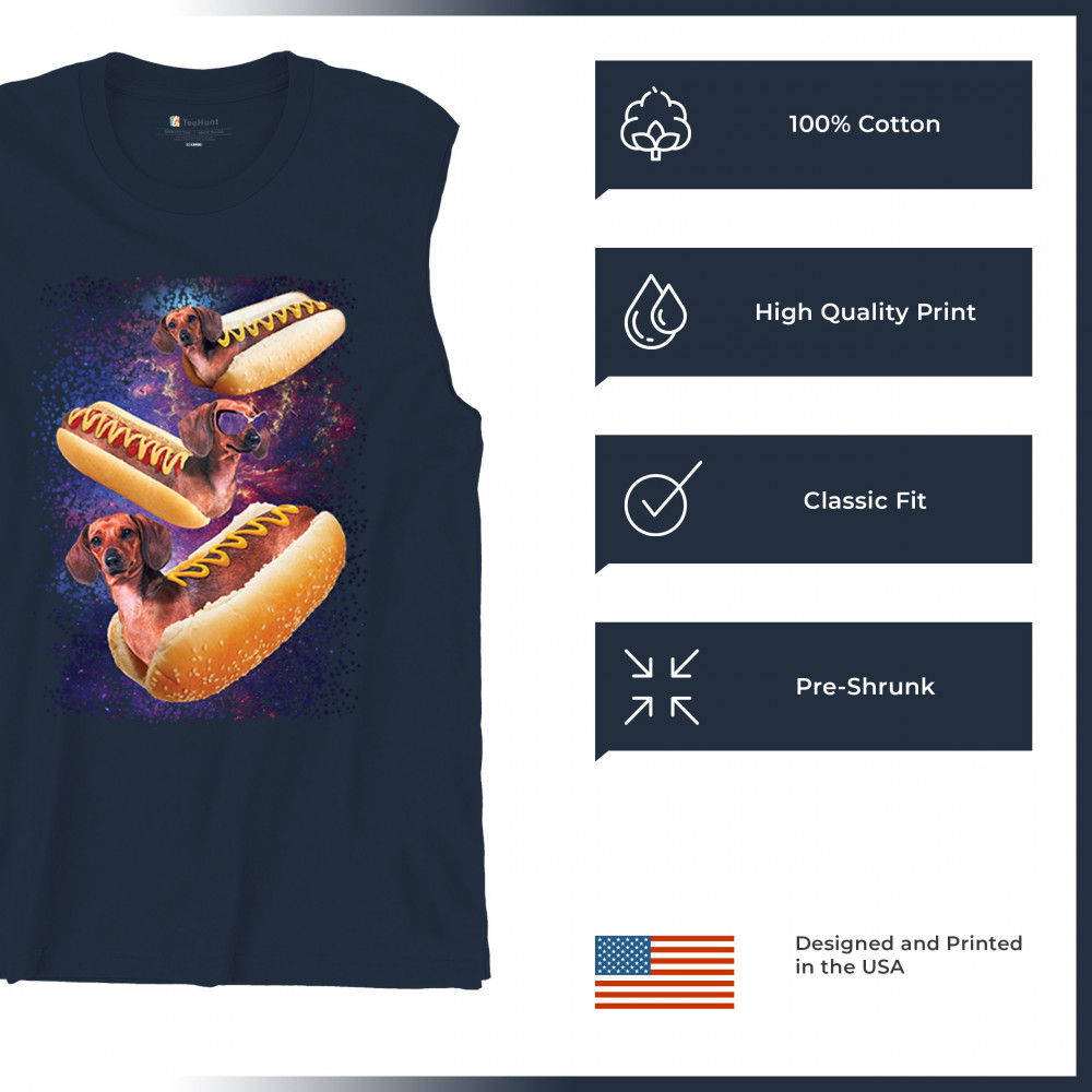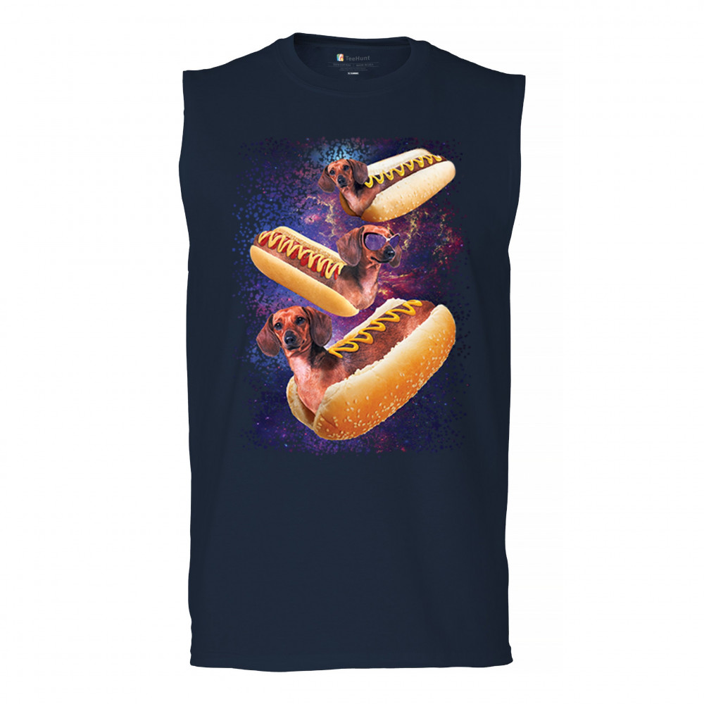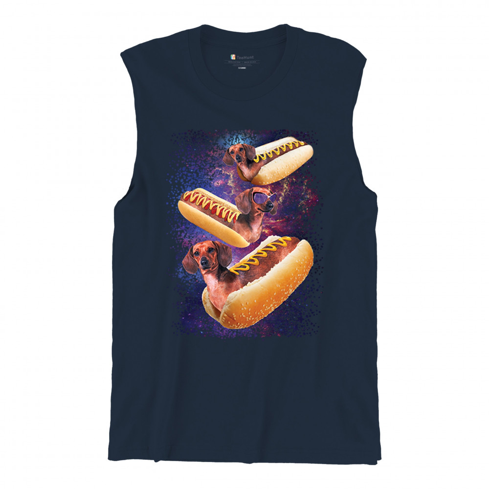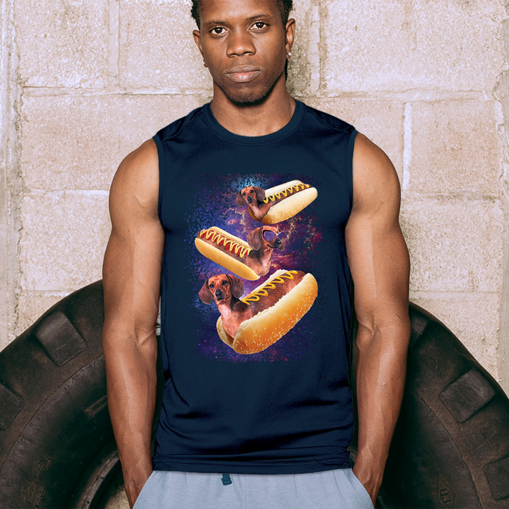 Quirky and fun tee featuring dachshunds as hotdogs in a cosmic setting. Perfect for dog and space lovers. Comfortable and durable.