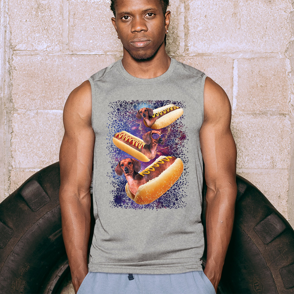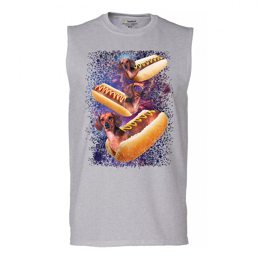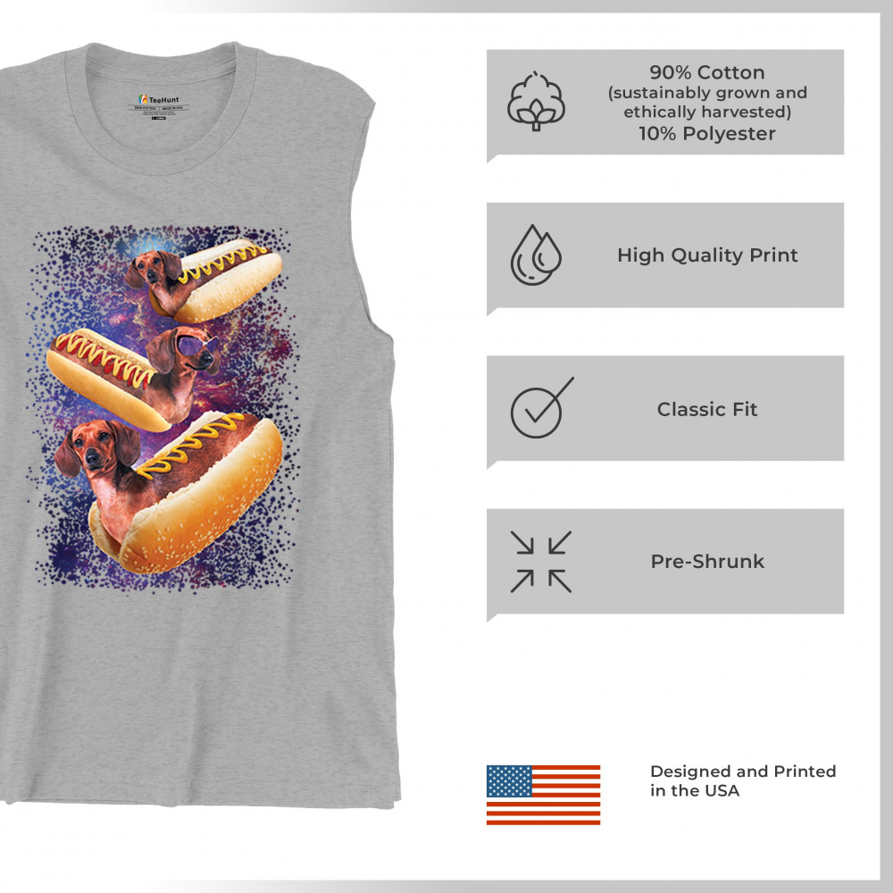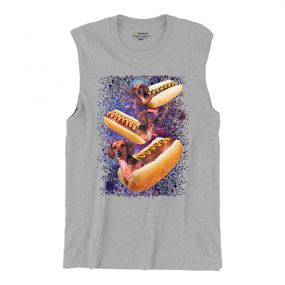 Quirky and fun tee featuring dachshunds as hotdogs in a cosmic setting. Perfect for dog and space lovers. Comfortable and durable.