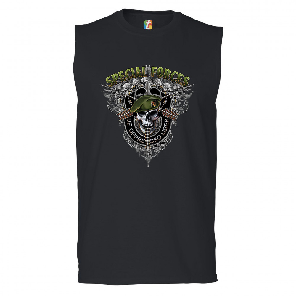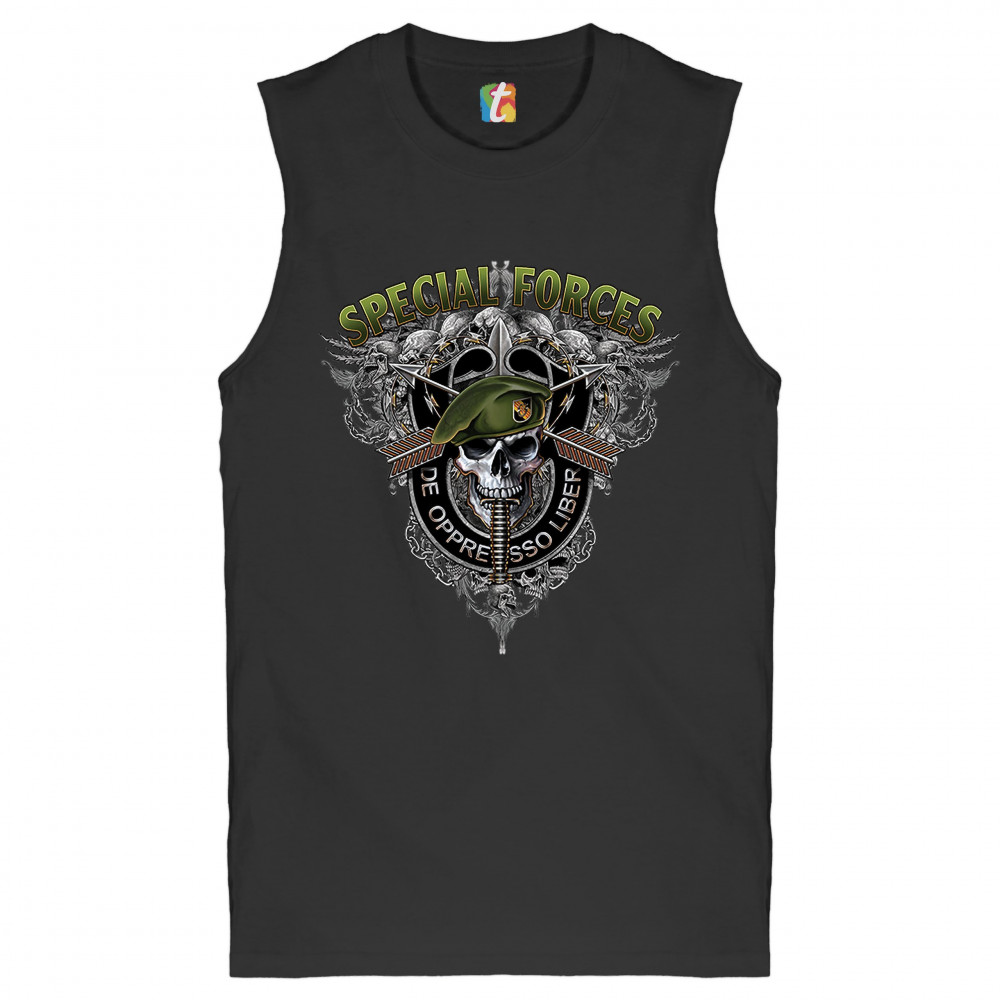 A patriotic print featuring a skull wearing a green beret with a dagger in it's mouth. At the top the print says: "Special Forces". Around the skull there is a black stripe with the special forces' slogan written on it: "de oppresso liber". In the backgro