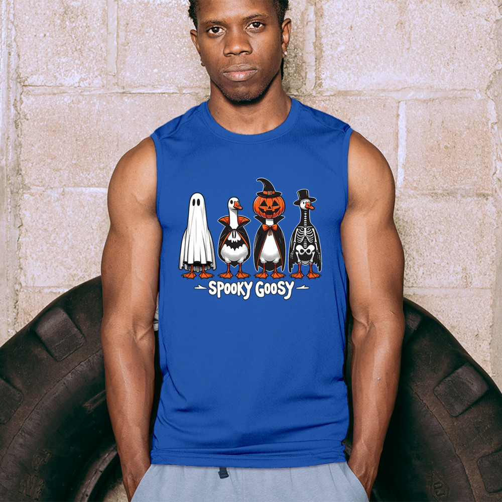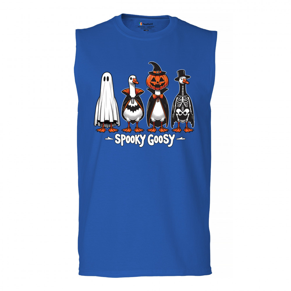 Spooky Goosy Halloween design with geese in witch, skeleton, vampire, and pumpkin costumes. Perfect for October 31, haunted house, and scary night fun.