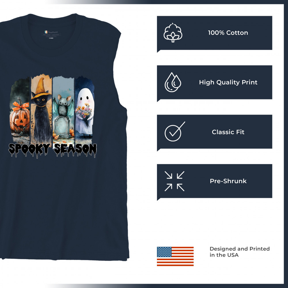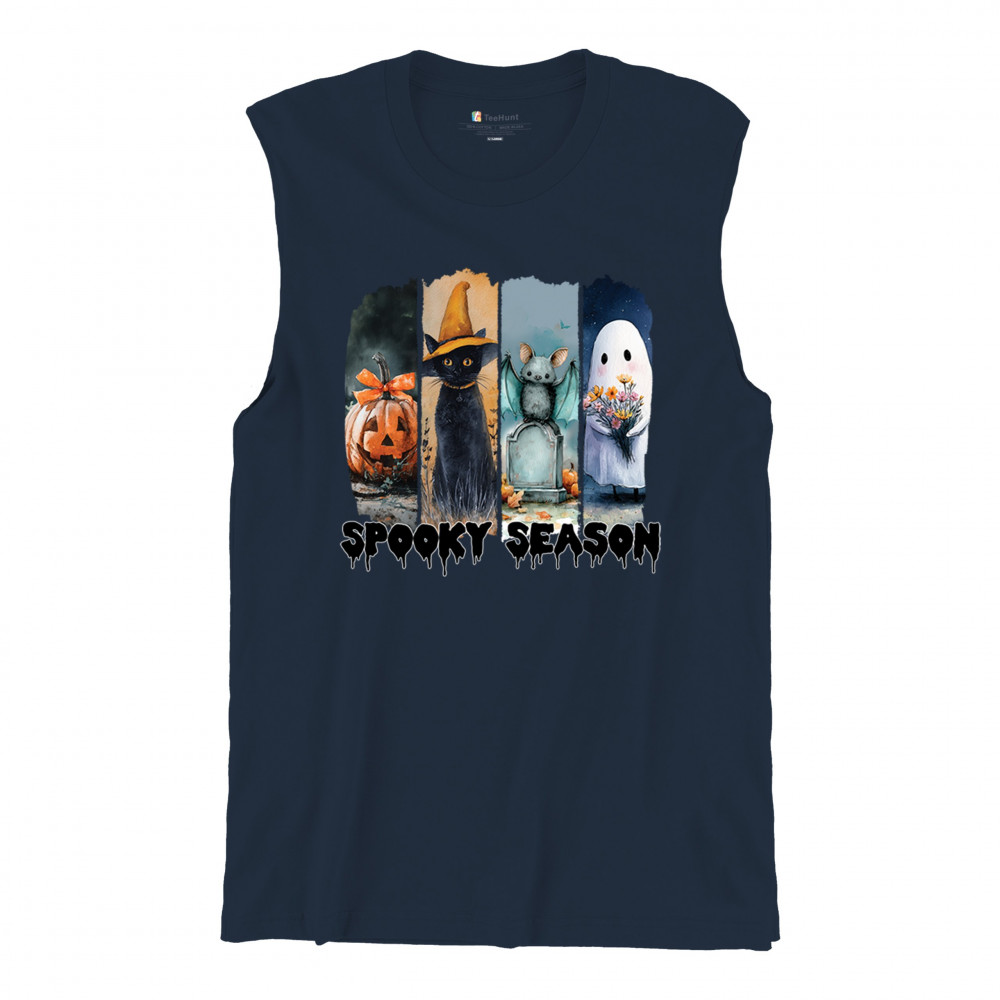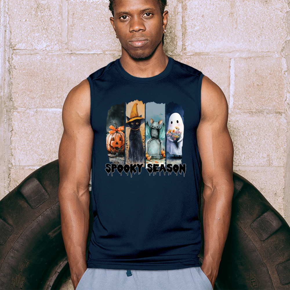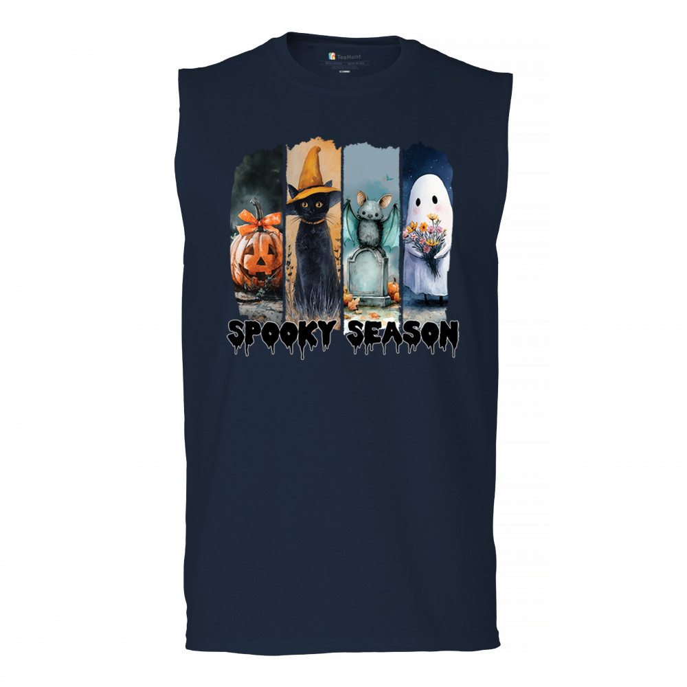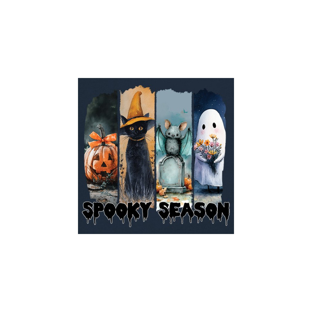 Spooky Season design with scary black cat, jack o lantern, haunted ghost house, and cute ghost. Perfect for October 31, trick or treat, and fall fun.