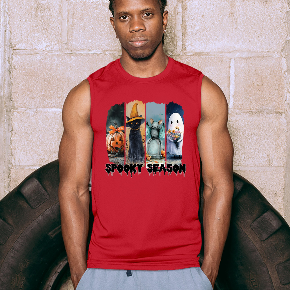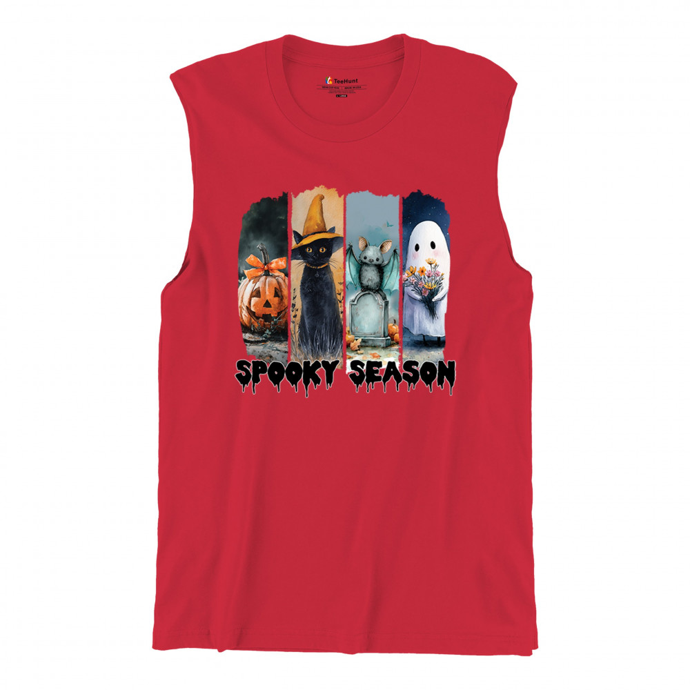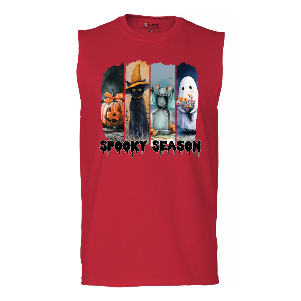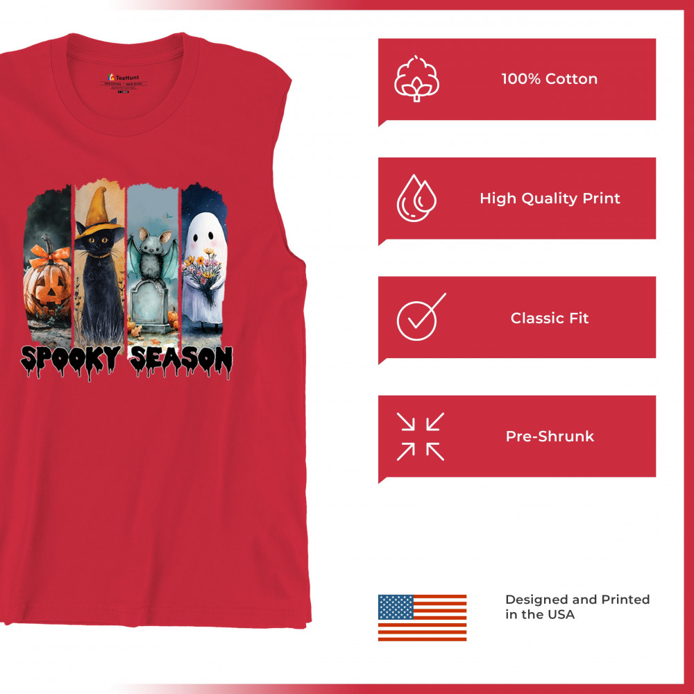 Spooky Season design with scary black cat, jack o lantern, haunted ghost house, and cute ghost. Perfect for October 31, trick or treat, and fall fun.