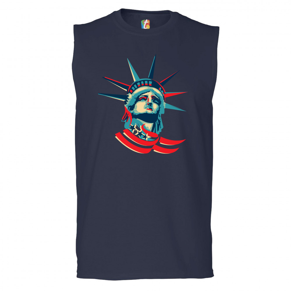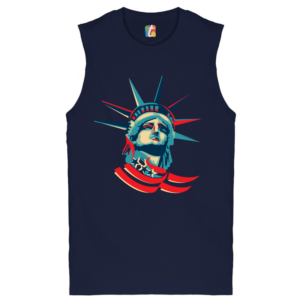 A patriotic print featuring a dripping silhouette of a bald eagle. The body is painted blue with lots of stars on it and the feathers of the wings, painted red, resemble the stripes of the American Flag. Over the wings there is a text written: "Land of the free home of the brave". Great choice to wear on Independence Day or any other patriotic holiday.