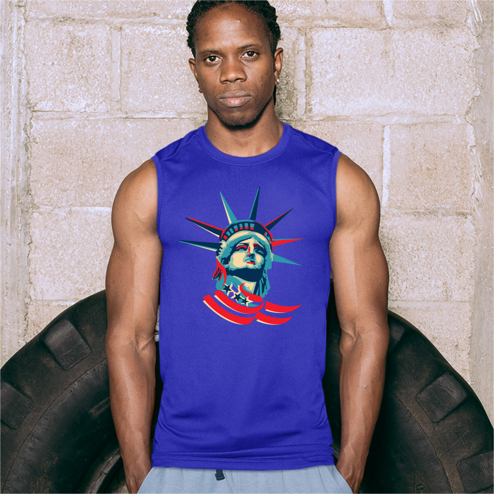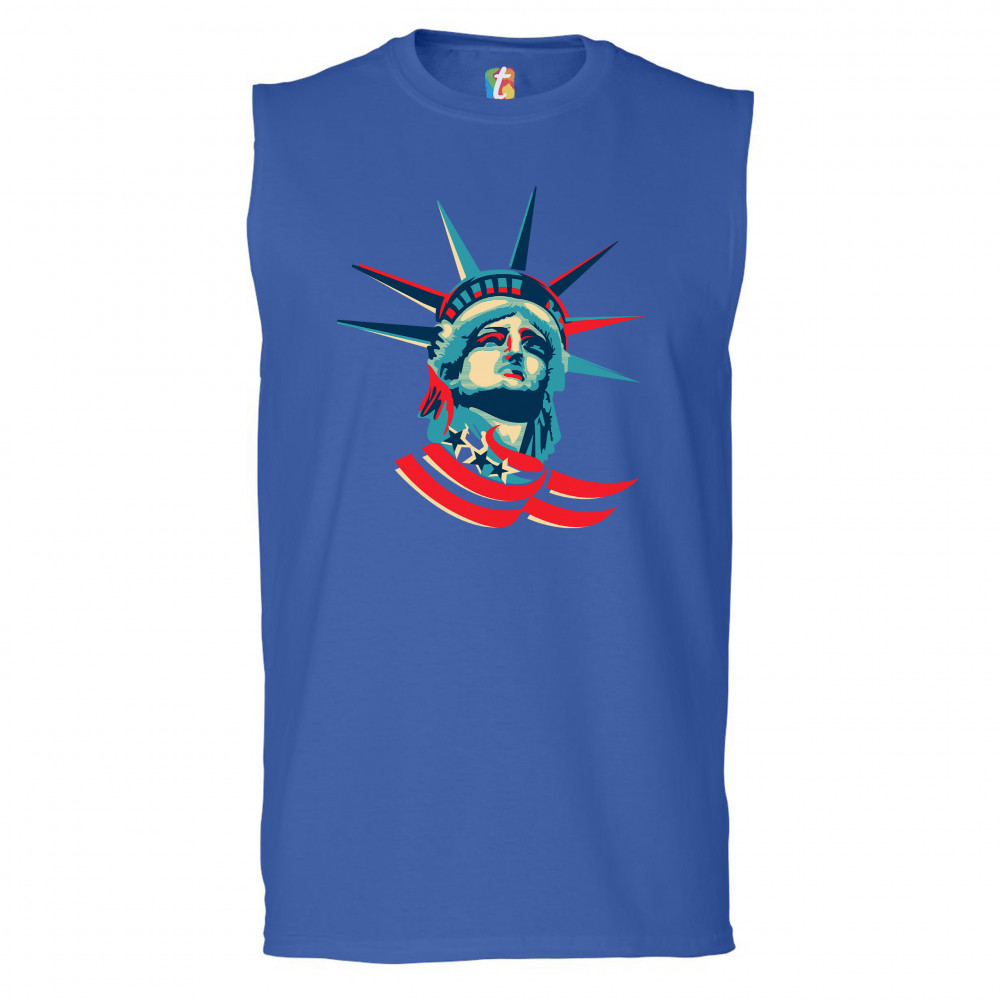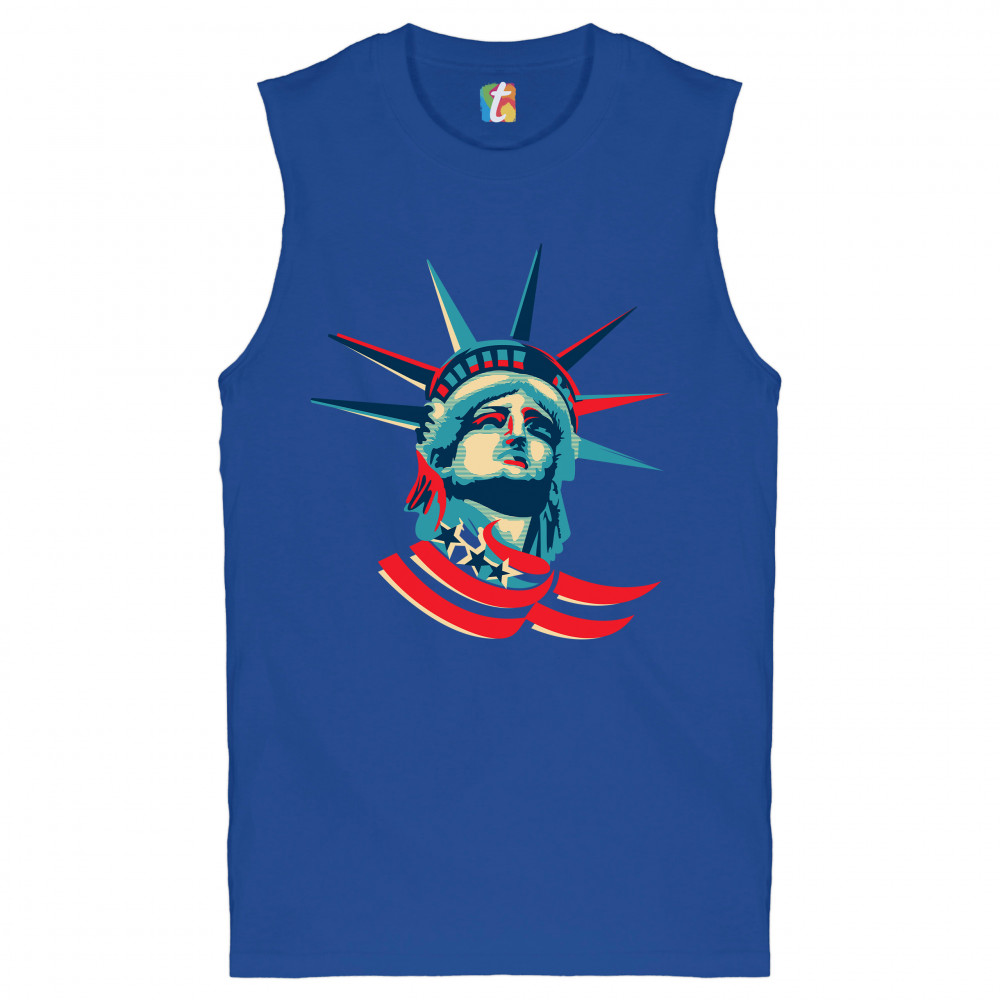 A patriotic print featuring a dripping silhouette of a bald eagle. The body is painted blue with lots of stars on it and the feathers of the wings, painted red, resemble the stripes of the American Flag. Over the wings there is a text written: "Land of the free home of the brave". Great choice to wear on Independence Day or any other patriotic holiday.
