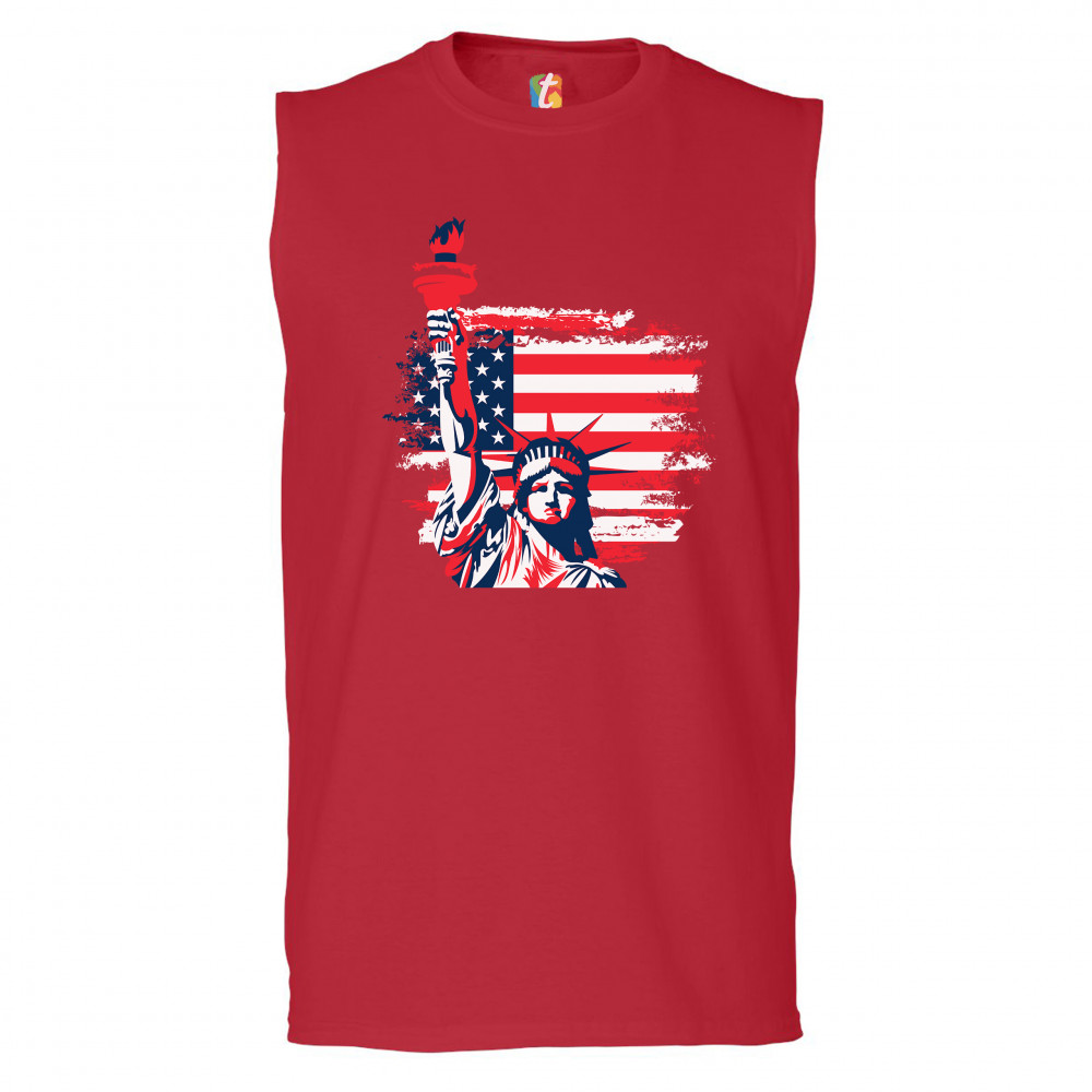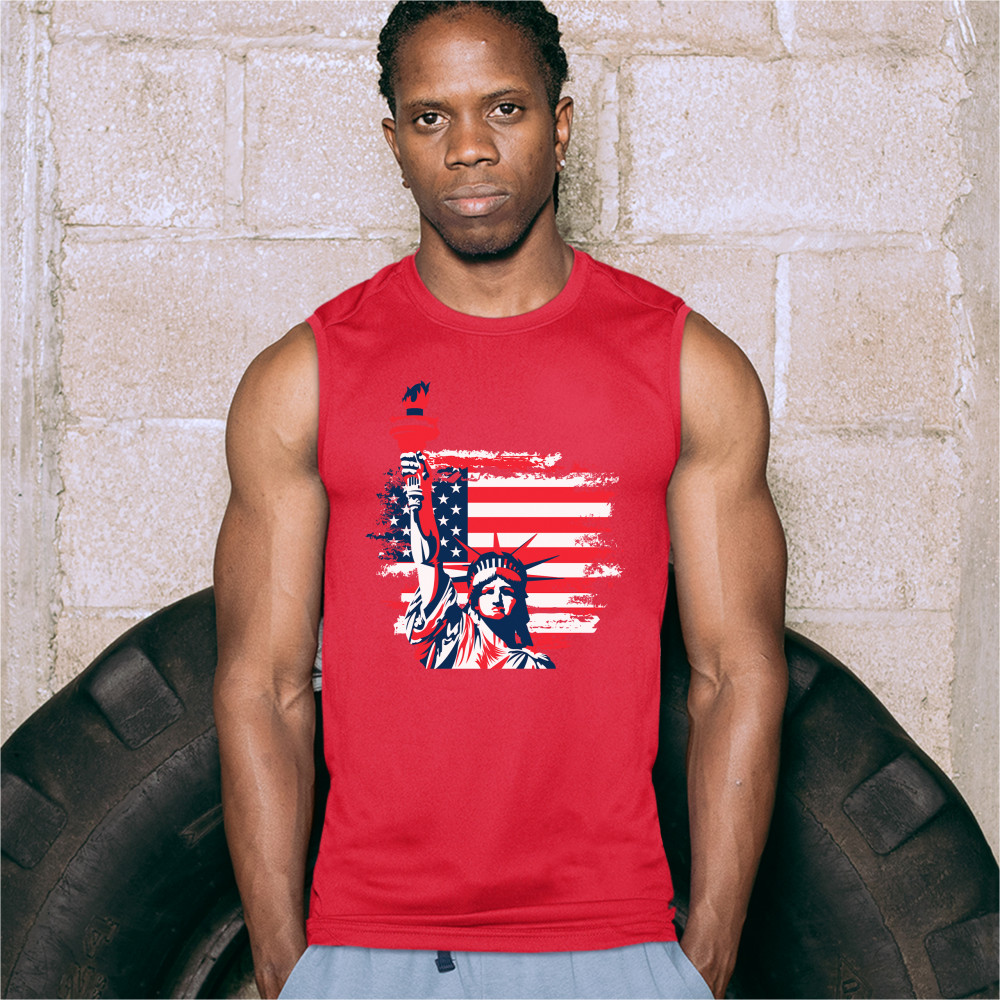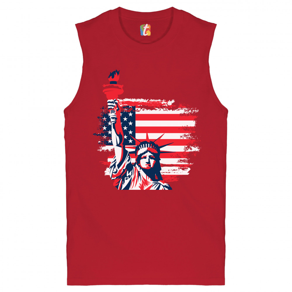 A patriotic print featuring a dripping silhouette of a bald eagle. The body is painted blue with lots of stars on it and the feathers of the wings, painted red, resemble the stripes of the American Flag. Over the wings there is a text written: "Land of the free home of the brave". Great choice to wear on Independence Day or any other patriotic holiday.