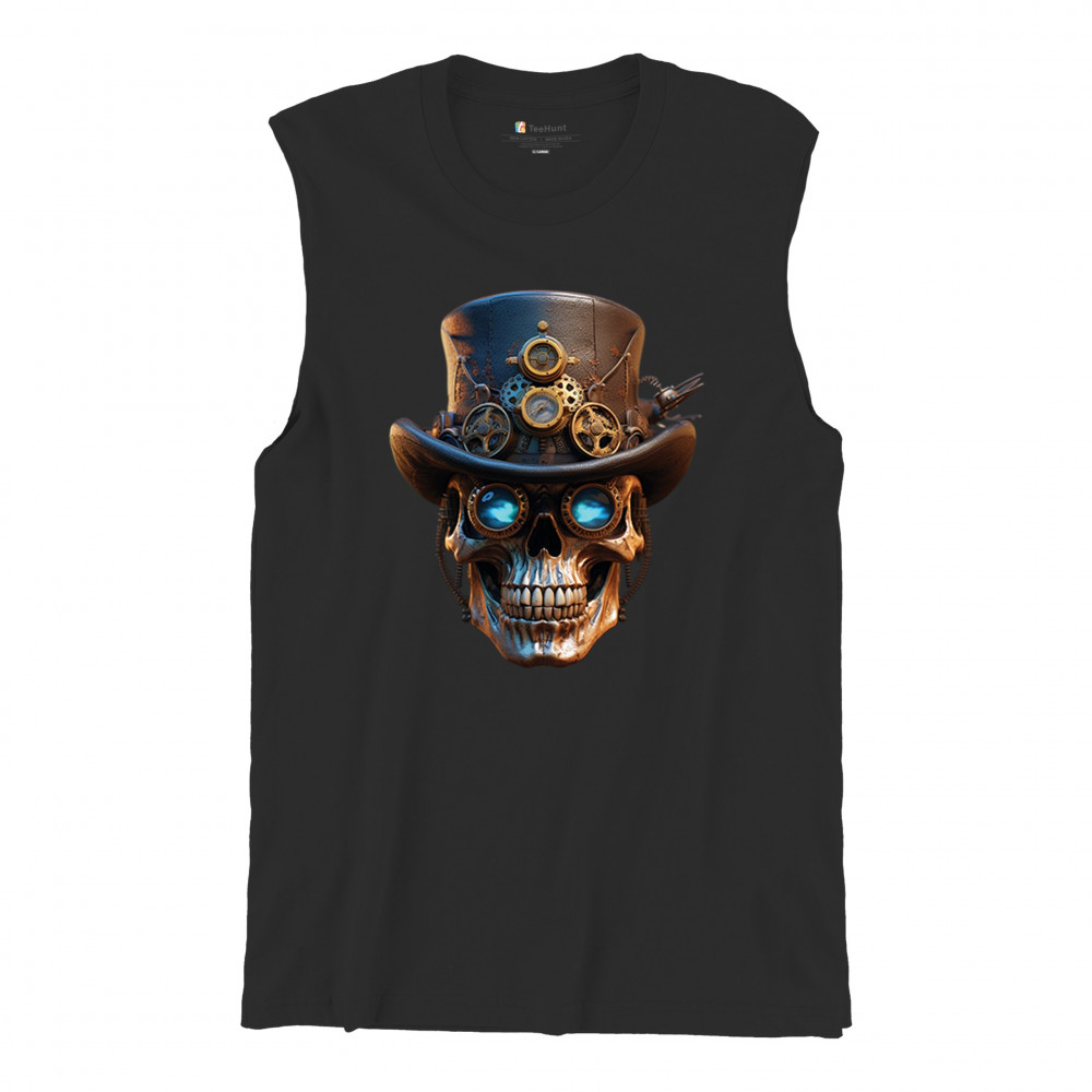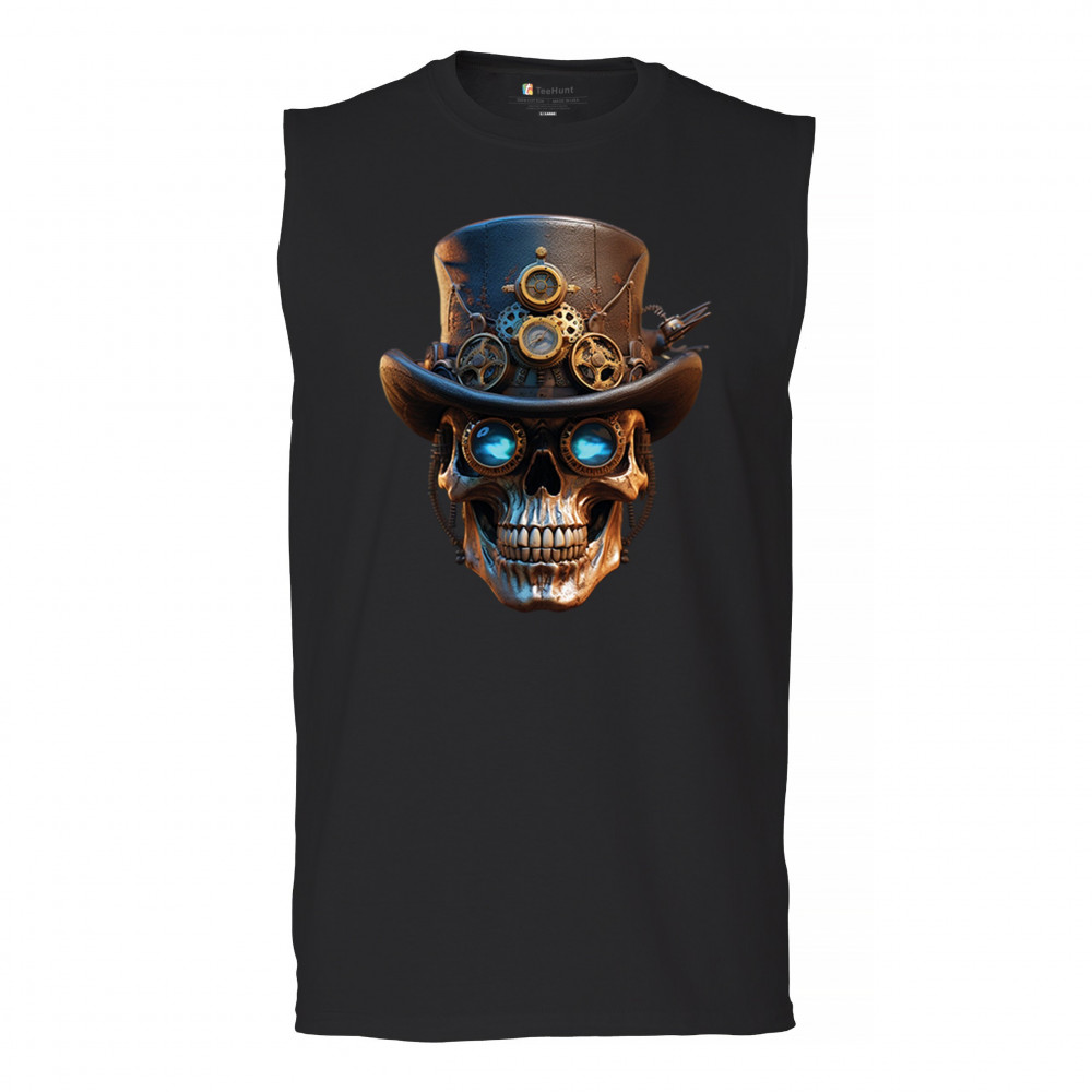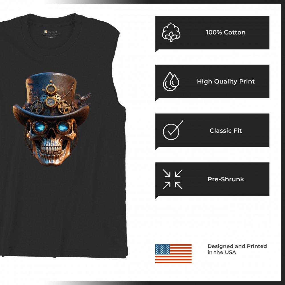 Steampunk skull shirt with gothic retro-futurism. Perfect for Halloween, cosplay, biker rallies, and edgy rebel fashion lovers.
