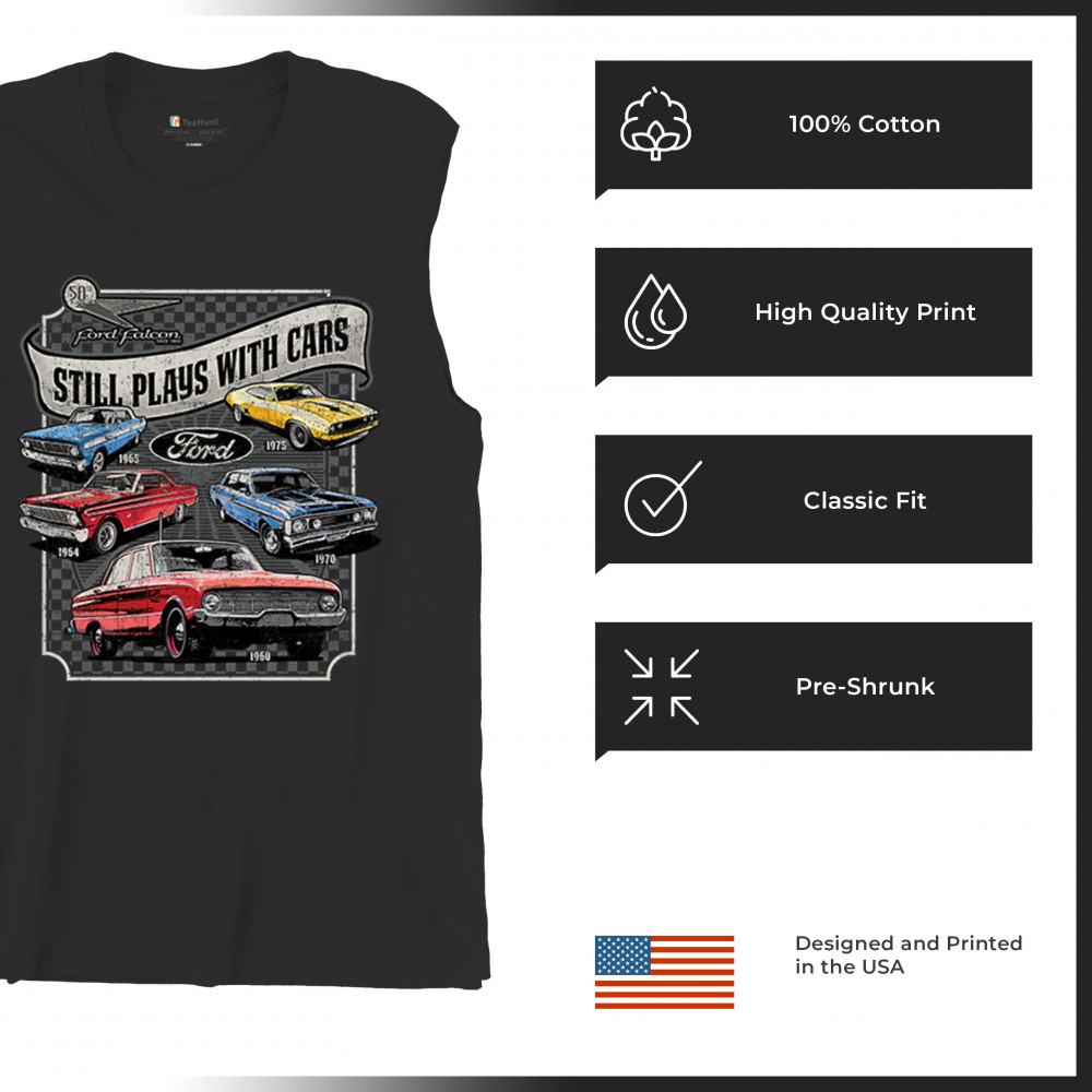 Still Plays With Cars honors the Ford Falcon with vintage muscle car art, perfect for gearheads, retro garage fans, and classic car collectors.