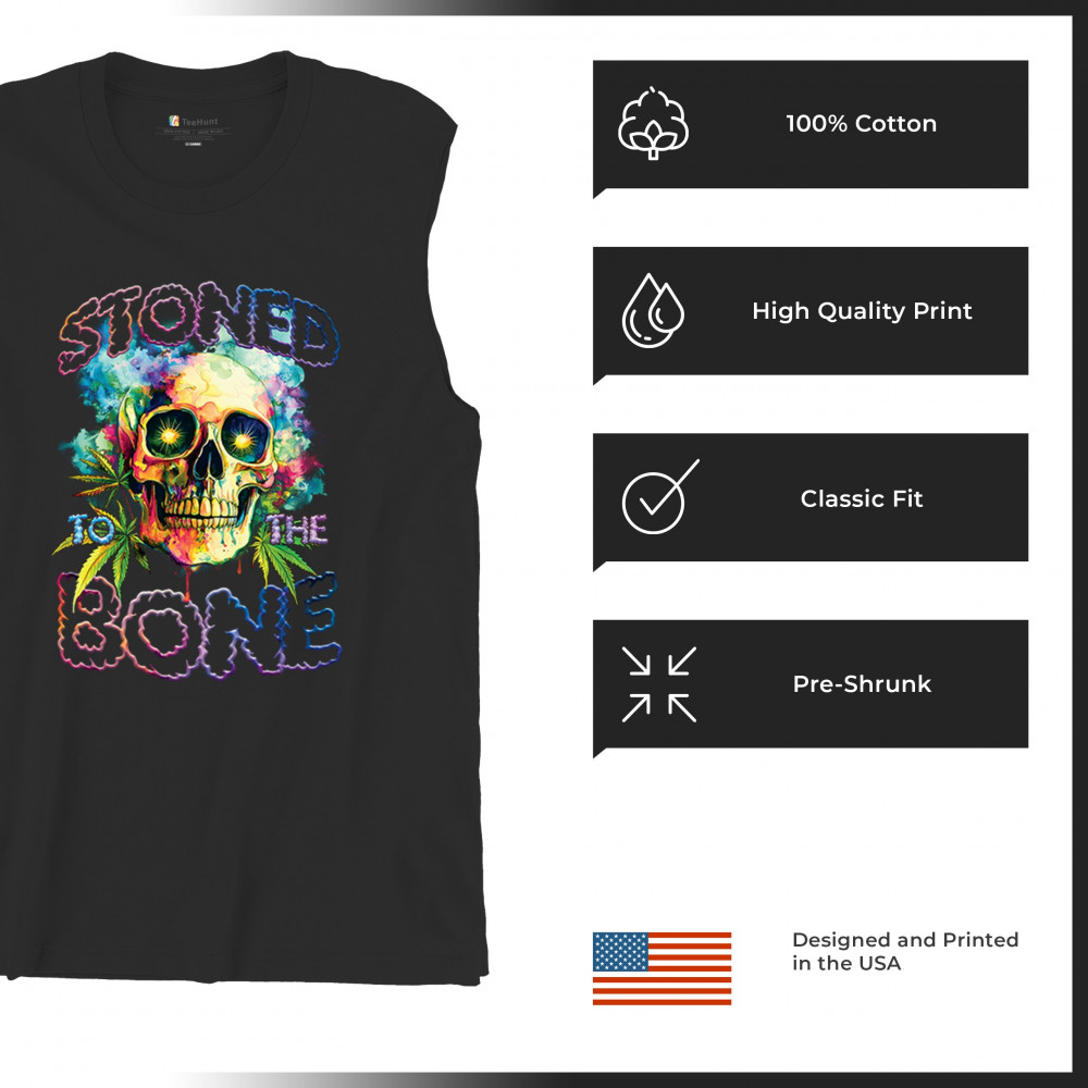 Turn heads with this bold, psychedelic “Stoned to the Bone†skull tee—loaded with neon colors, weed leaves, and a trippy aesthetic. It’s built for cannabis lovers, hippies, festival-goers, and party people living the high life. The ultimate head shop style and 420 fashion statement.