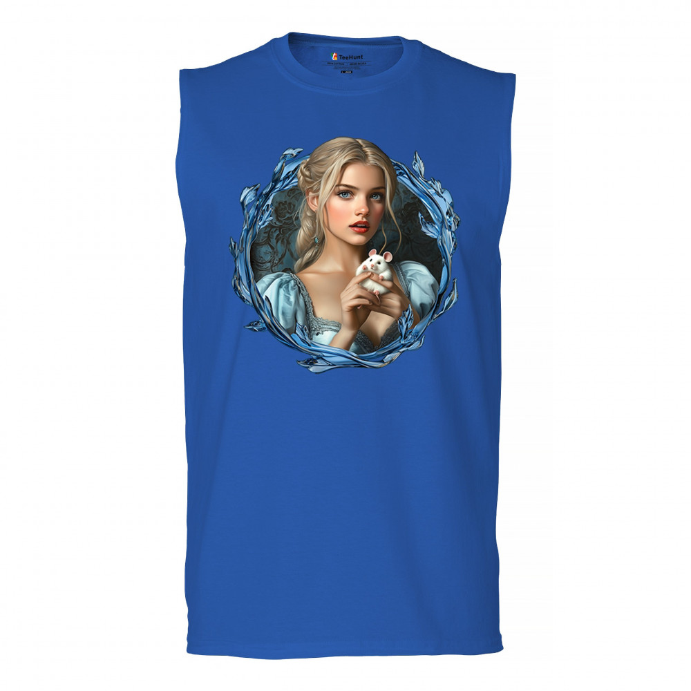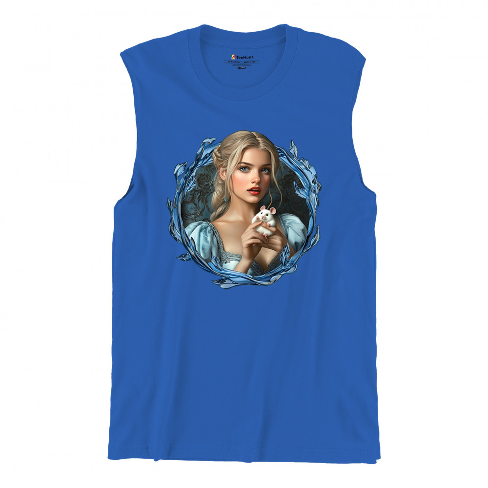 A whimsical design inspired by fairytales and Cinderella magic, featuring a blonde girl in a blue dress holding a white mouse. The icy blue leaf frame evokes enchantment and transformation. With soft, vintage tones and a dreamy feel, it’s a charming tribute to kindness, fantasy, animal companionship, and gentle storytelling magic.