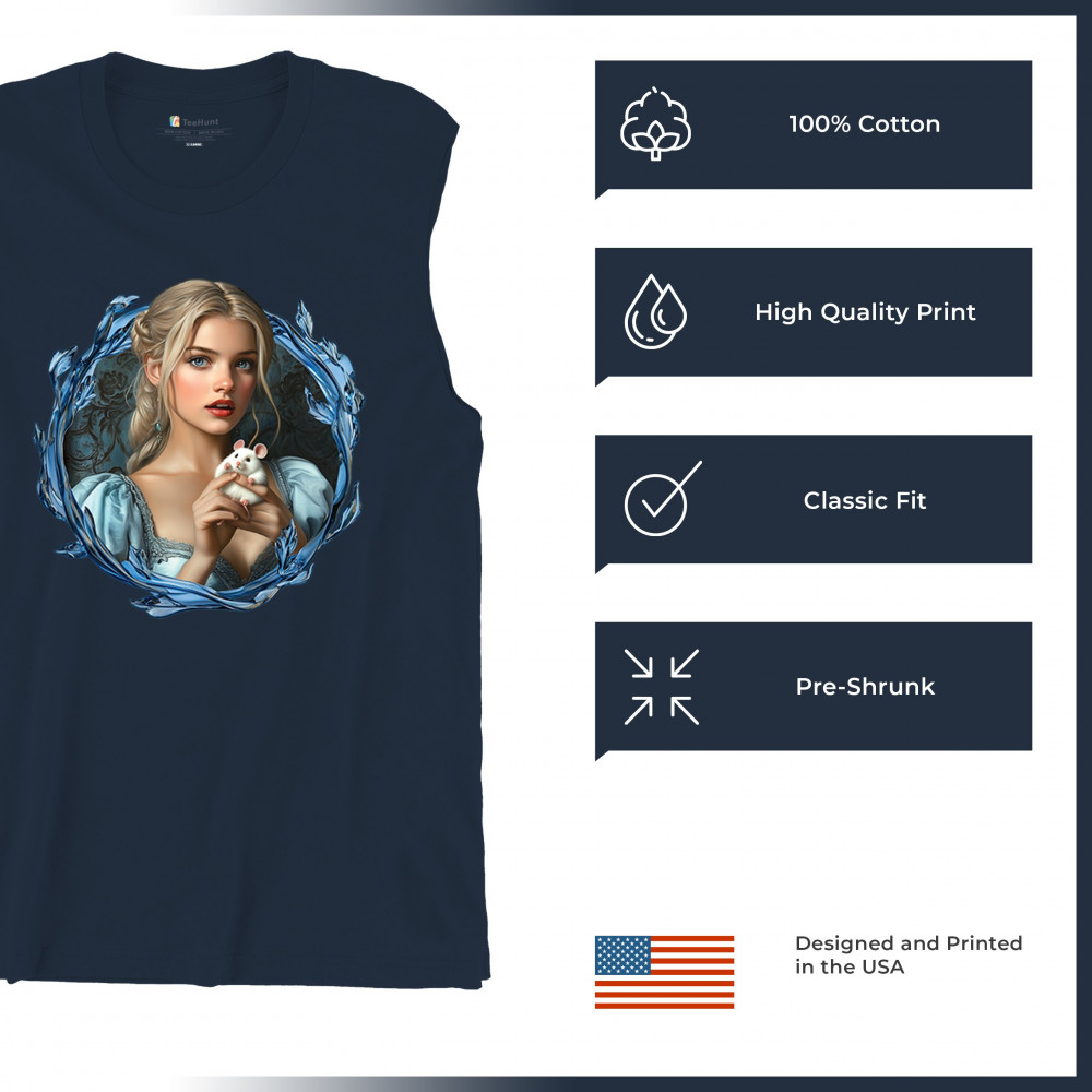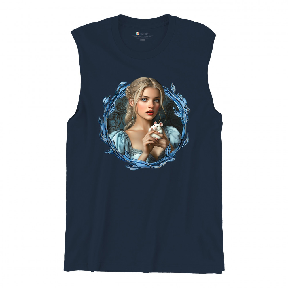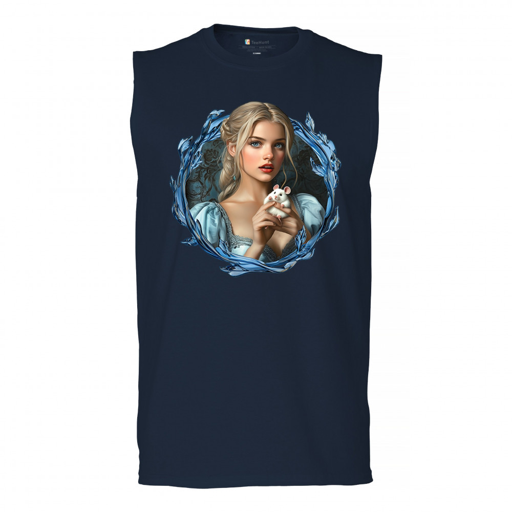 A whimsical design inspired by fairytales and Cinderella magic, featuring a blonde girl in a blue dress holding a white mouse. The icy blue leaf frame evokes enchantment and transformation. With soft, vintage tones and a dreamy feel, it’s a charming tribute to kindness, fantasy, animal companionship, and gentle storytelling magic.