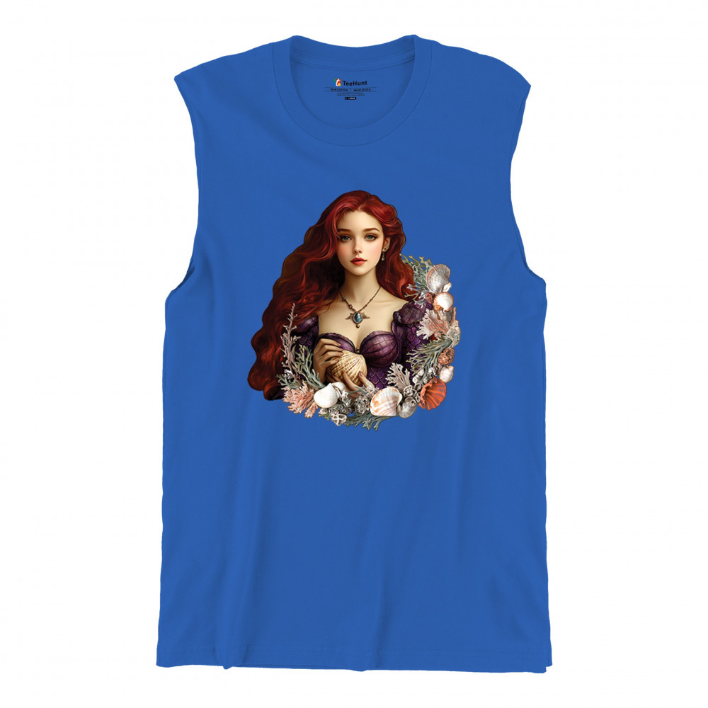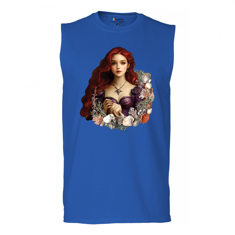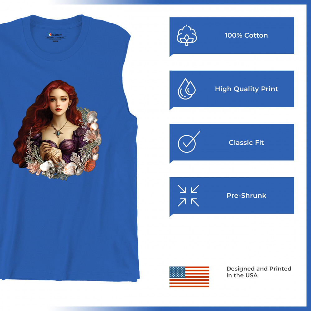 Inspired by mystical ocean themes, this design features a fantasy red-haired girl in a seashell dress, cradling a large shell. She is framed by coral, seaweed, and a shimmering array of ocean shells. With nods to classic mermaid lore and fairytale storytelling, it's perfect for fans of fantasy creatures, marine magic, and romantic ocean legends.