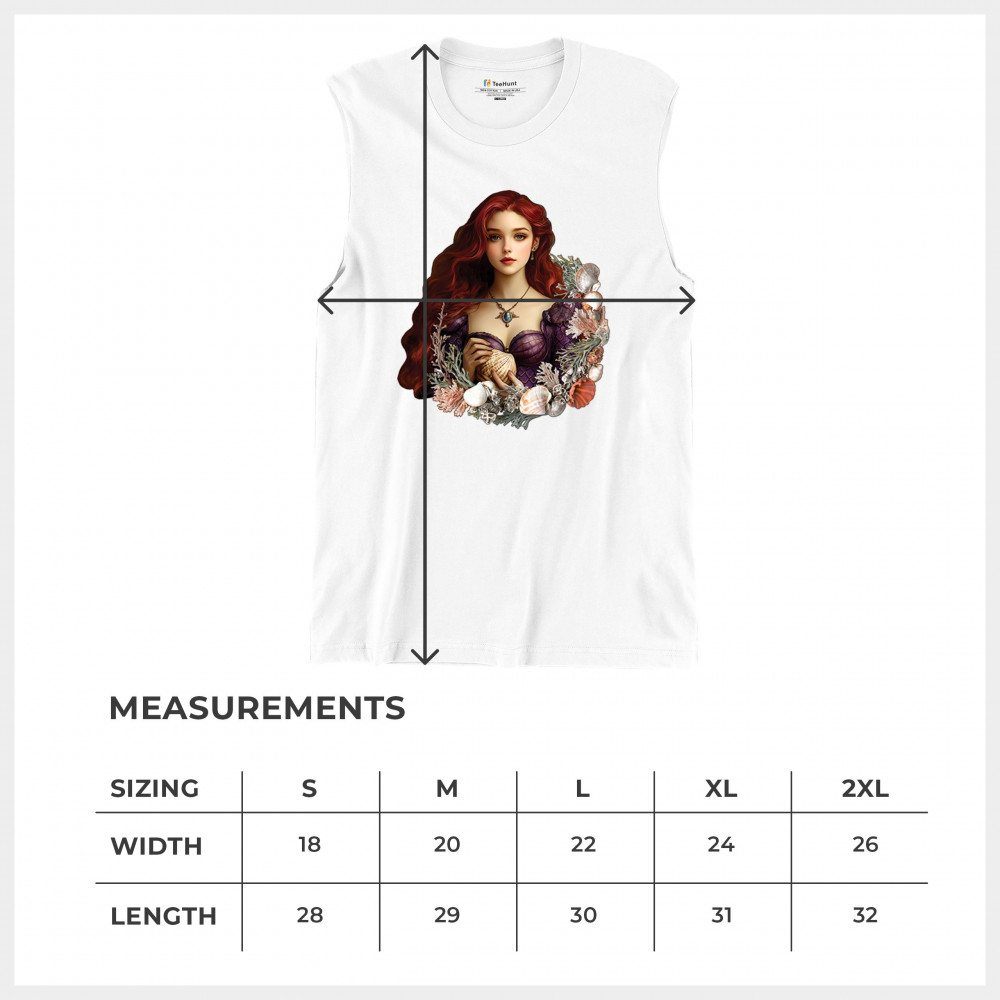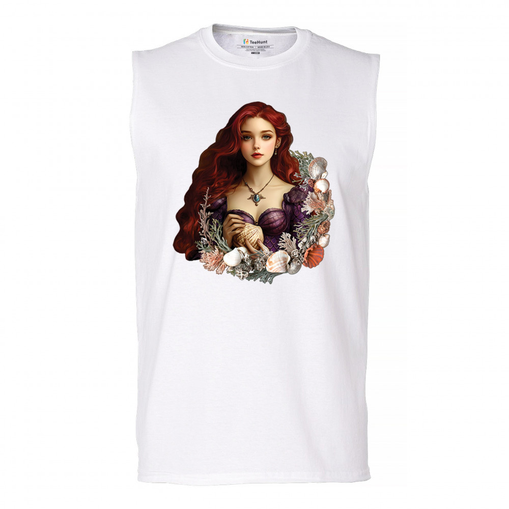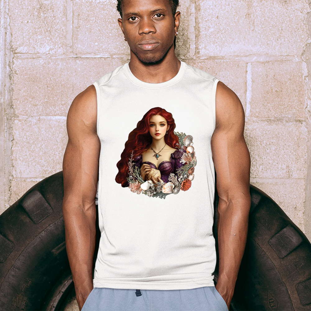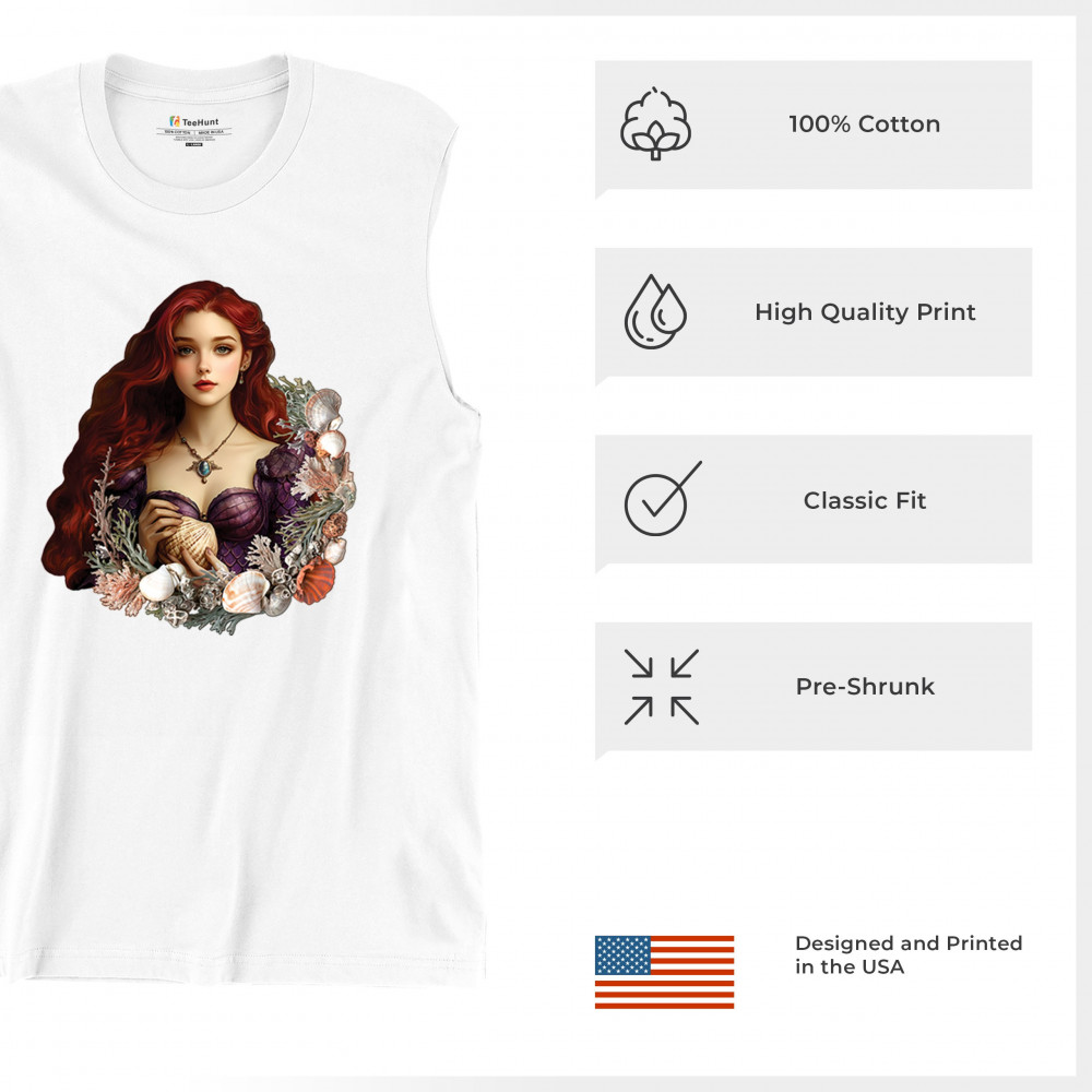 Inspired by mystical ocean themes, this design features a fantasy red-haired girl in a seashell dress, cradling a large shell. She is framed by coral, seaweed, and a shimmering array of ocean shells. With nods to classic mermaid lore and fairytale storytelling, it's perfect for fans of fantasy creatures, marine magic, and romantic ocean legends.