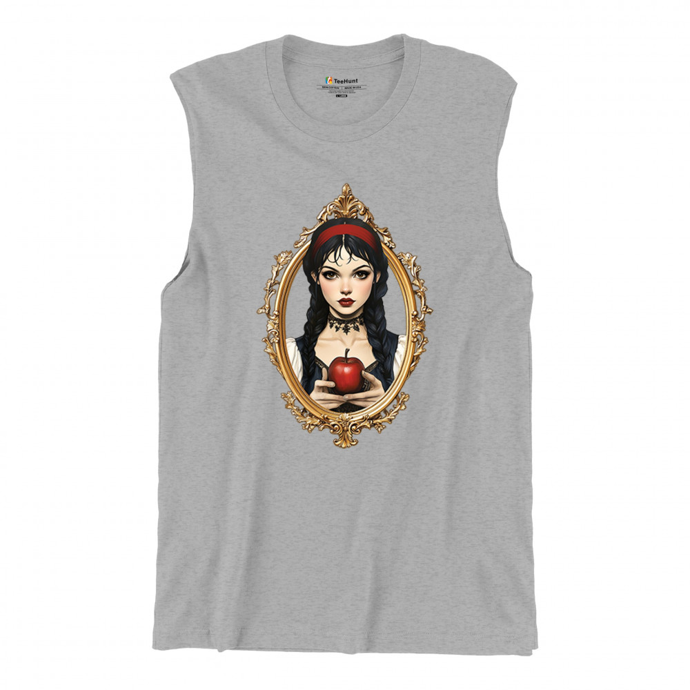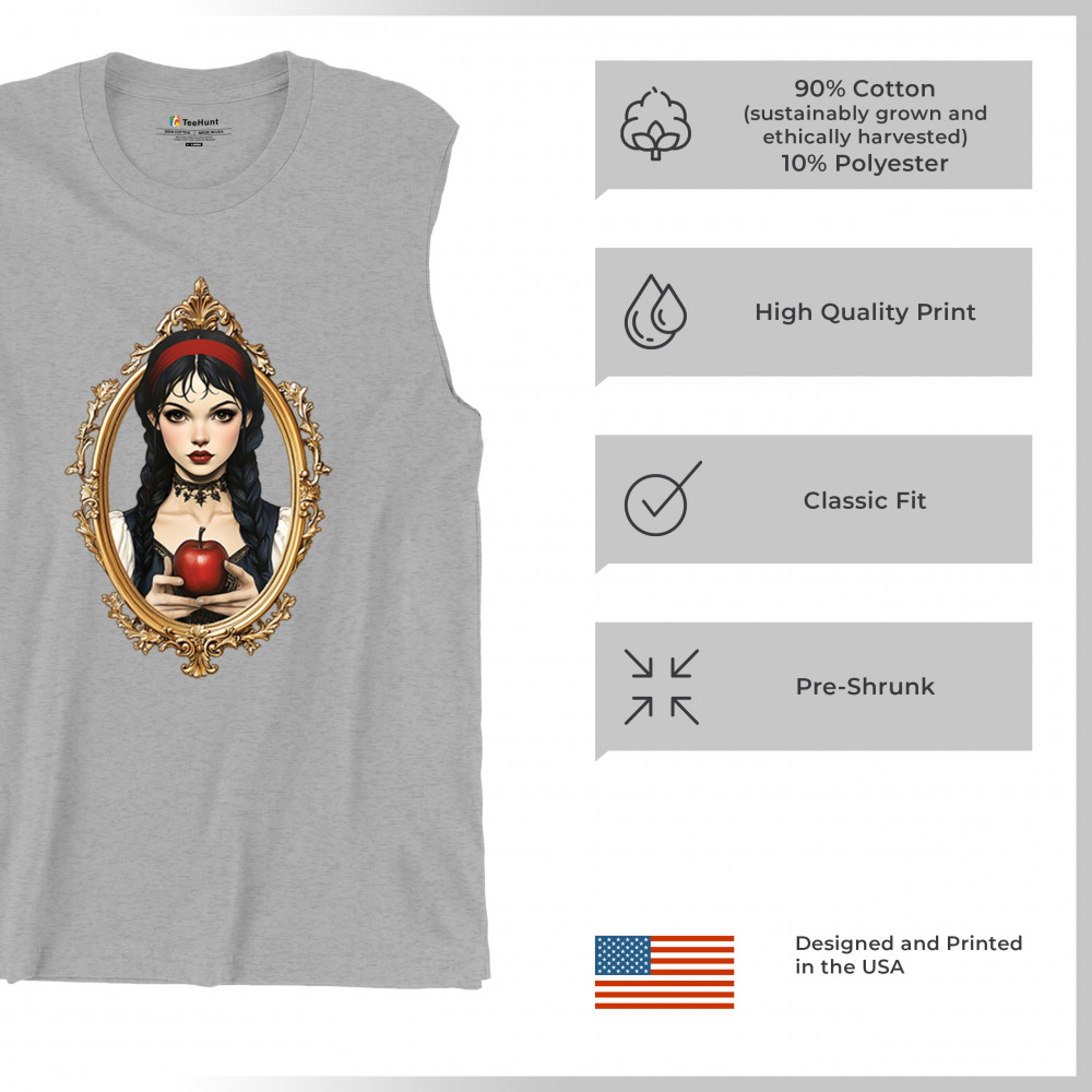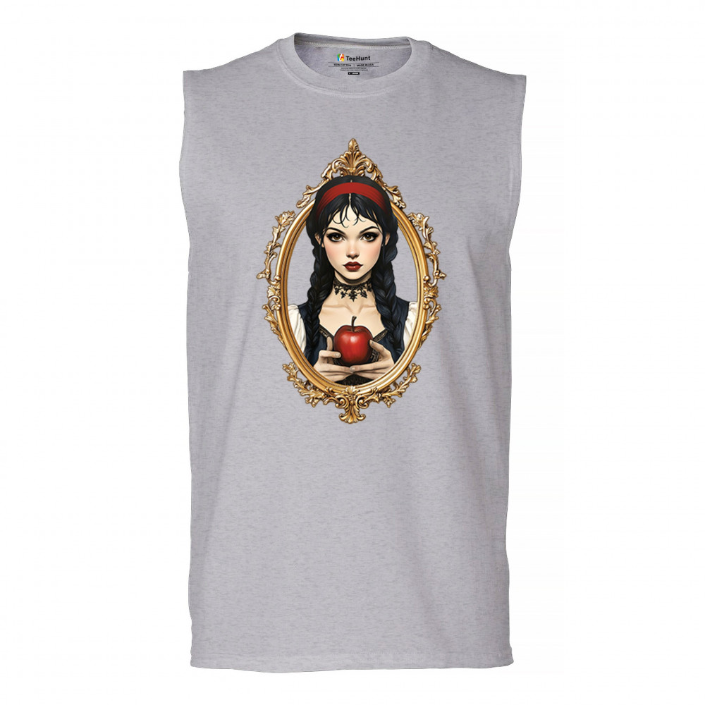 Dark fairytale design with red apple, gold frame, and Snow White vibes. A dreamy blend of fantasy, gothic style, and magical storytelling.