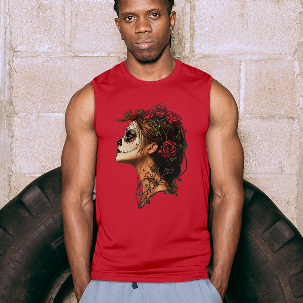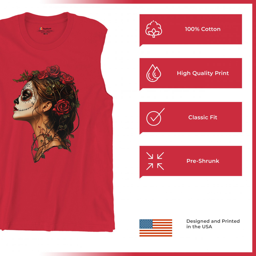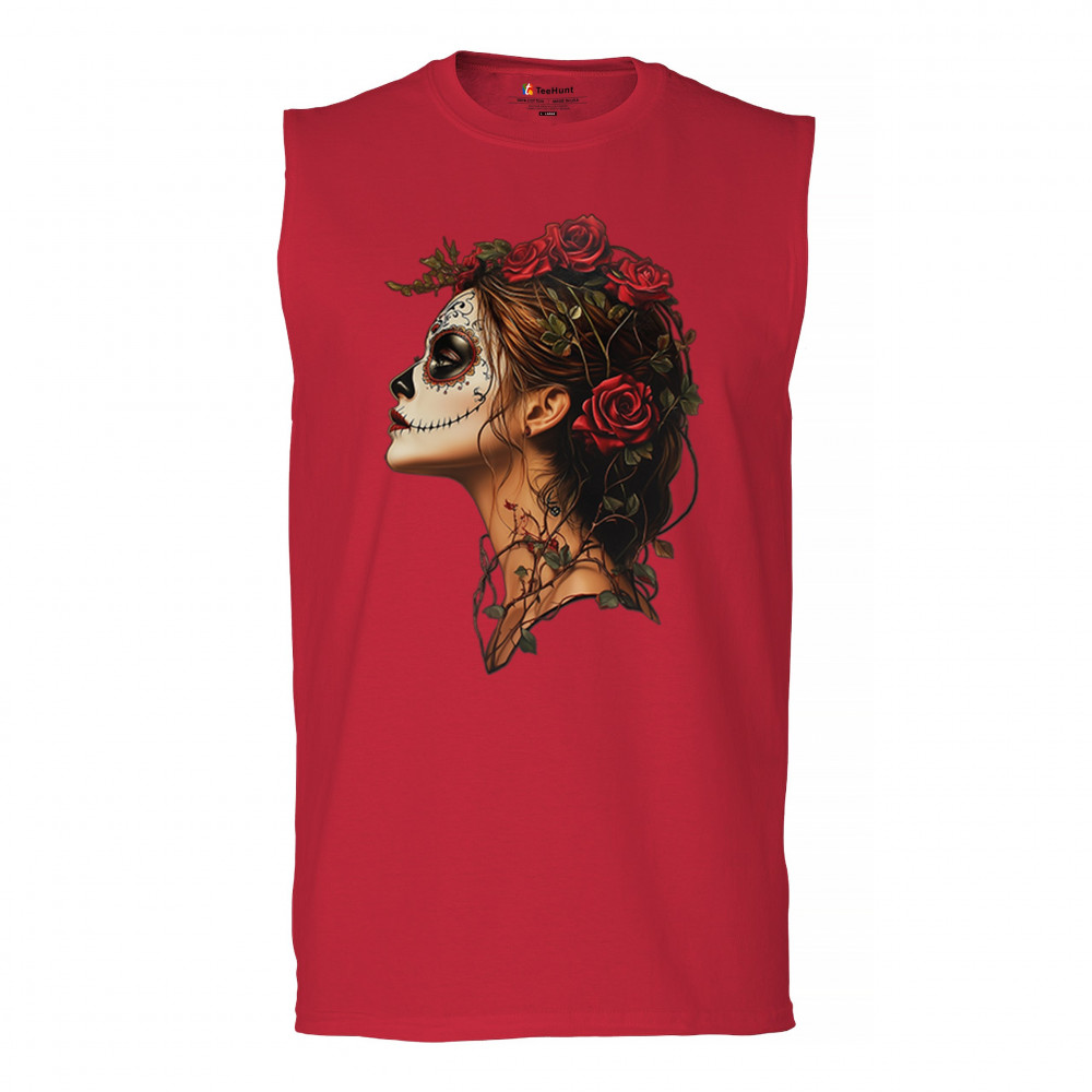 Celebrate feminine power and gothic elegance with this captivating DÃa de los Muertos design. Featuring a woman in profile with sugar skull makeup, blooming red roses, natural vines, dark hair, and symbolic floral skull art, this bold tribute captures beauty, death, and strength in one romantic, detailed visual.
