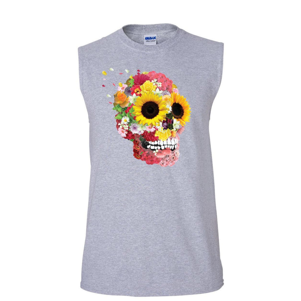 SUNFLOWERS SUGAR SKULL muscle shirt day of the dead calavera mexico sleeveless gray