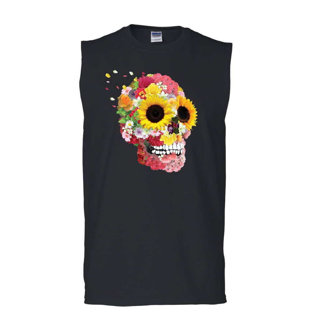 SUNFLOWERS SUGAR SKULL muscle shirt day of the dead calavera mexico sleeveless black