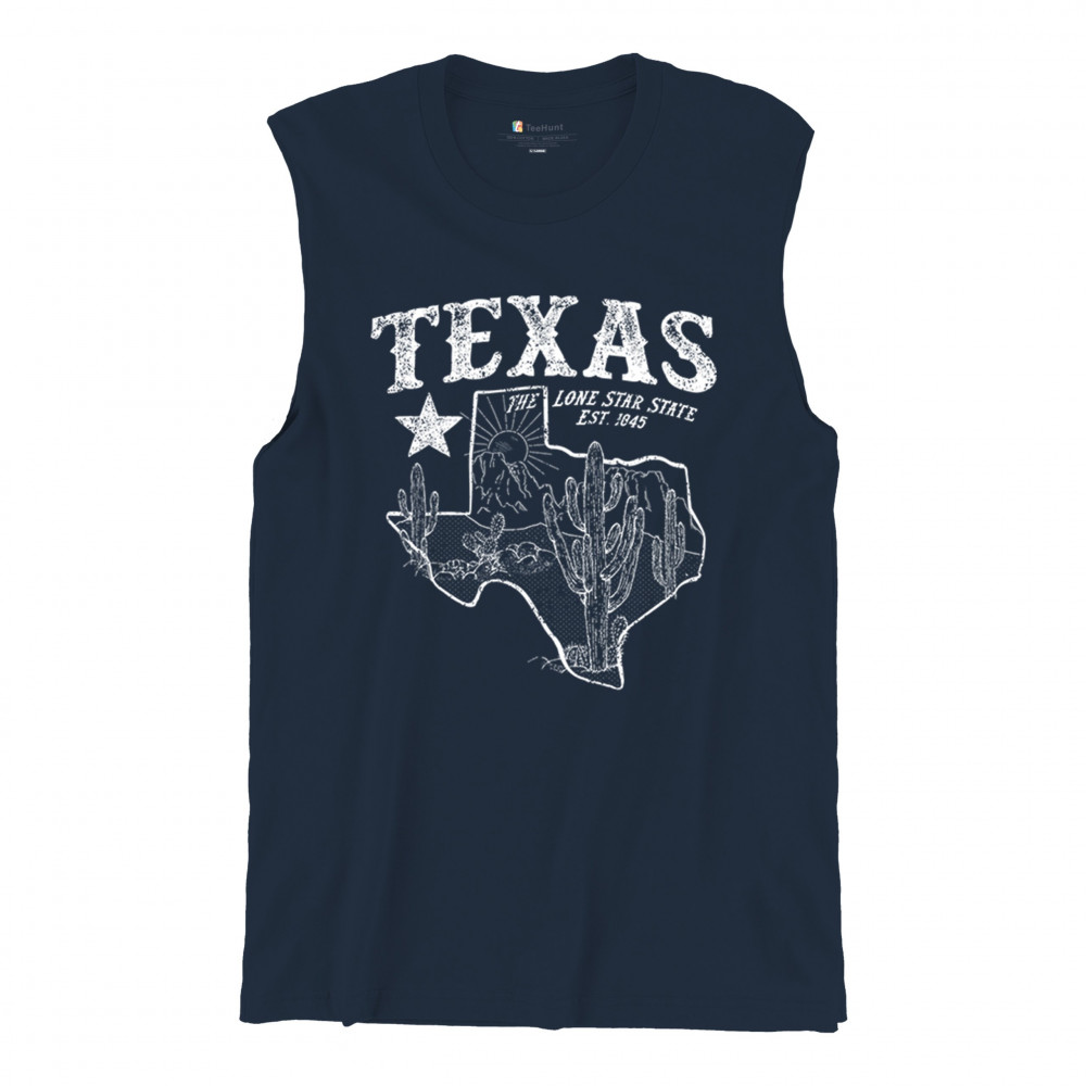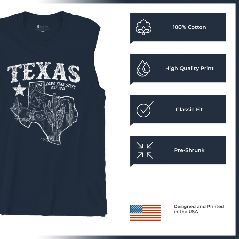 Vintage Texas pride design with cactus, mountains, Lone Star symbol, and 1845 tribute—perfect for rodeos and western events.