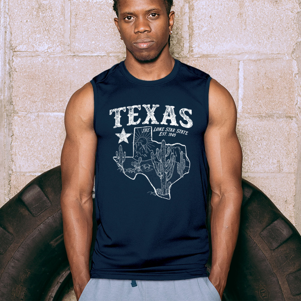 Celebrate the Lone Star State with this rugged Texas map design featuring cactus, mountains, and bold state pride text. A rustic southwestern tribute to the state’s heritage, established in 1845, it’s the perfect look for rodeos, country festivals, and lovers of the Texas desert lifestyle and scenery.