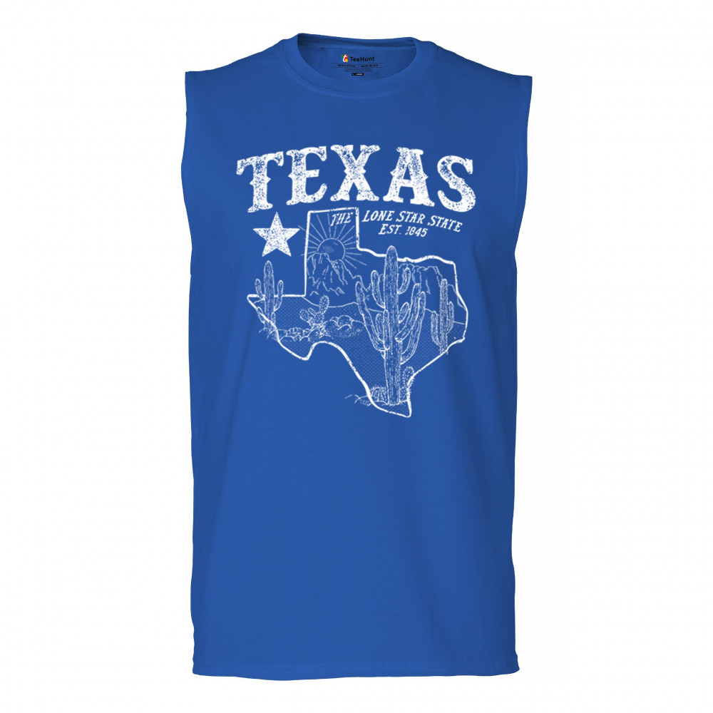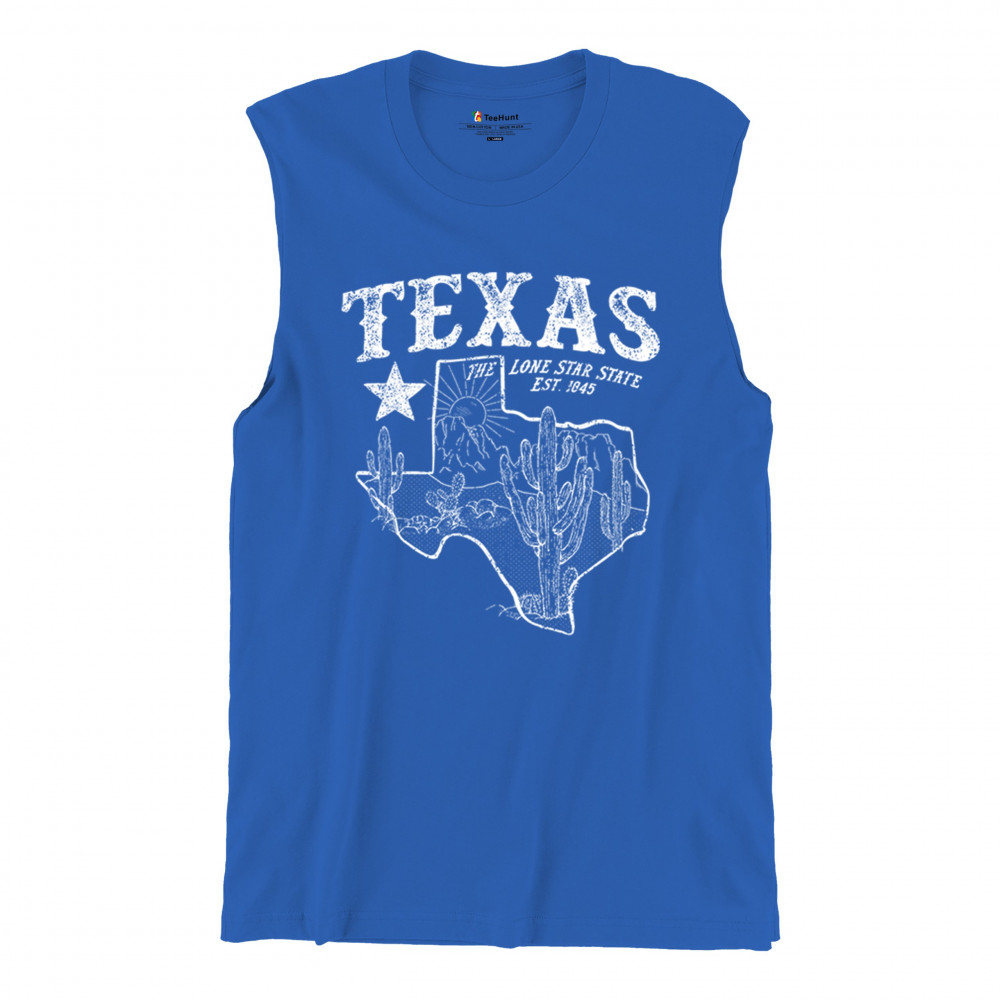 Vintage Texas pride design with cactus, mountains, Lone Star symbol, and 1845 tribute—perfect for rodeos and western events.