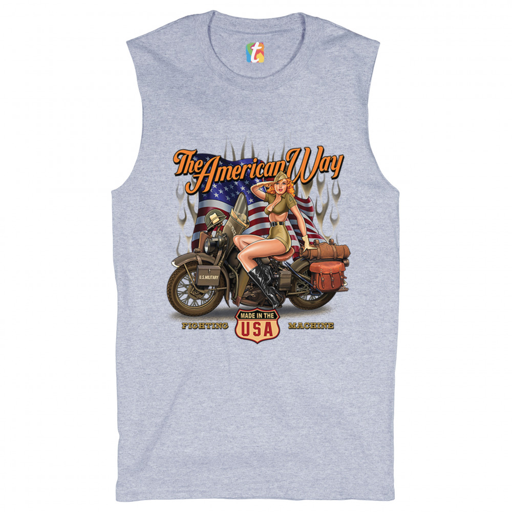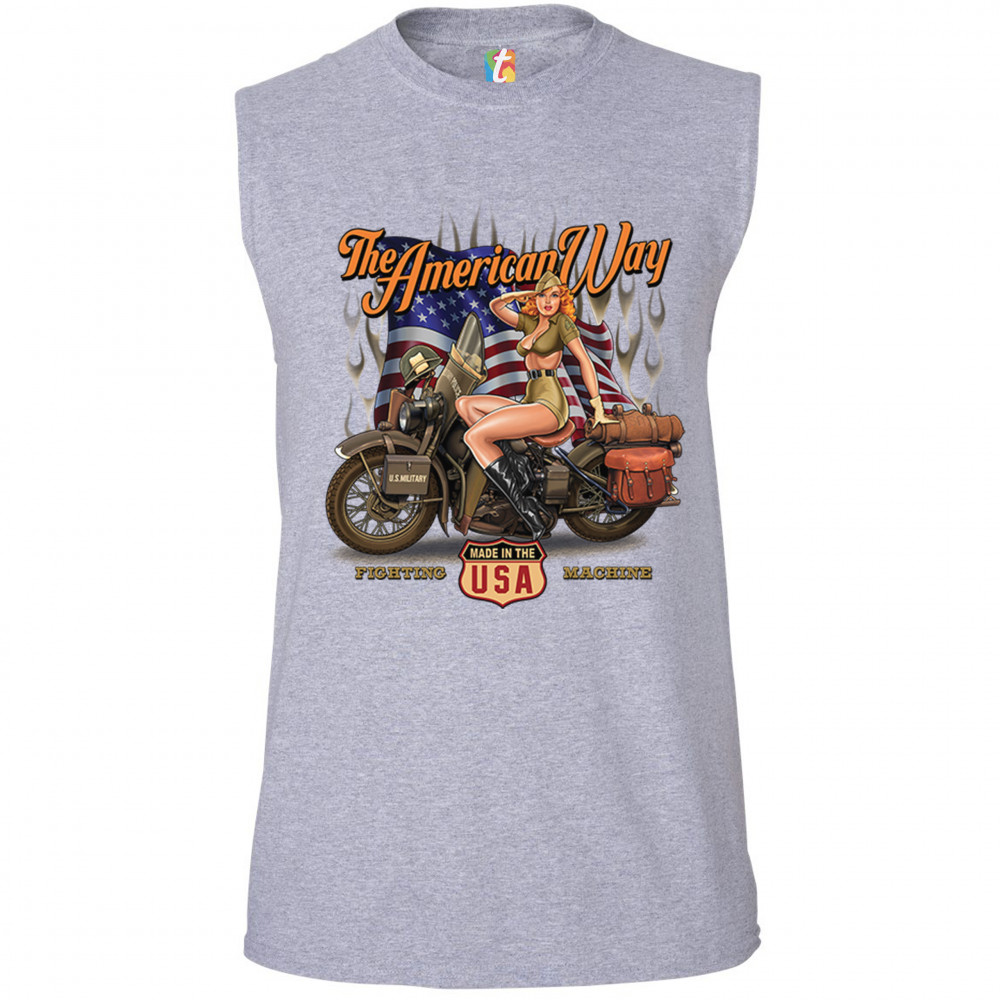 A print featuring a beautiful pin-up girl in leather boots sitting on a U.S. military motorcycle. There is the American Flag in the background and the words "The American Way" above it. At the bottom of the picture there is a shield which says: "made in the USA". "Fighting Machine" is written under the motorcycle's wheels. A great choice for a motorcycle enthusiast.