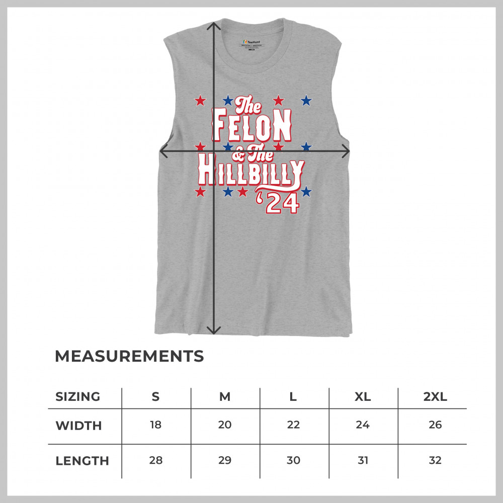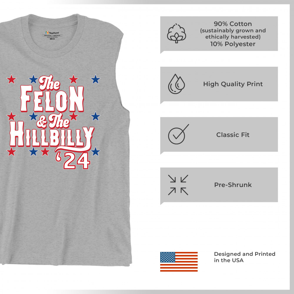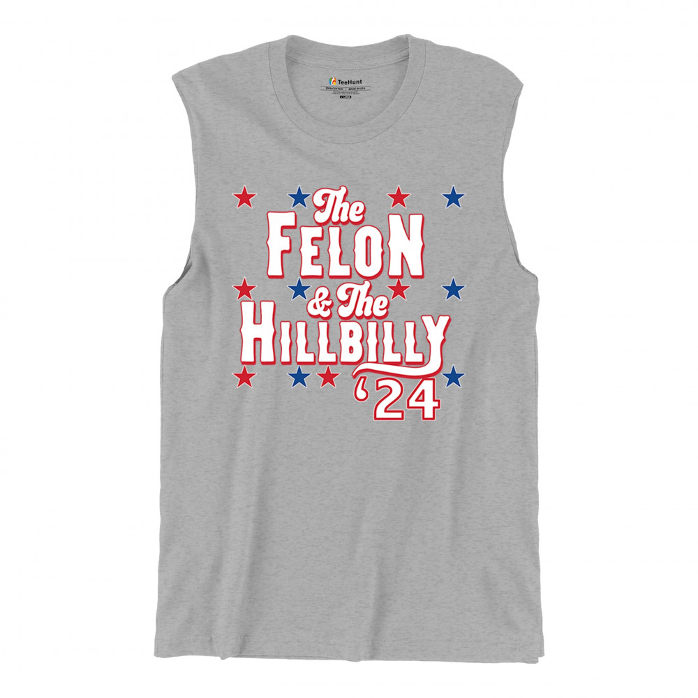 Humorous pro-Trump and Vance design for the 2024 election. "The Felon & The Hillbilly '24" captures conservative pride and humor in one bold statement.