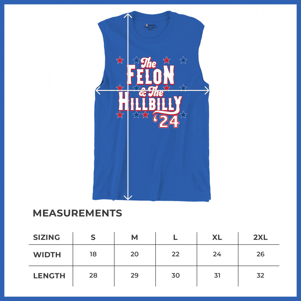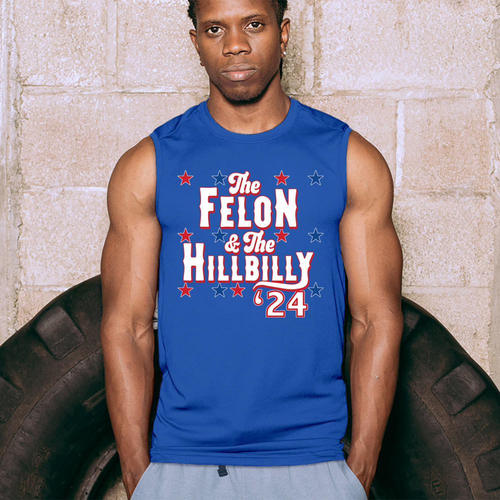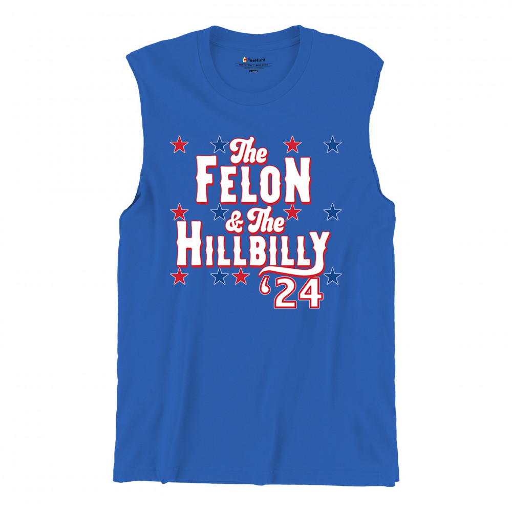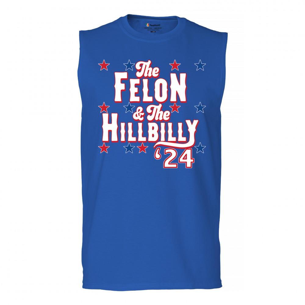Humorous pro-Trump and Vance design for the 2024 election. "The Felon & The Hillbilly '24" captures conservative pride and humor in one bold statement.
