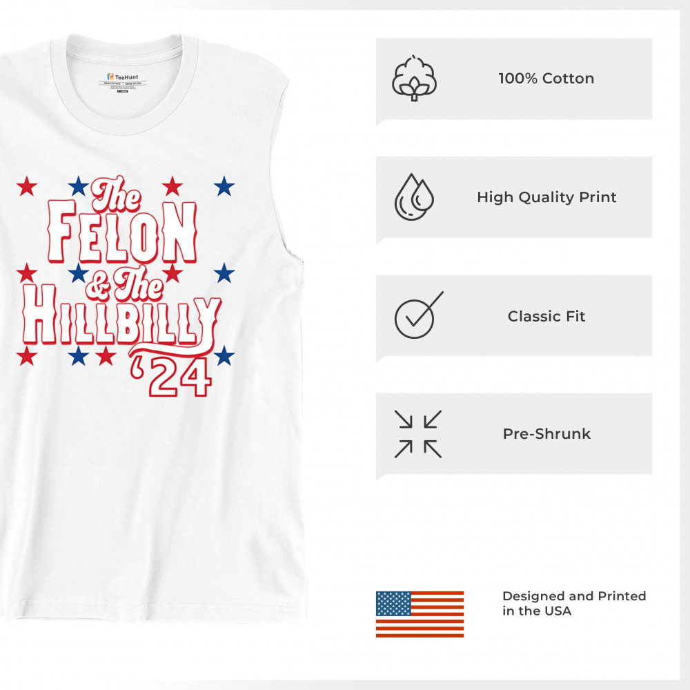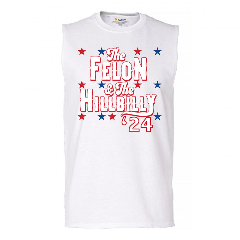 Humorous pro-Trump and Vance design for the 2024 election. "The Felon & The Hillbilly '24" captures conservative pride and humor in one bold statement.