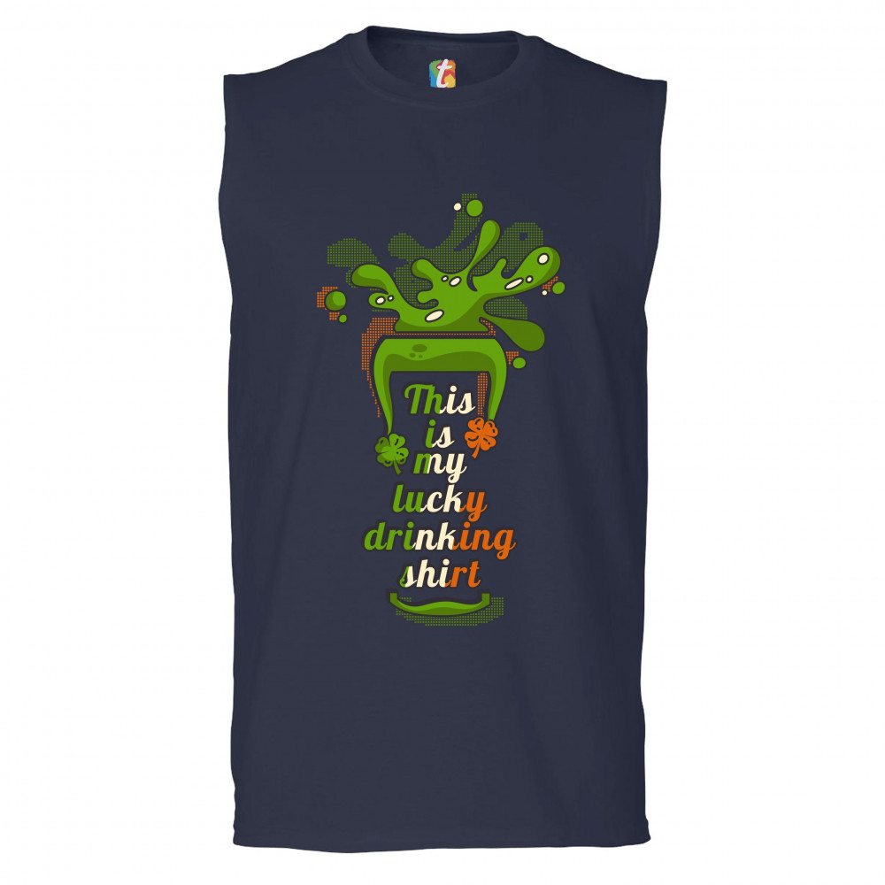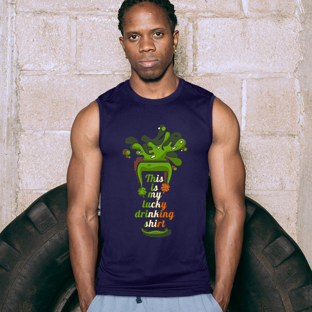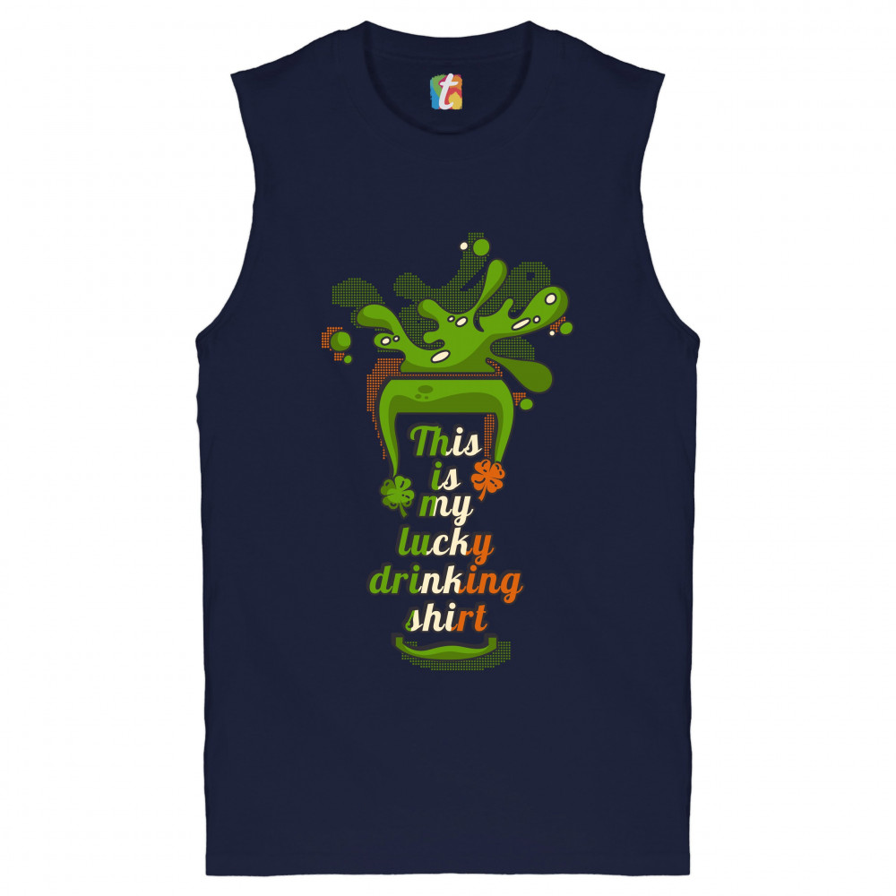 A print featuring a silhouette of a glass with beer spilling out of it. Inside the glass there is a text: "This is my lucky drinking shirt" in the colors of the flag of Ireland. A great choice to wear on March 17 to celebrate the St. Patrick's Day and sho