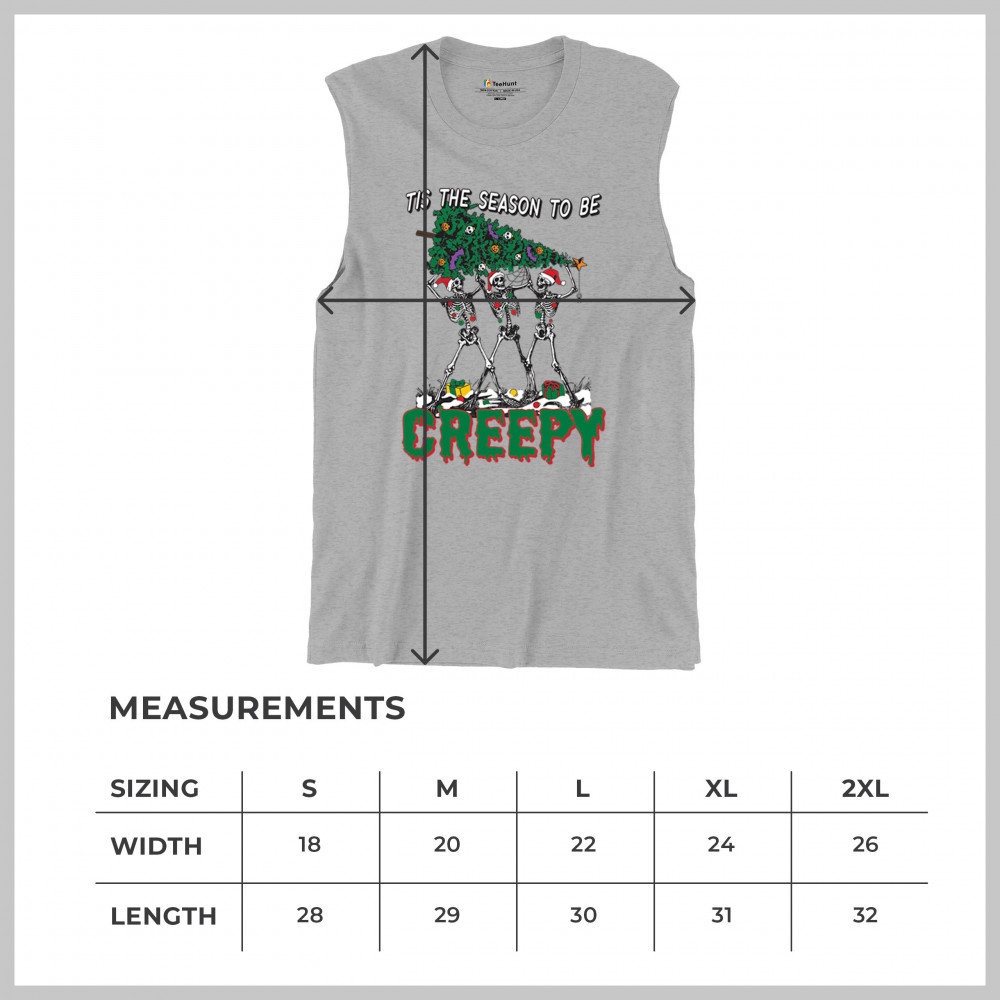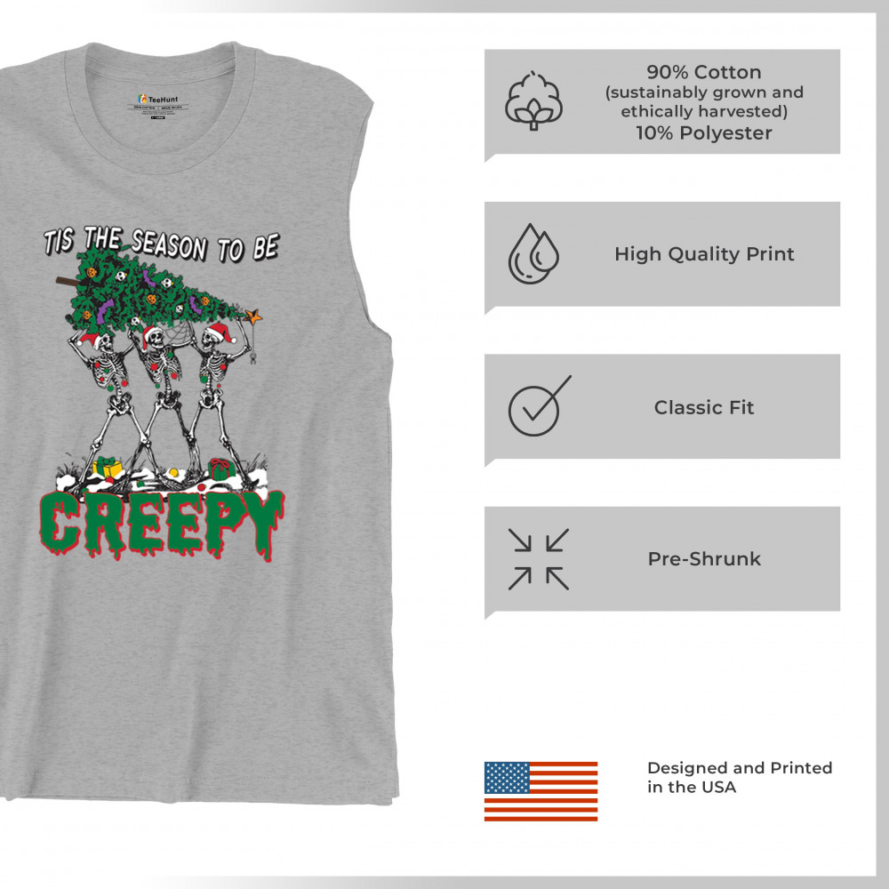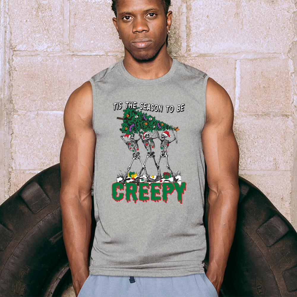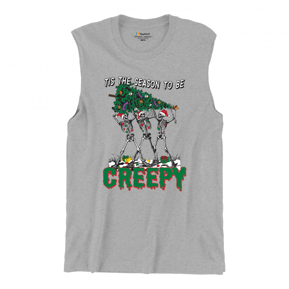 "Tis the Season to Be Creepy" combines holiday cheer with a hauntingly fun twist. This creative design features skeletons donning Santa hats as they carry a spooky Christmas tree decorated with eerie ornaments. Perfect for holiday gatherings, Secret Santa gifts, or themed parties, this design celebrates the festive and the macabre. Embrace the jolliest and creepiest bunch this season with this standout apparel.