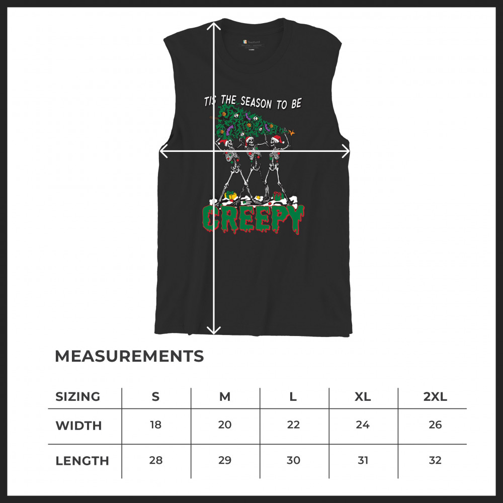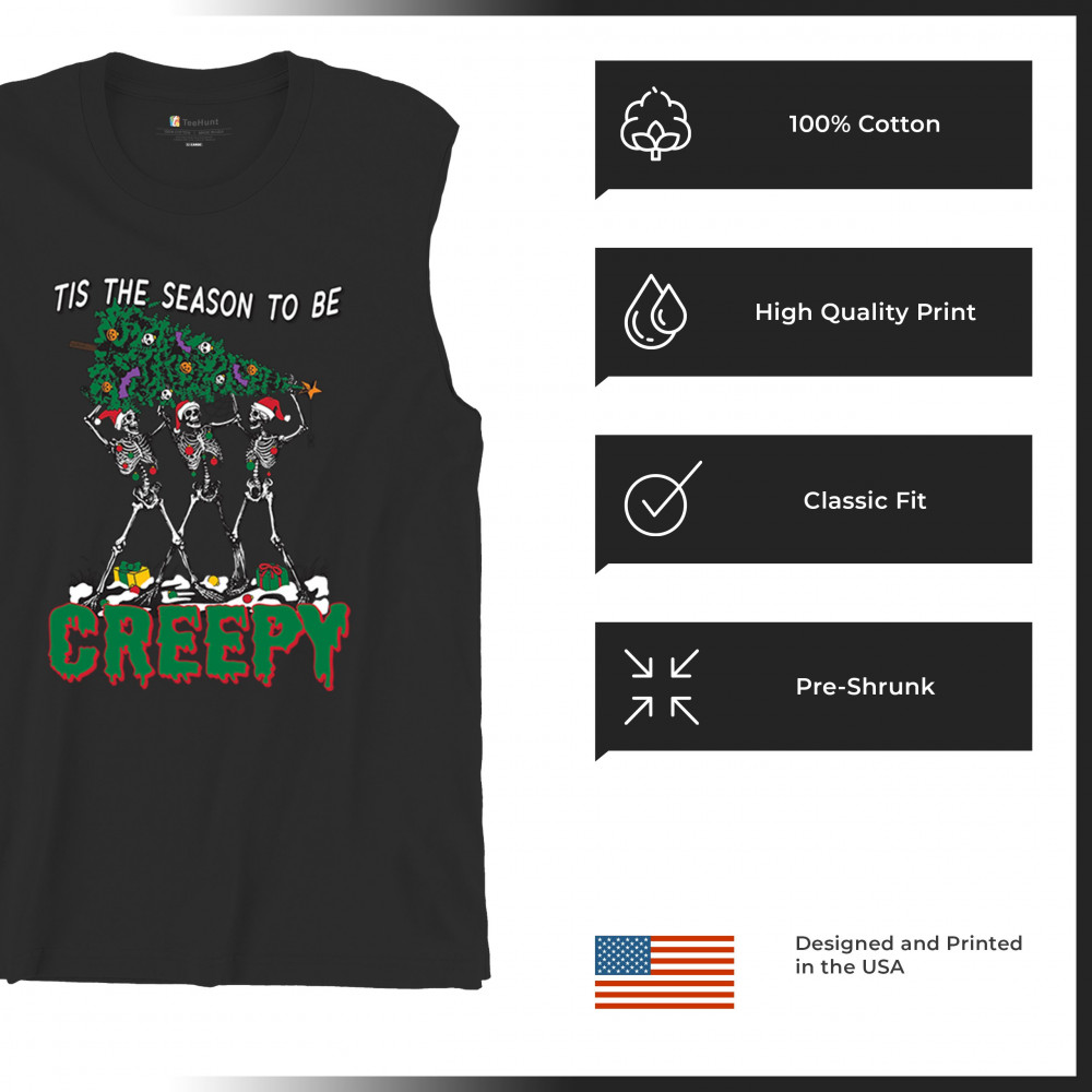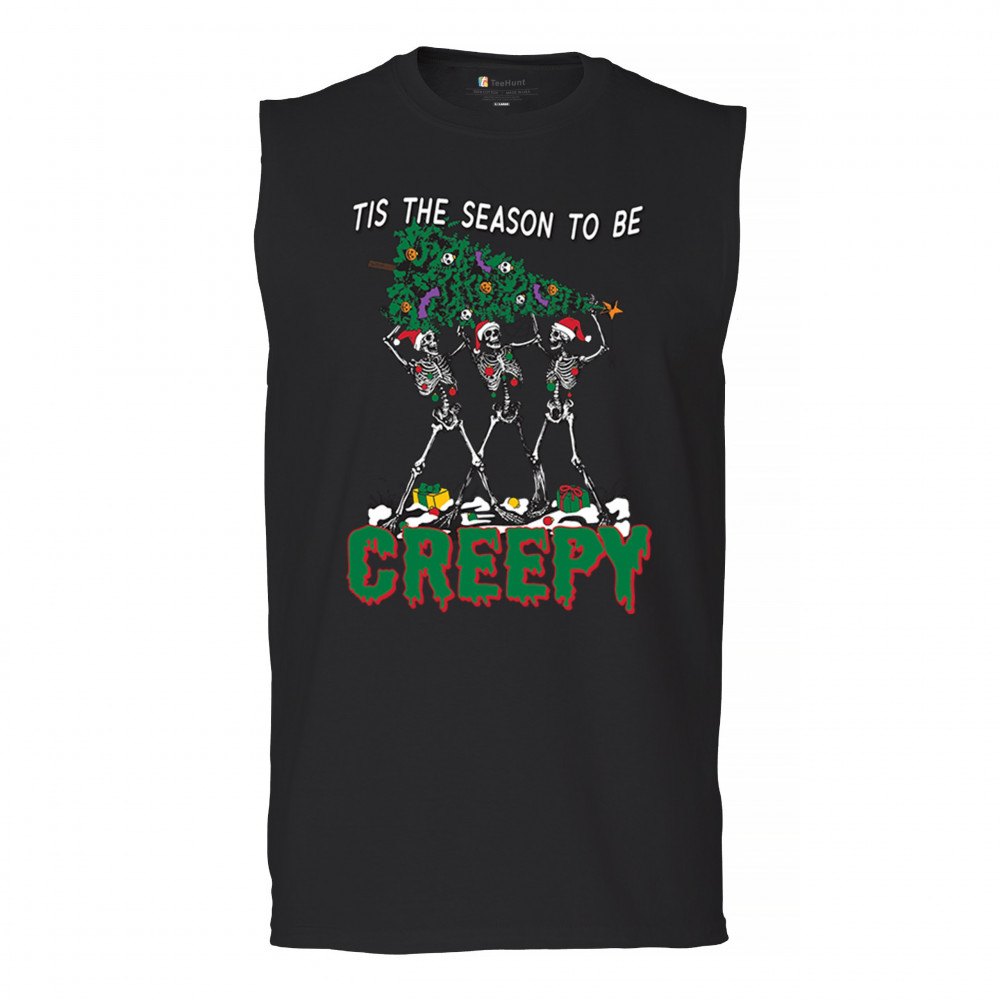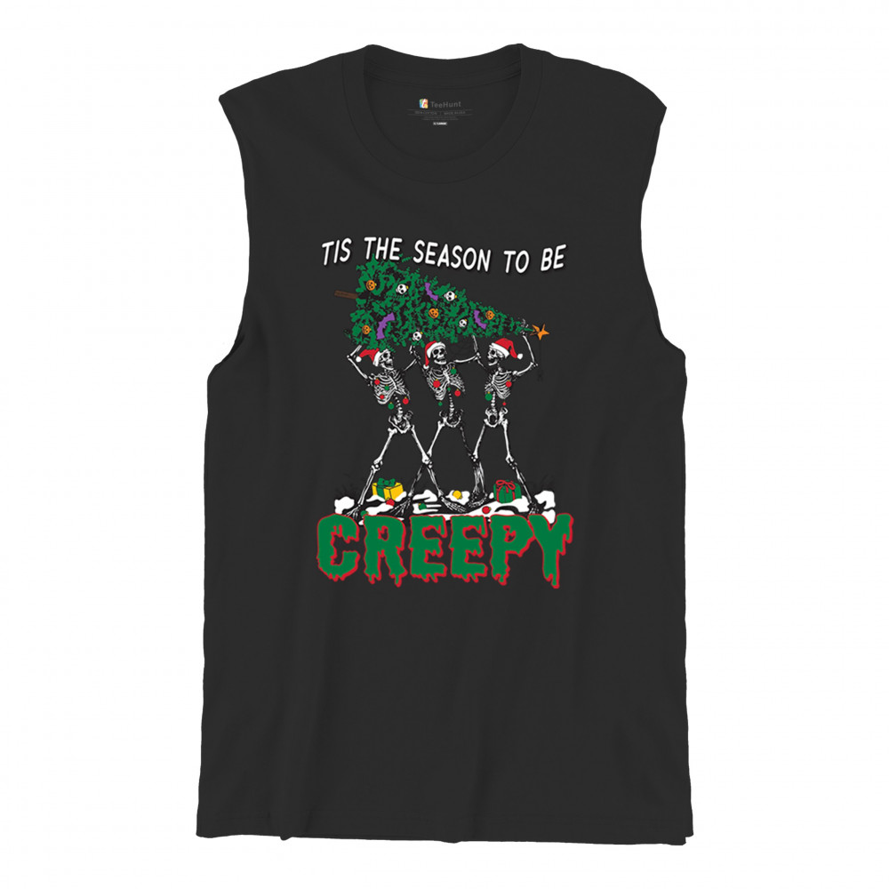 "Tis the Season to Be Creepy" combines holiday cheer with a hauntingly fun twist. This creative design features skeletons donning Santa hats as they carry a spooky Christmas tree decorated with eerie ornaments. Perfect for holiday gatherings, Secret Santa gifts, or themed parties, this design celebrates the festive and the macabre. Embrace the jolliest and creepiest bunch this season with this standout apparel.