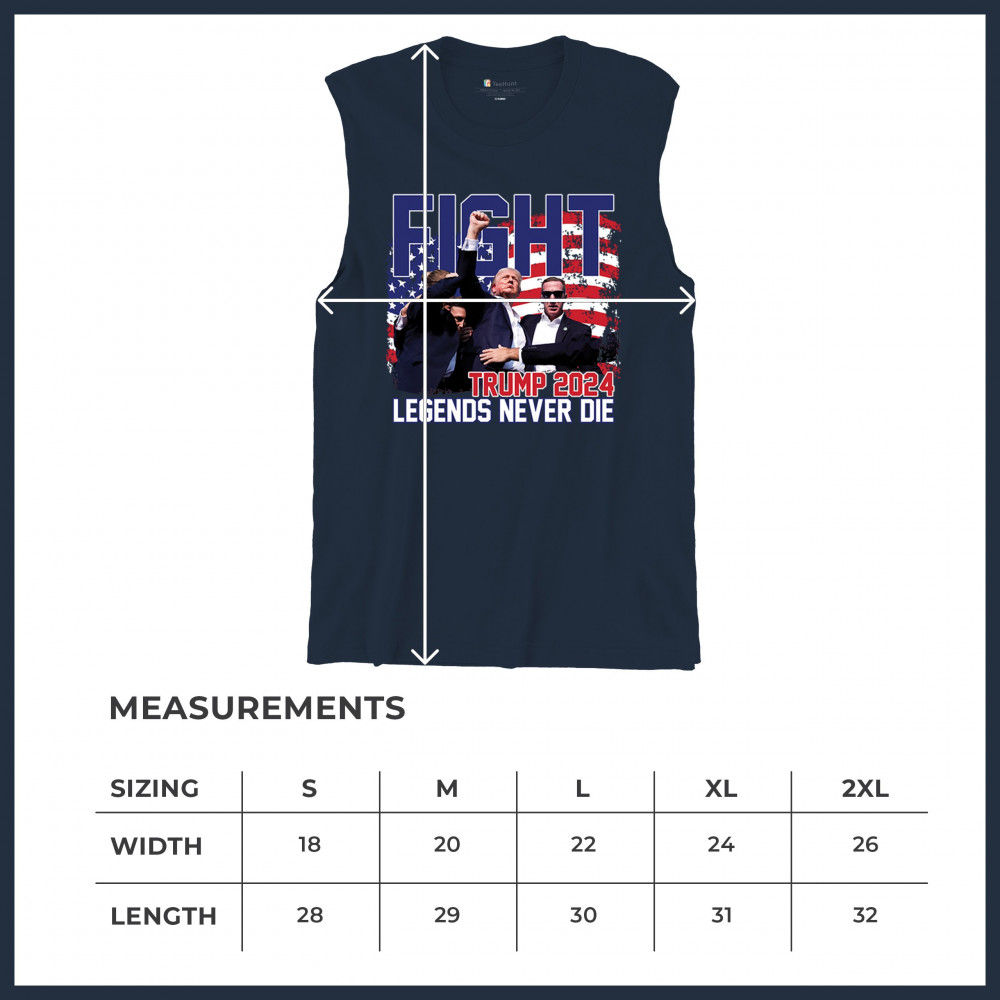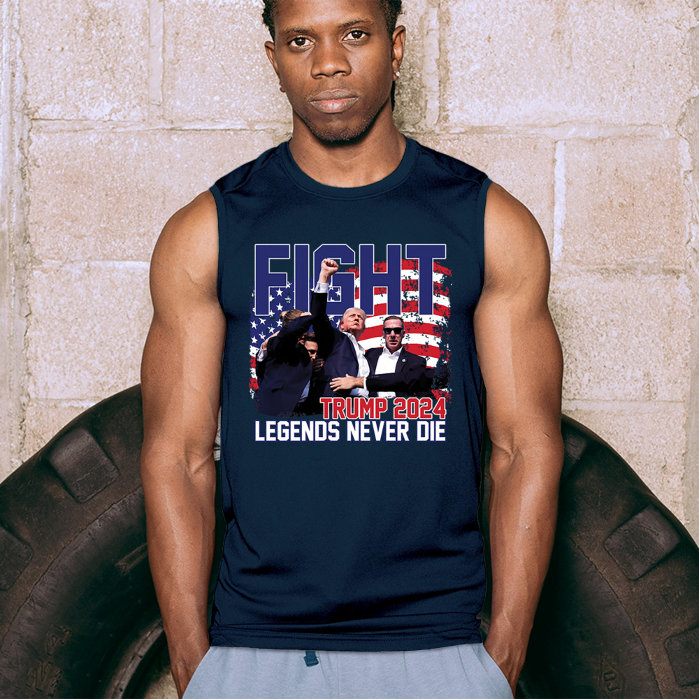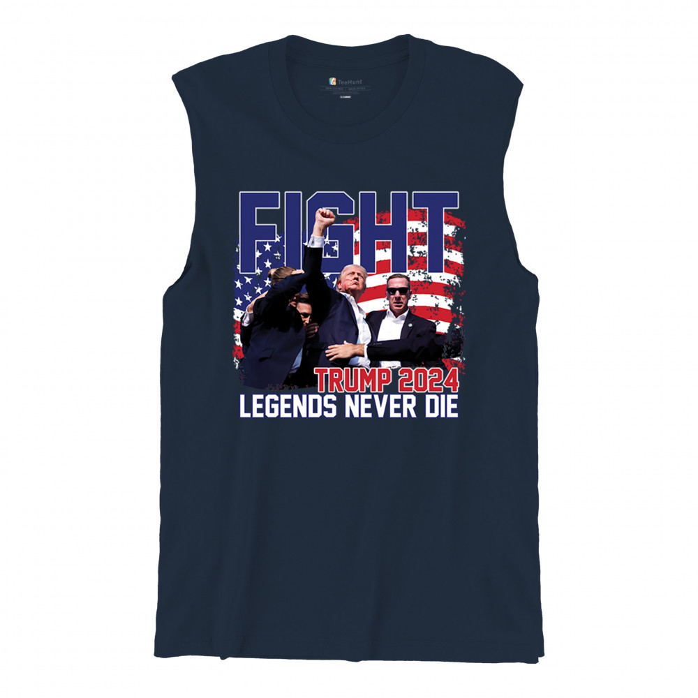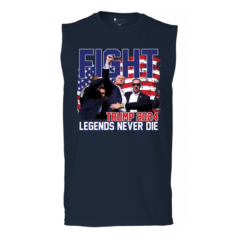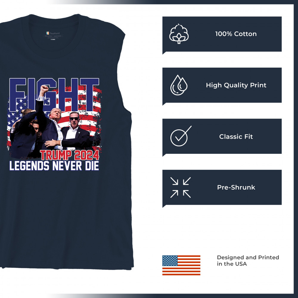 Show your Trump 2024 support with our bold "Fight" design, featuring "Legends Never Die" and a patriotic American flag. Perfect for rallies and everyday wear.