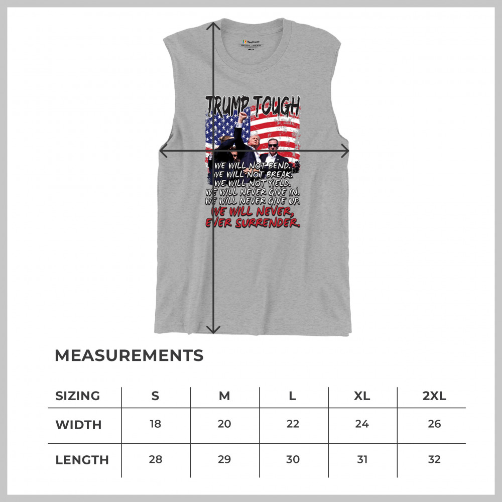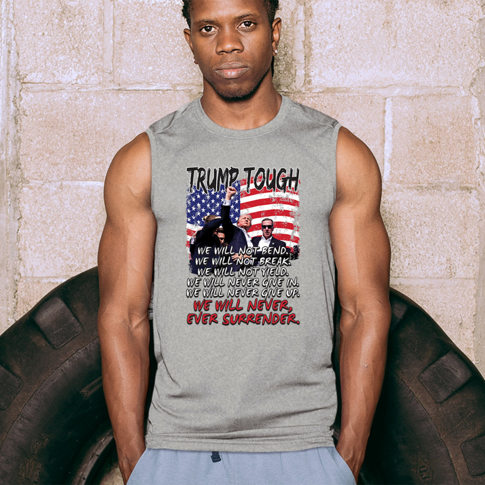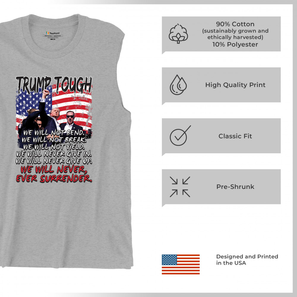 Express your support for Trump 2024 with this bold, patriotic design featuring the American flag and a powerful message. Never surrender your values.