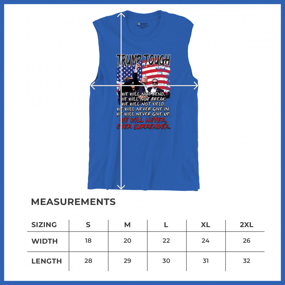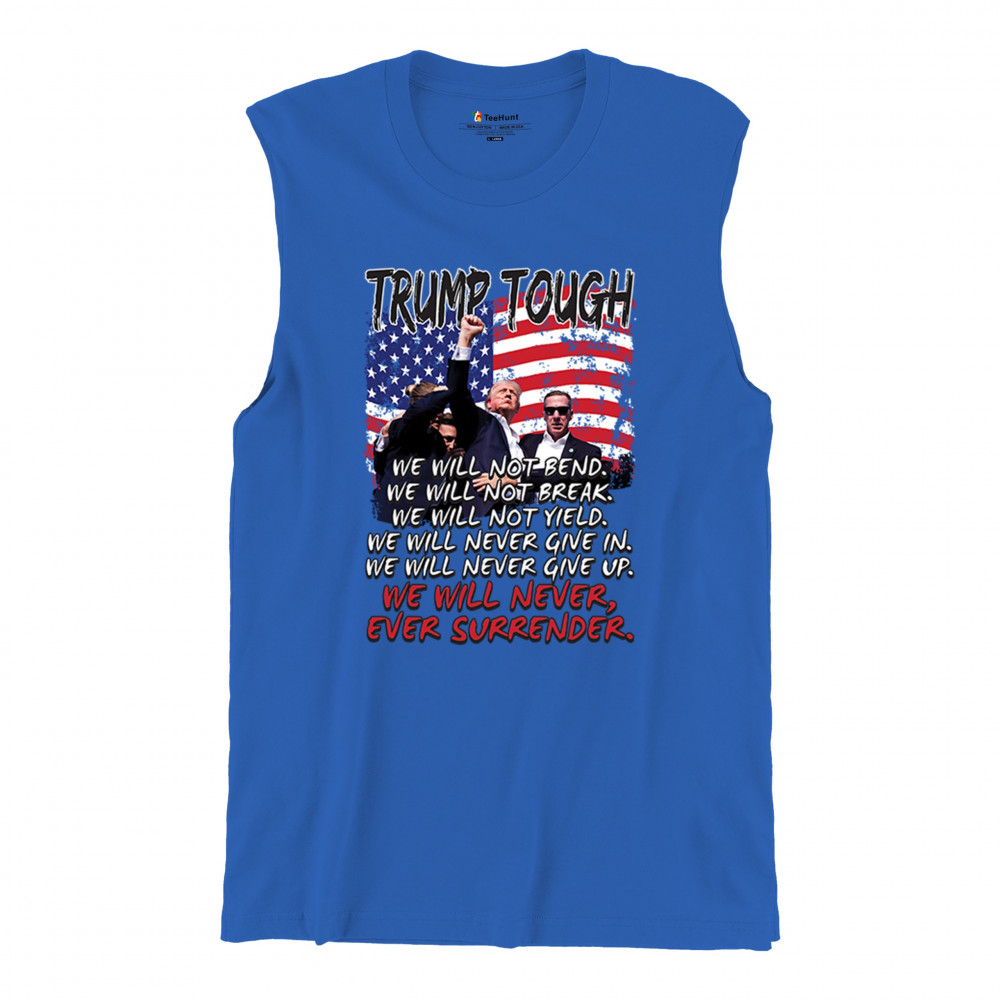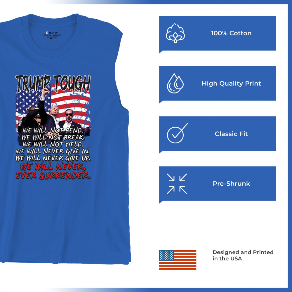 Express your support for Trump 2024 with this bold, patriotic design featuring the American flag and a powerful message. Never surrender your values.