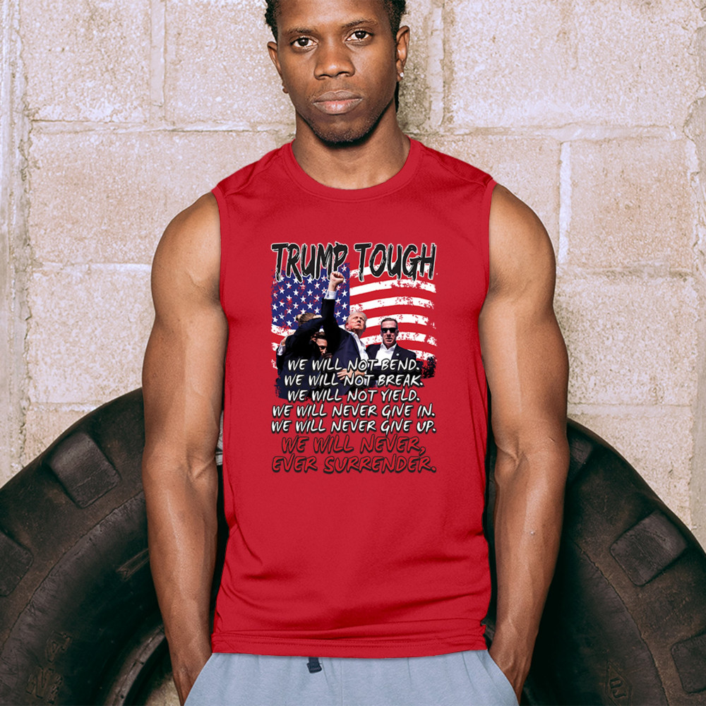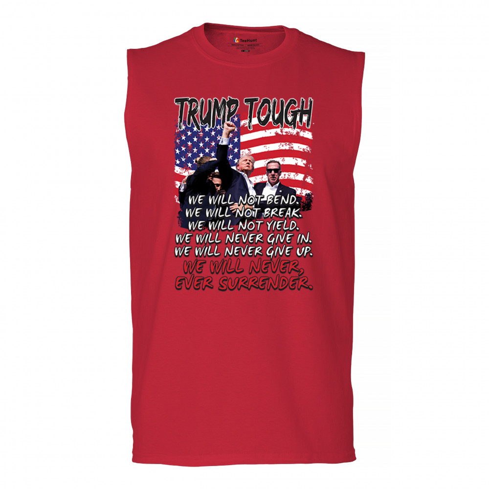 Express your support for Trump 2024 with this bold, patriotic design featuring the American flag and a powerful message. Never surrender your values.