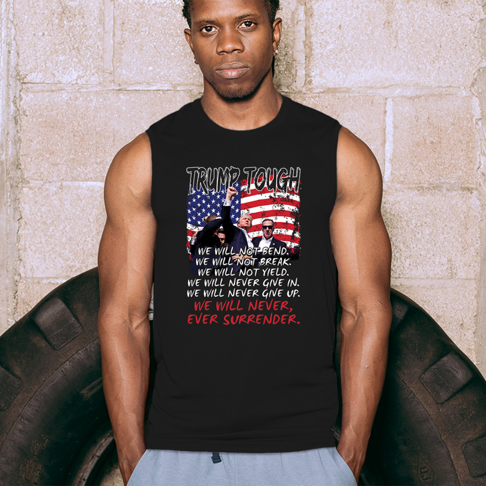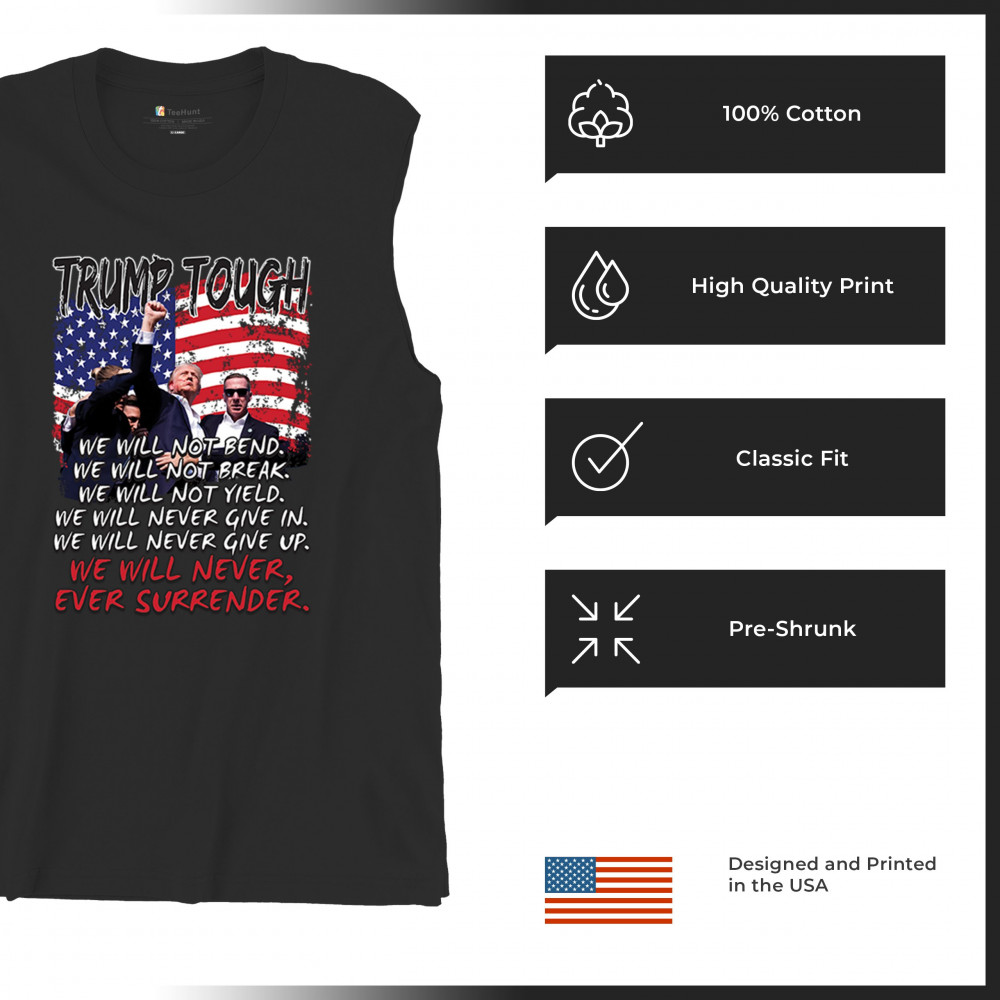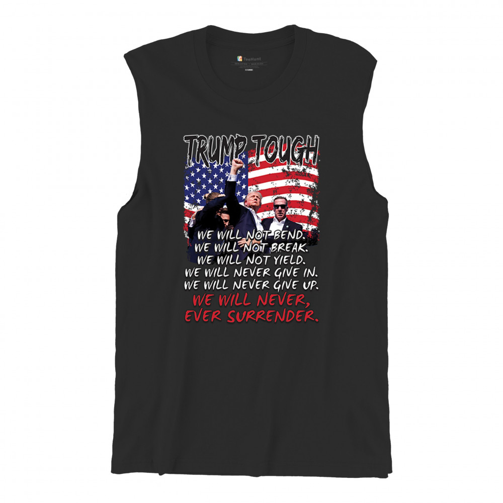 Express your support for Trump 2024 with this bold, patriotic design featuring the American flag and a powerful message. Never surrender your values.