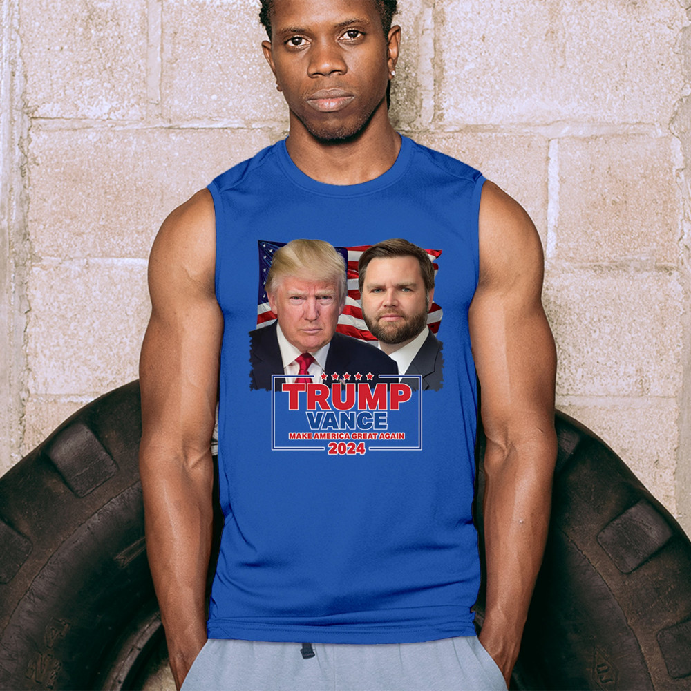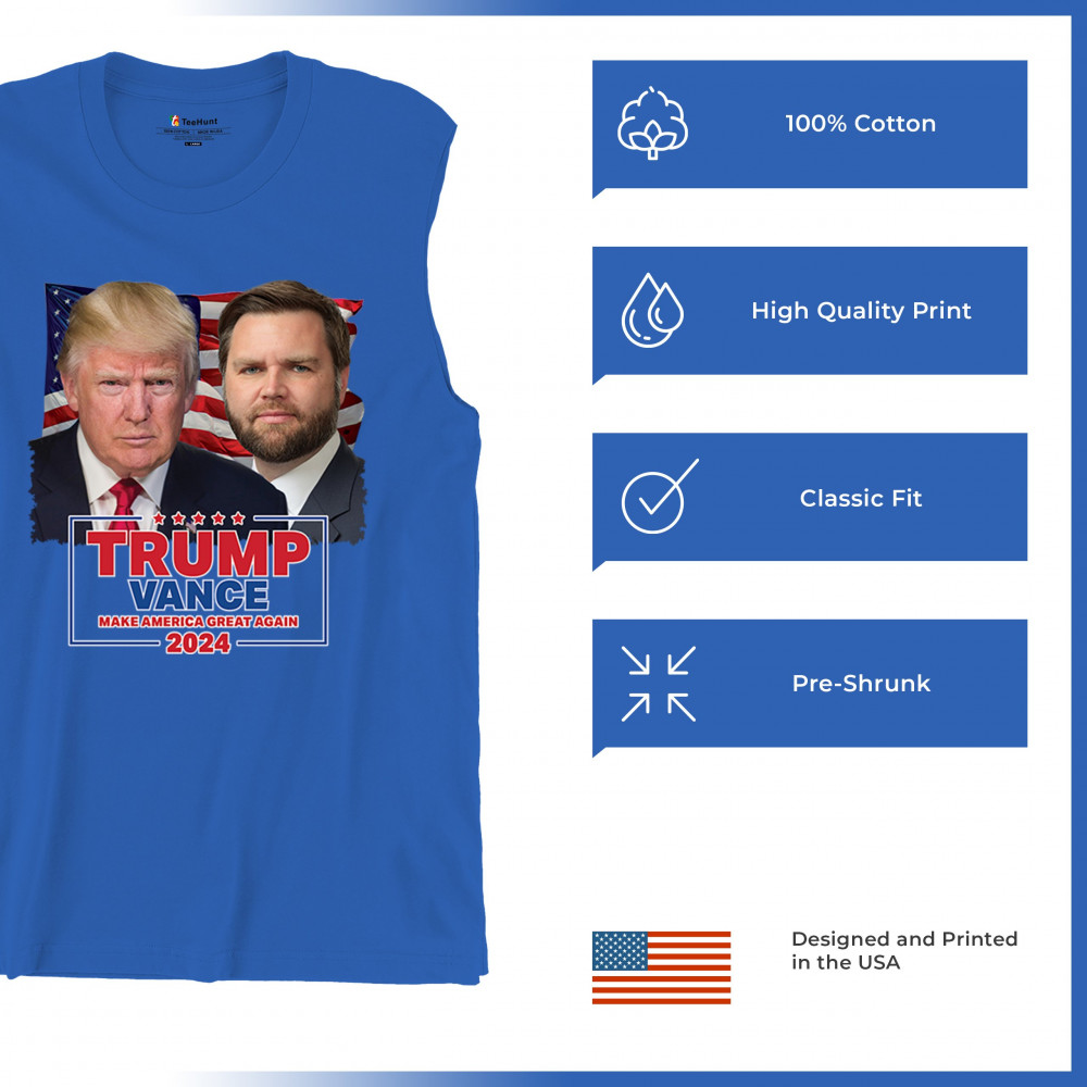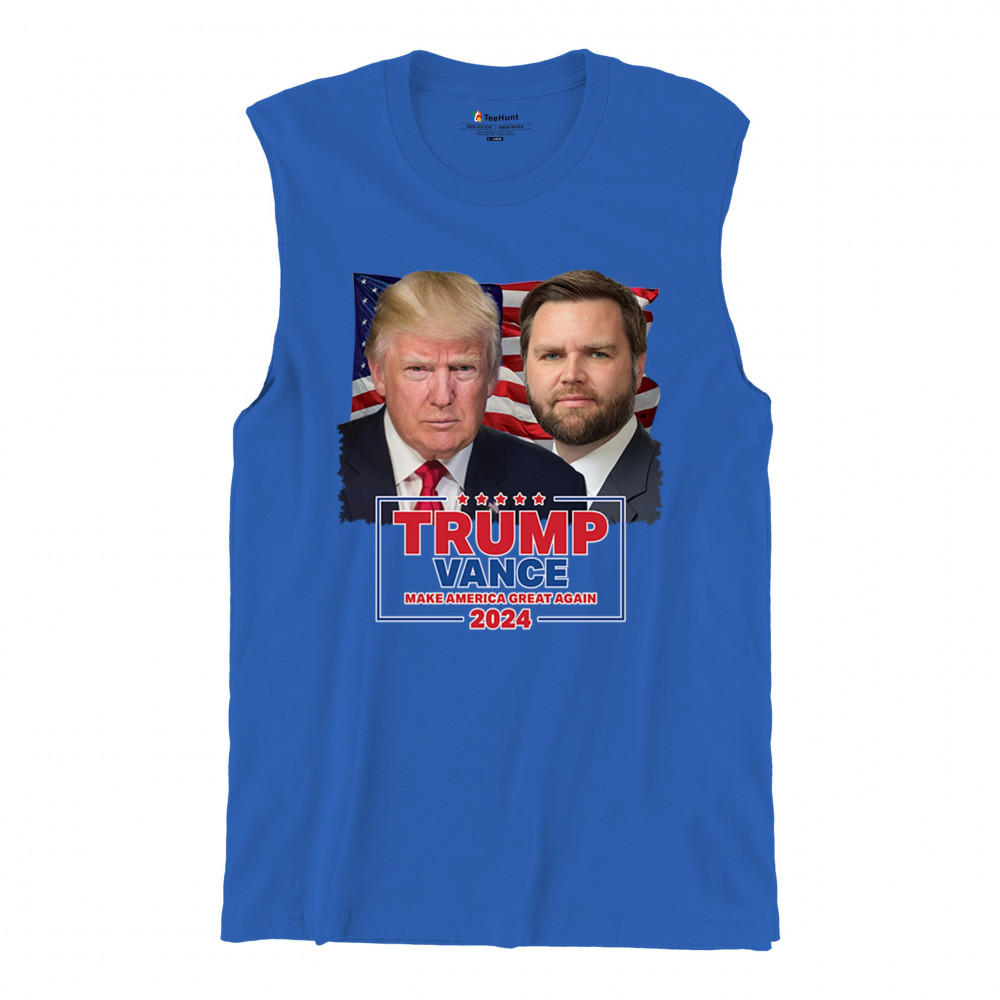 Show your support for Trump-Vance 2024 with this bold design featuring Trump and Vance against the American flag. Perfect for rallies and political events.