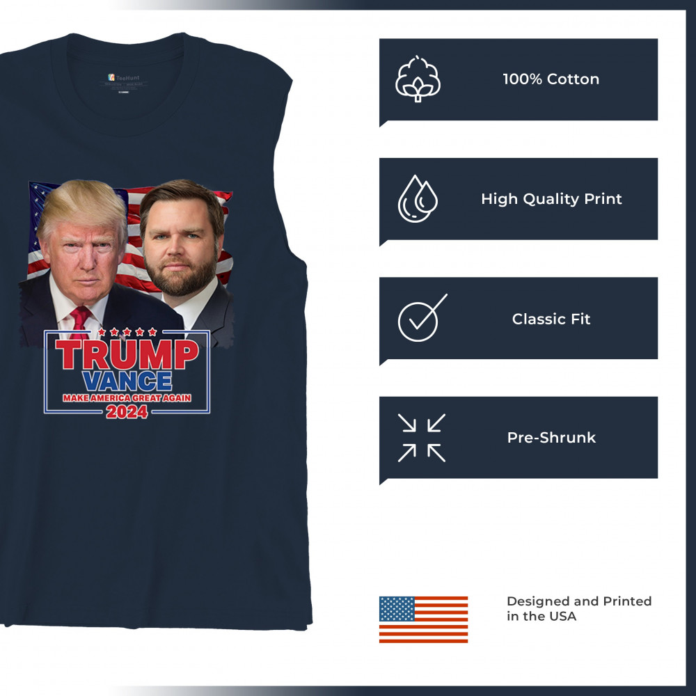 Support the Trump-Vance 2024 campaign with our exclusive design, featuring prominent images of Donald Trump and J.D. Vance set against the American flag. This design is perfect for rallies, political events, and daily wear, showcasing your dedication to the conservative movement. Its bold graphics and patriotic theme make it a standout piece for any supporter. Join the movement and proudly display your support with this dynamic and inspiring design.