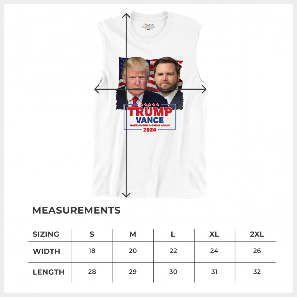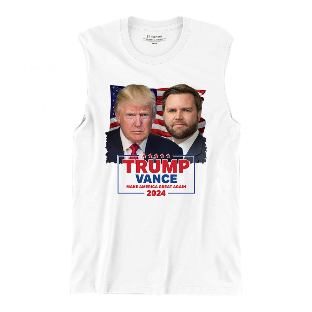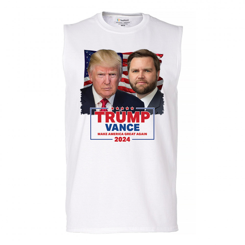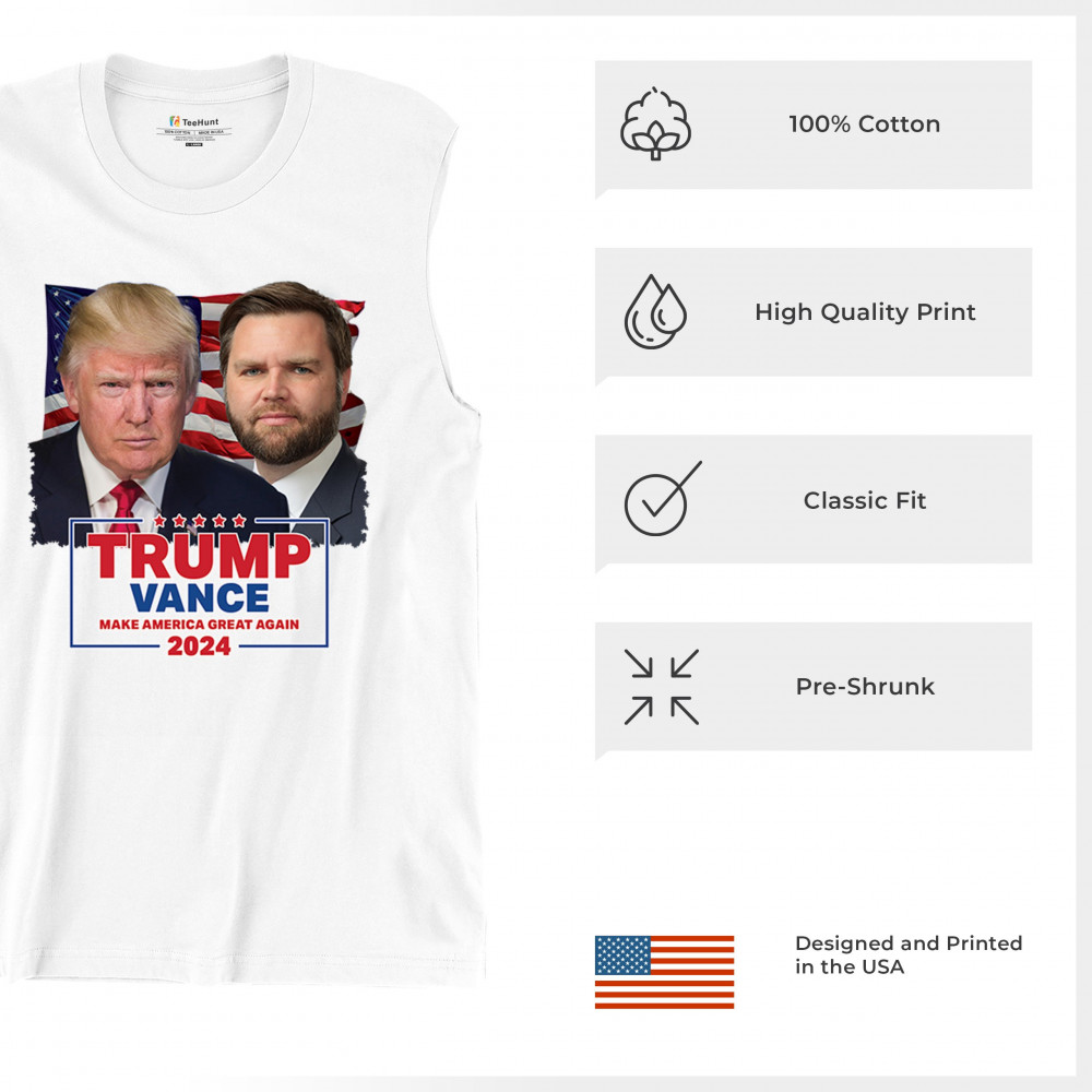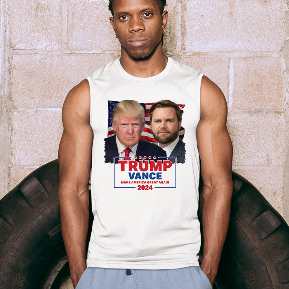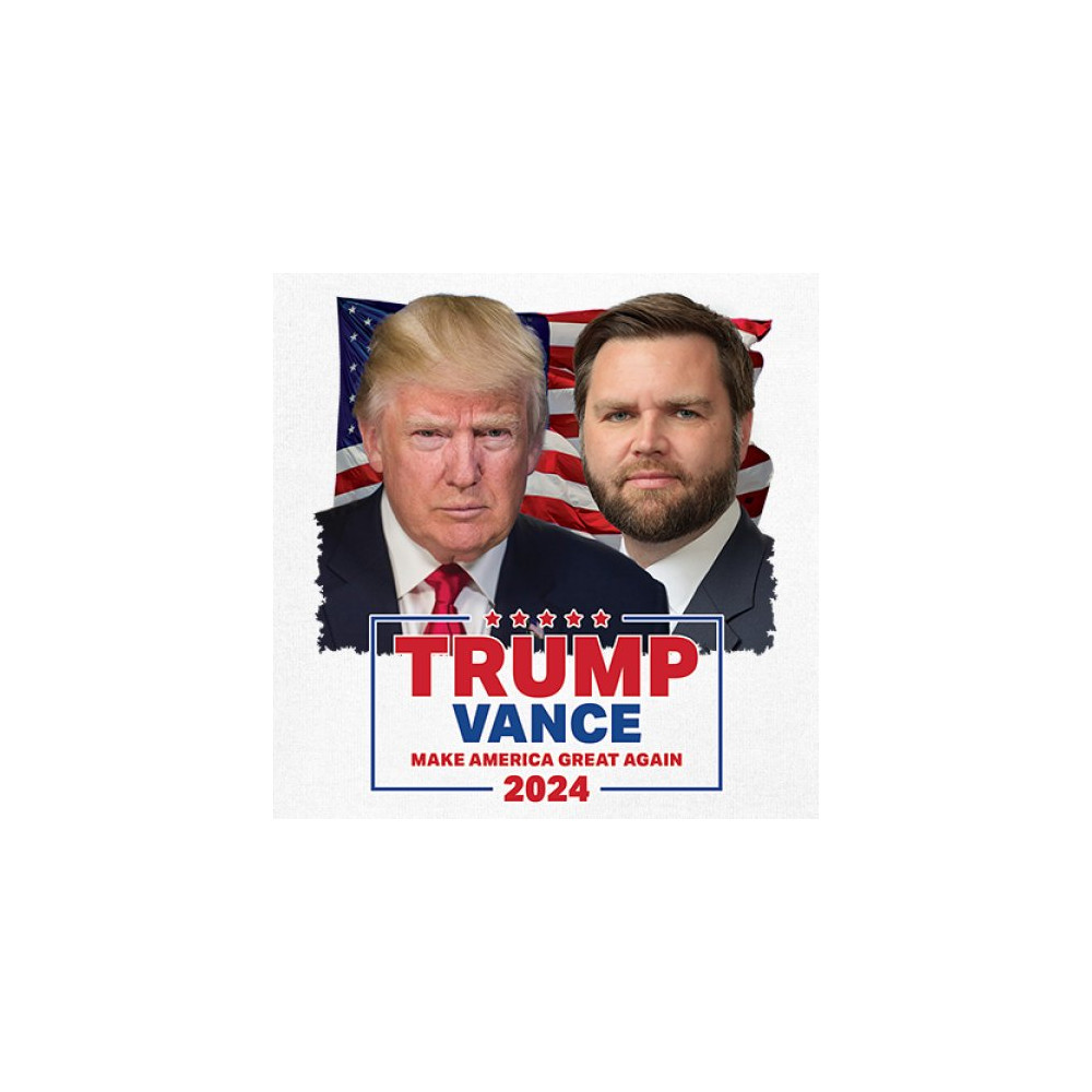 Show your support for Trump-Vance 2024 with this bold design featuring Trump and Vance against the American flag. Perfect for rallies and political events.