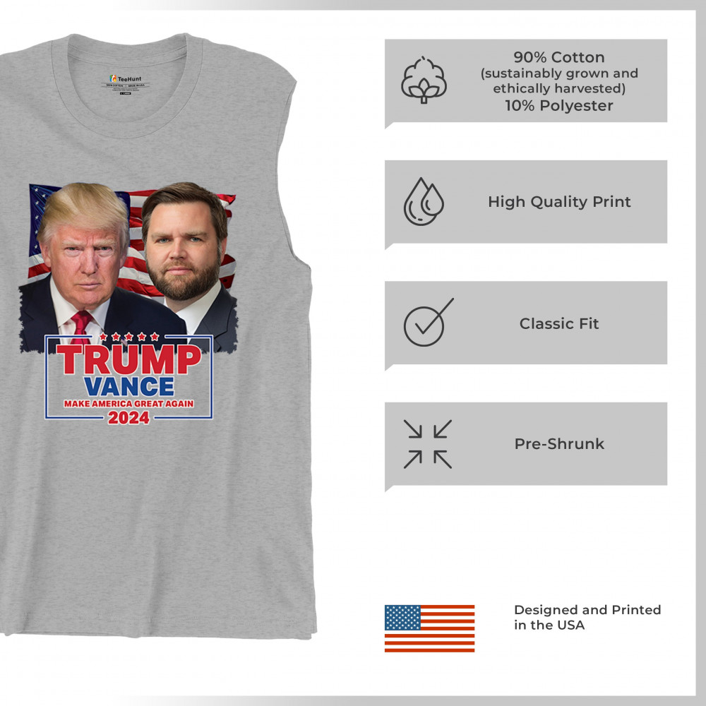 Support the Trump-Vance 2024 campaign with our exclusive design, featuring prominent images of Donald Trump and J.D. Vance set against the American flag. This design is perfect for rallies, political events, and daily wear, showcasing your dedication to the conservative movement. Its bold graphics and patriotic theme make it a standout piece for any supporter. Join the movement and proudly display your support with this dynamic and inspiring design.