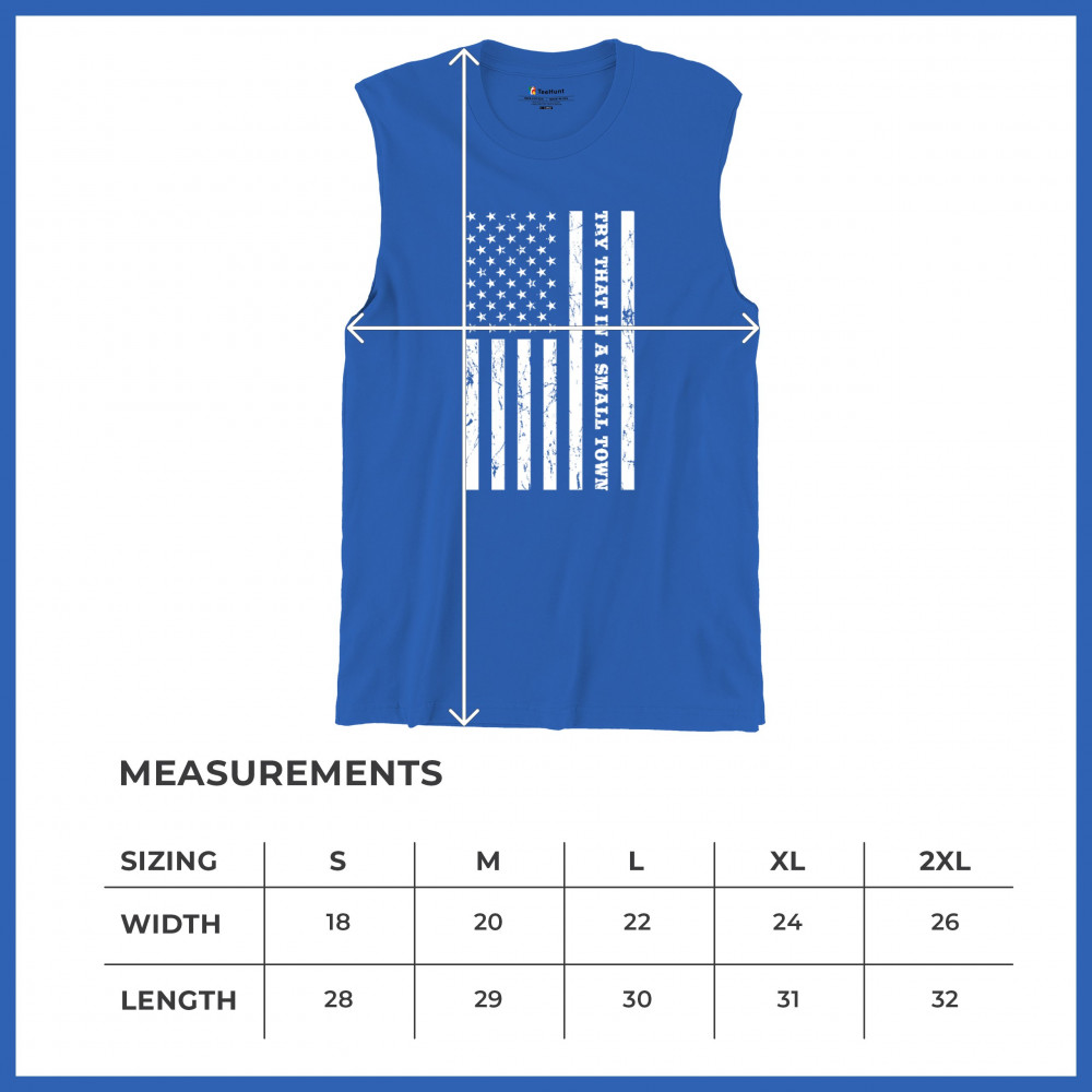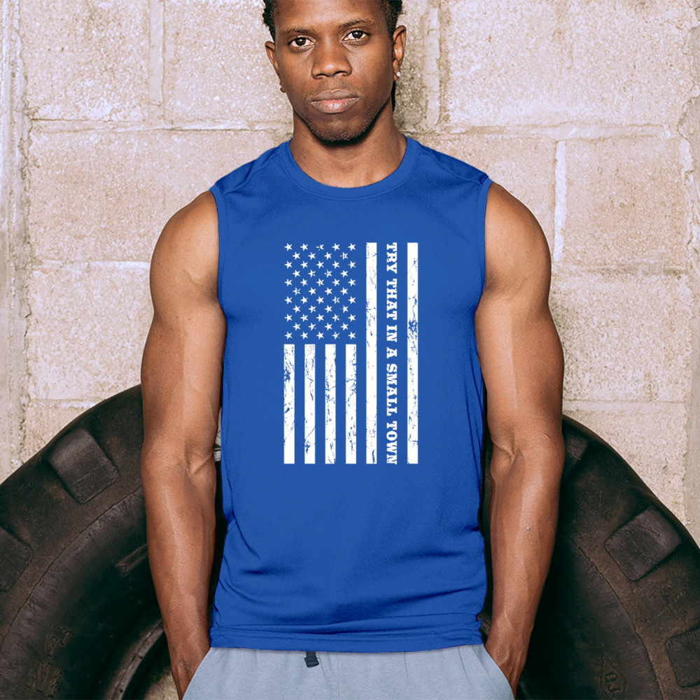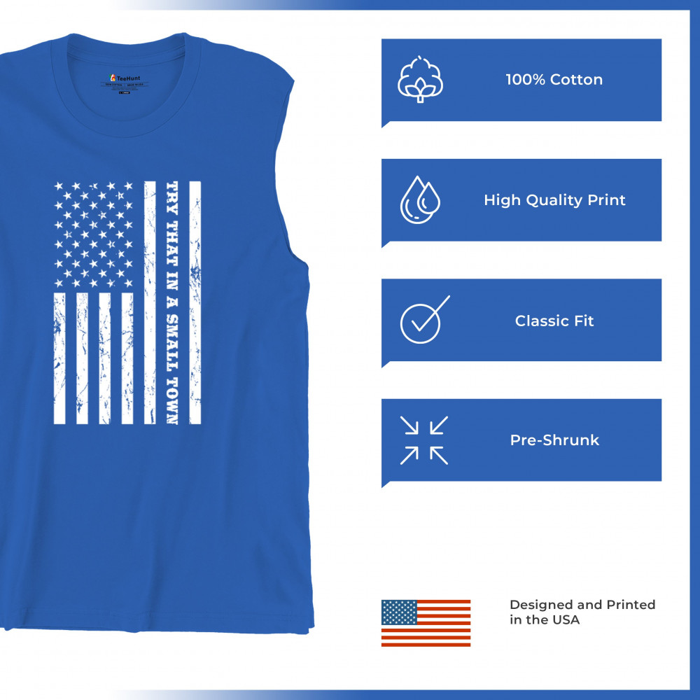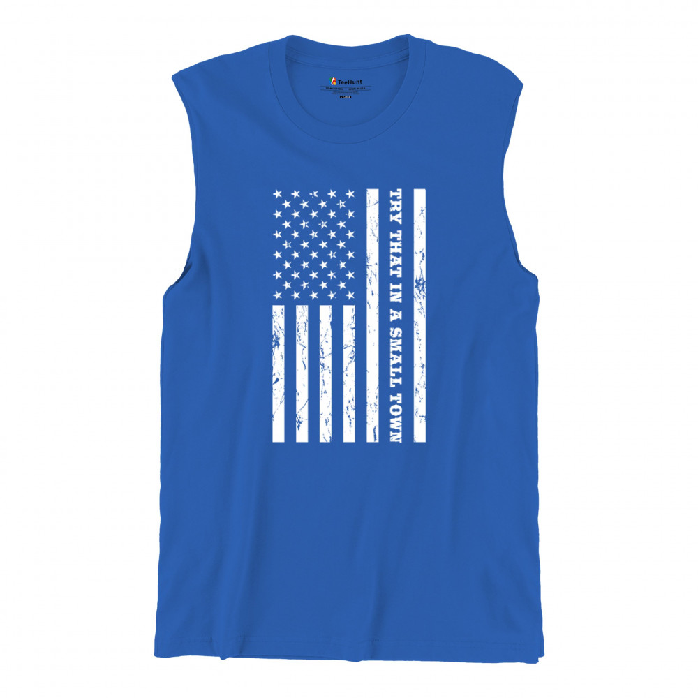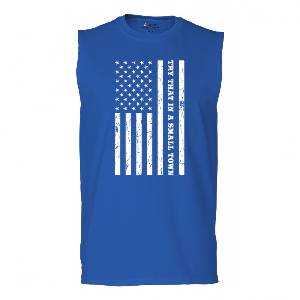 TRY THAT IN A SMALL TOWN GRUNGE AMERICAN FLAG muscle shirt patriotic men's royal blue