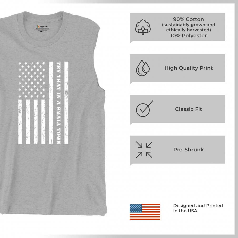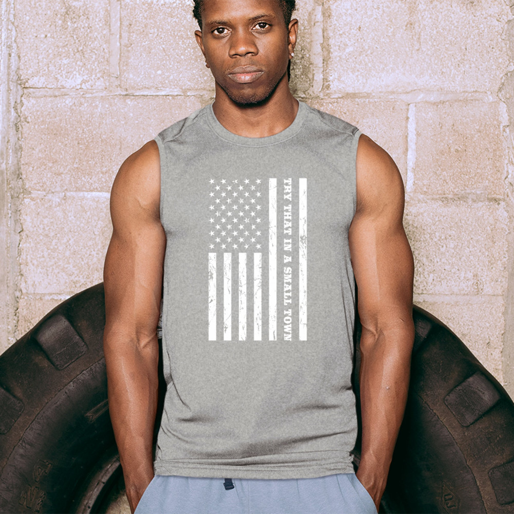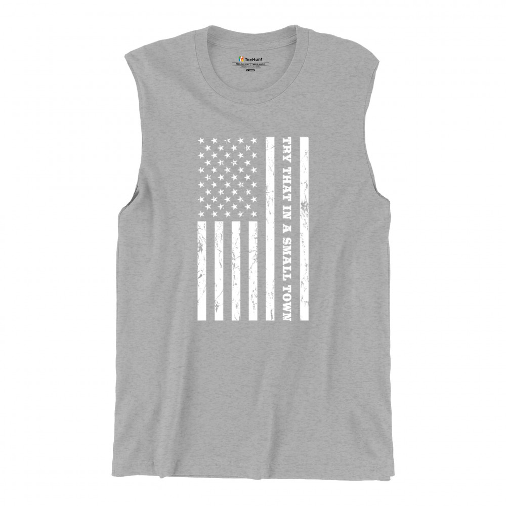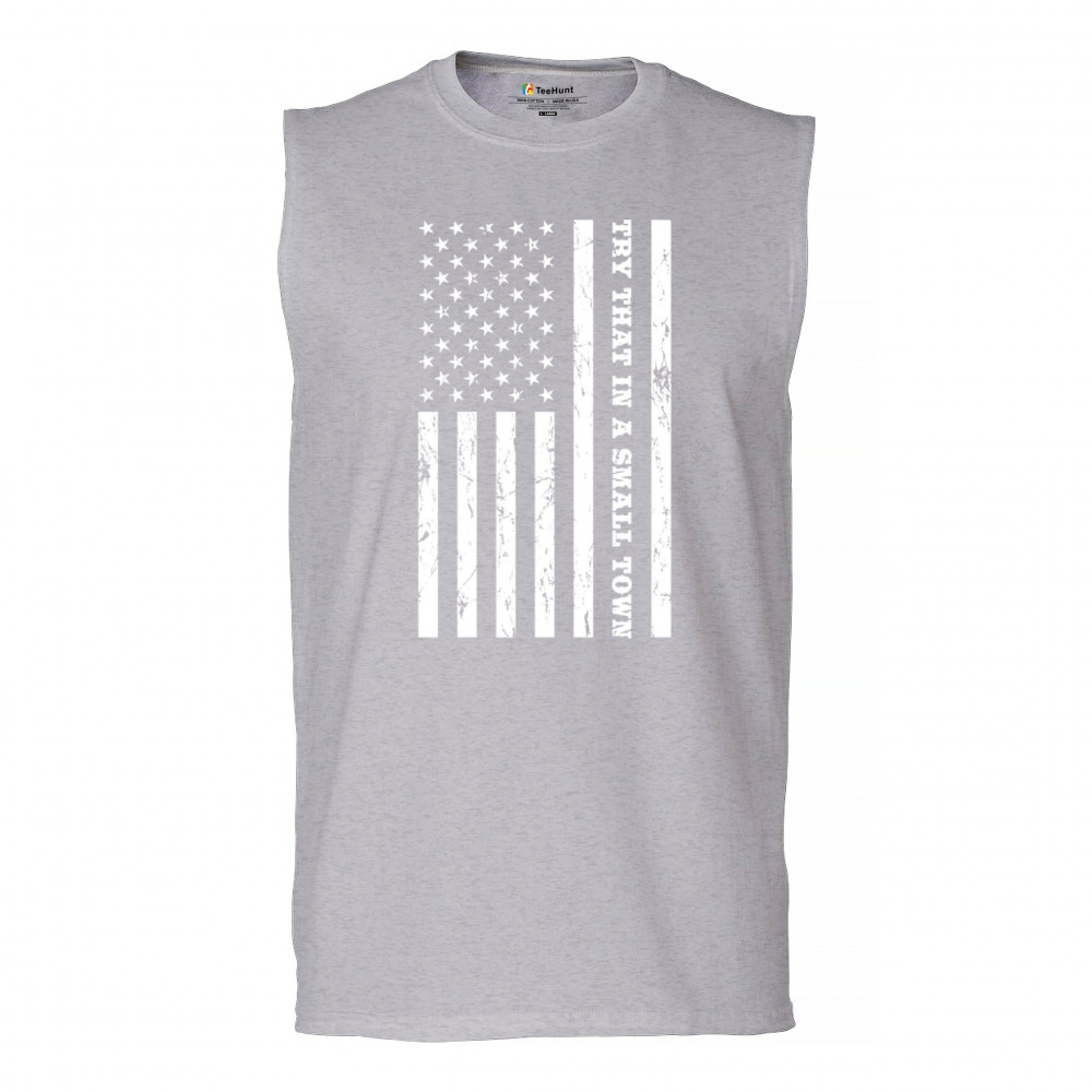 TRY THAT IN A SMALL TOWN GRUNGE AMERICAN FLAG muscle shirt patriotic men's gray