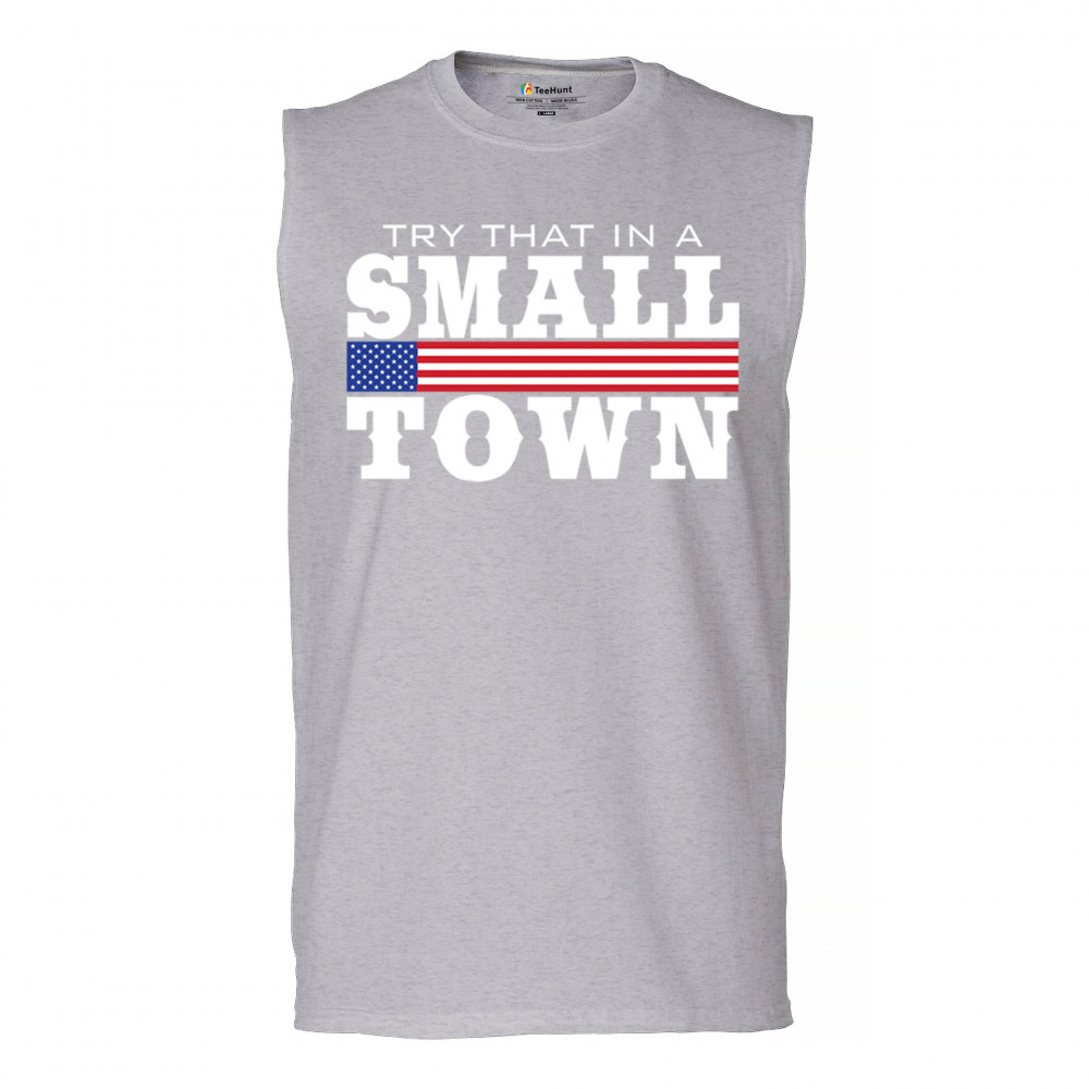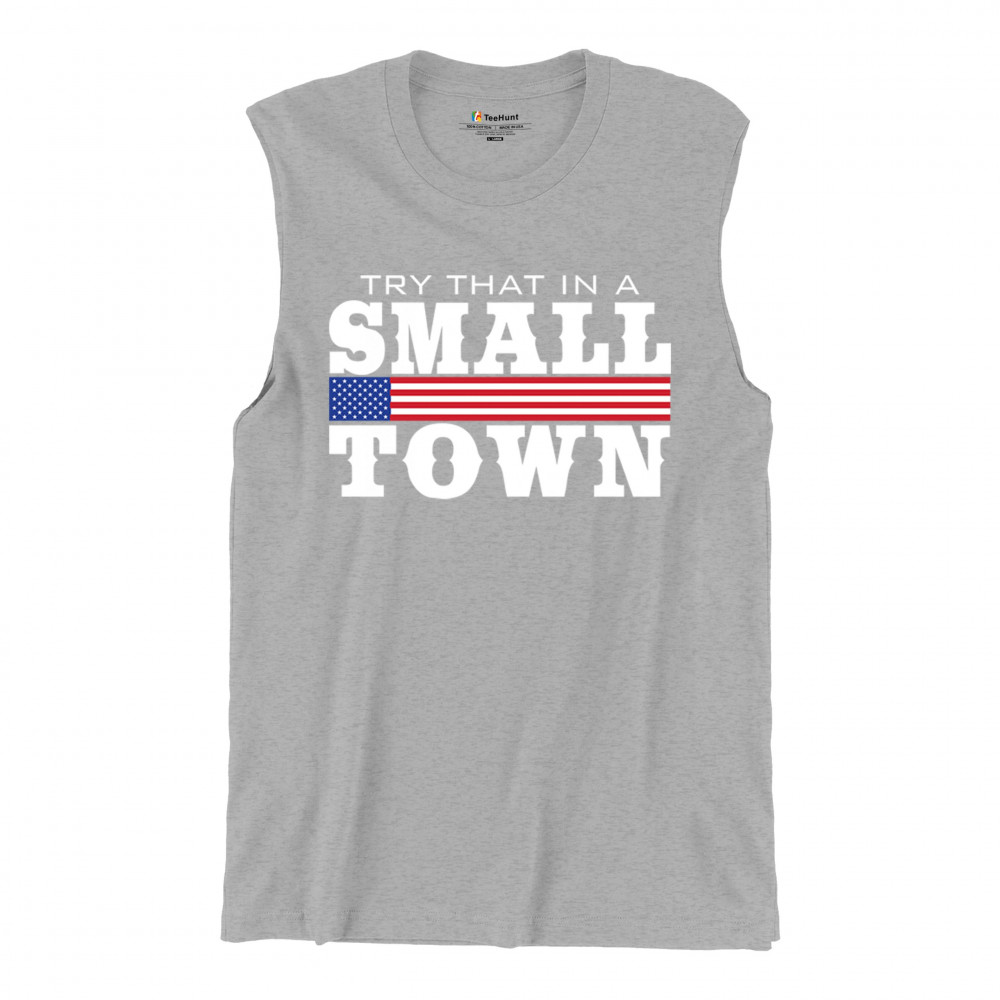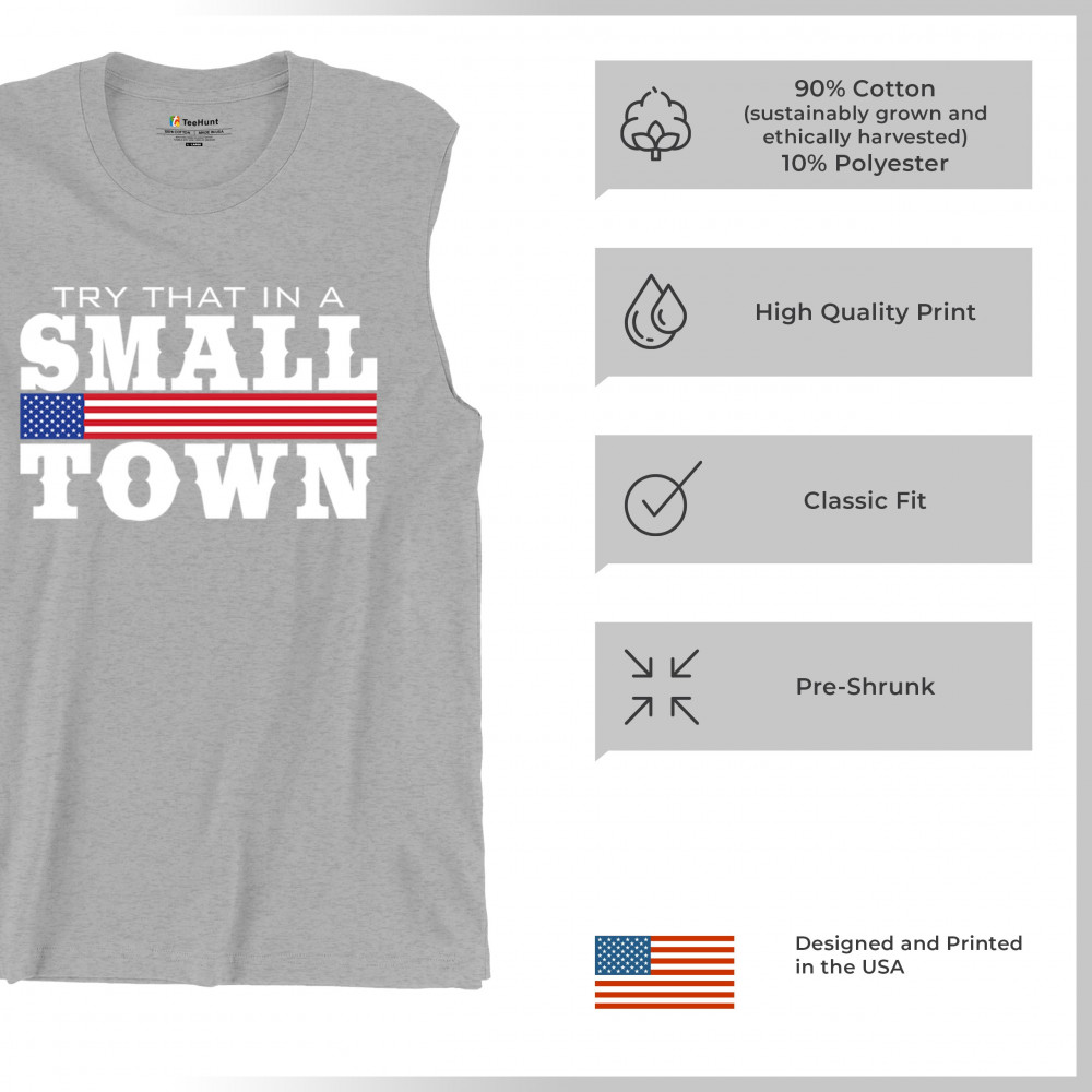 Celebrate small-town pride with our "Try That In A Small Town" design. Perfect for patriotic events, it features a bold American flag graphic.