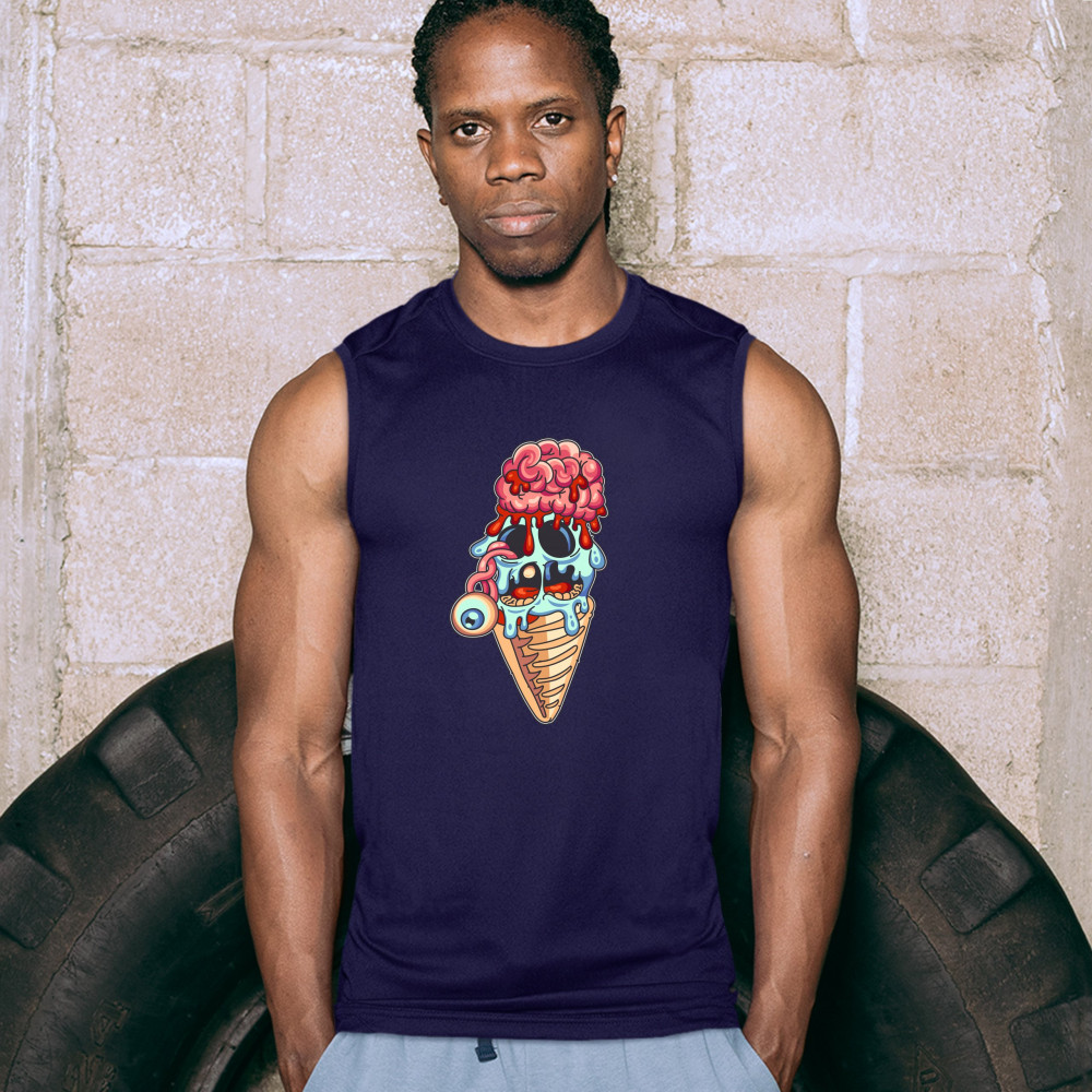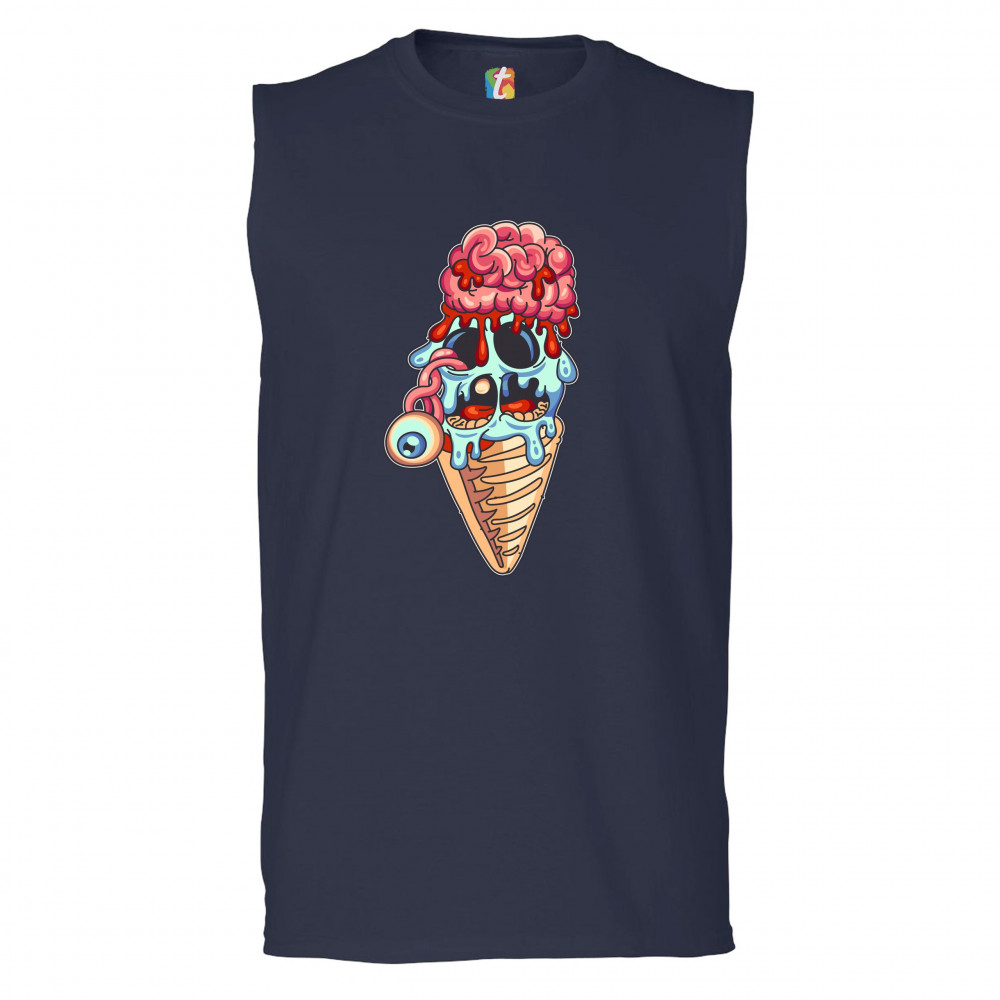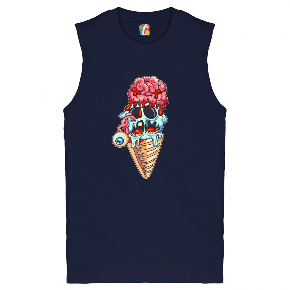 A print featuring an undead ice cream. The ice cream ball looks like a head of a zombie with an eye popping out and hanging and bloodied brains attached on top. A great choice for a person who is into horror movies, haunted houses and freaking people out!