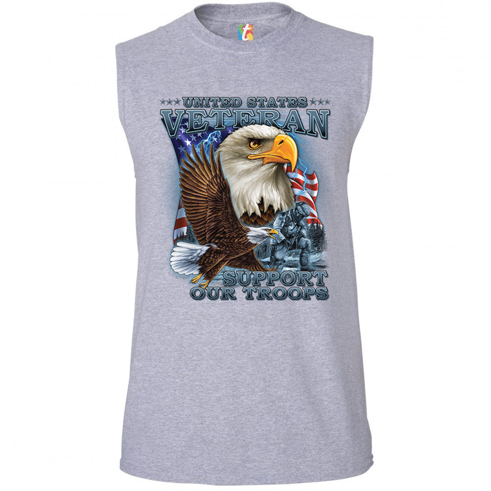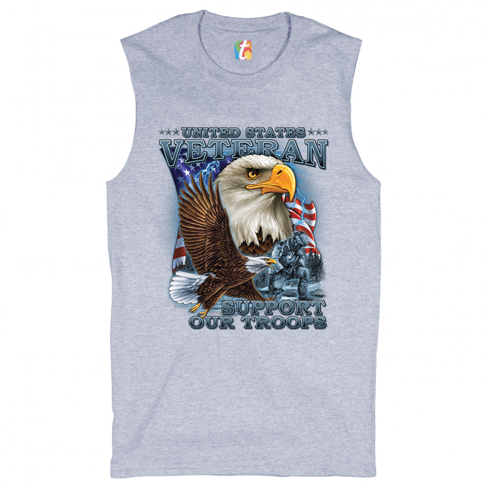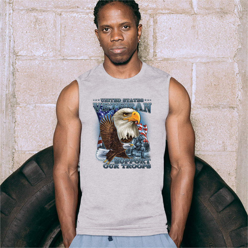 A patriotic print featuring a flying American bald eagle. There is another bald eagle covering most of the American flag in the background. There is a kneeling soldier in the front. The print says: "United States Veteran, Support our Troops". A great choice for a true patriot of the USA