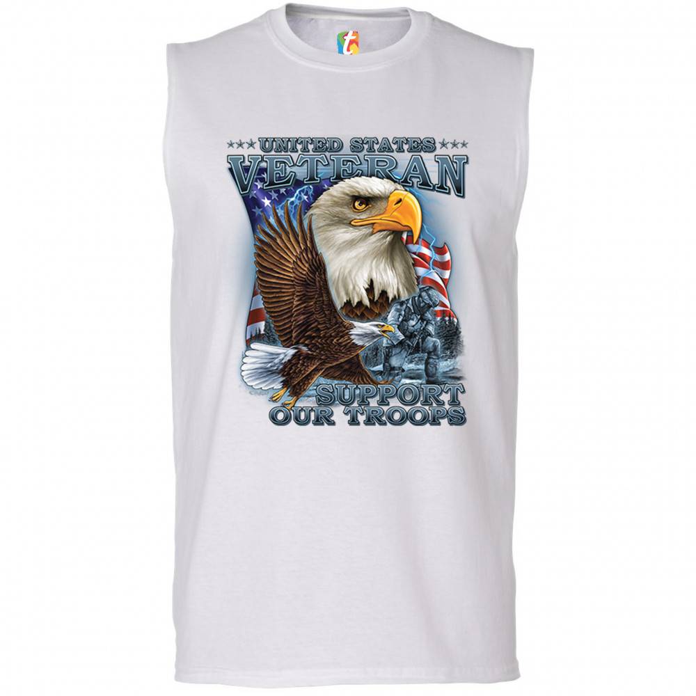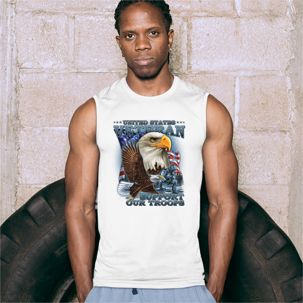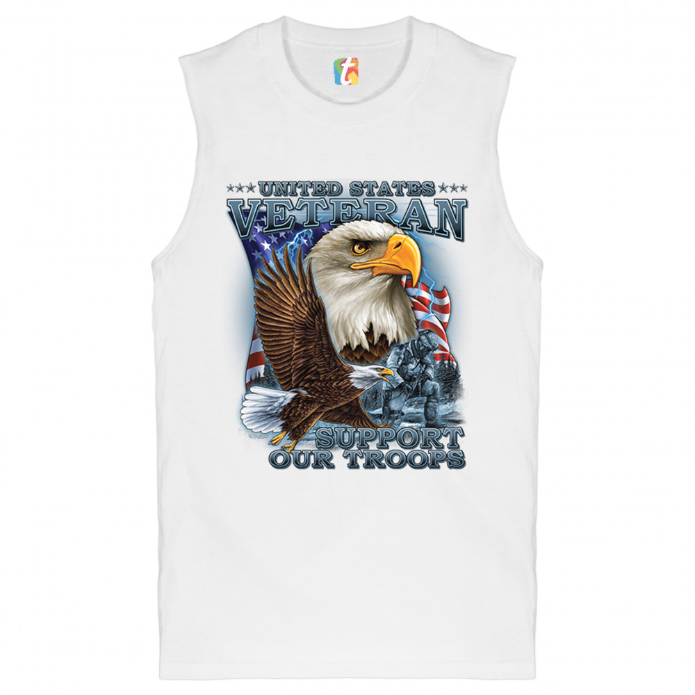 A patriotic print featuring a flying American bald eagle. There is another bald eagle covering most of the American flag in the background. There is a kneeling soldier in the front. The print says: "United States Veteran, Support our Troops". A great choice for a true patriot of the USA